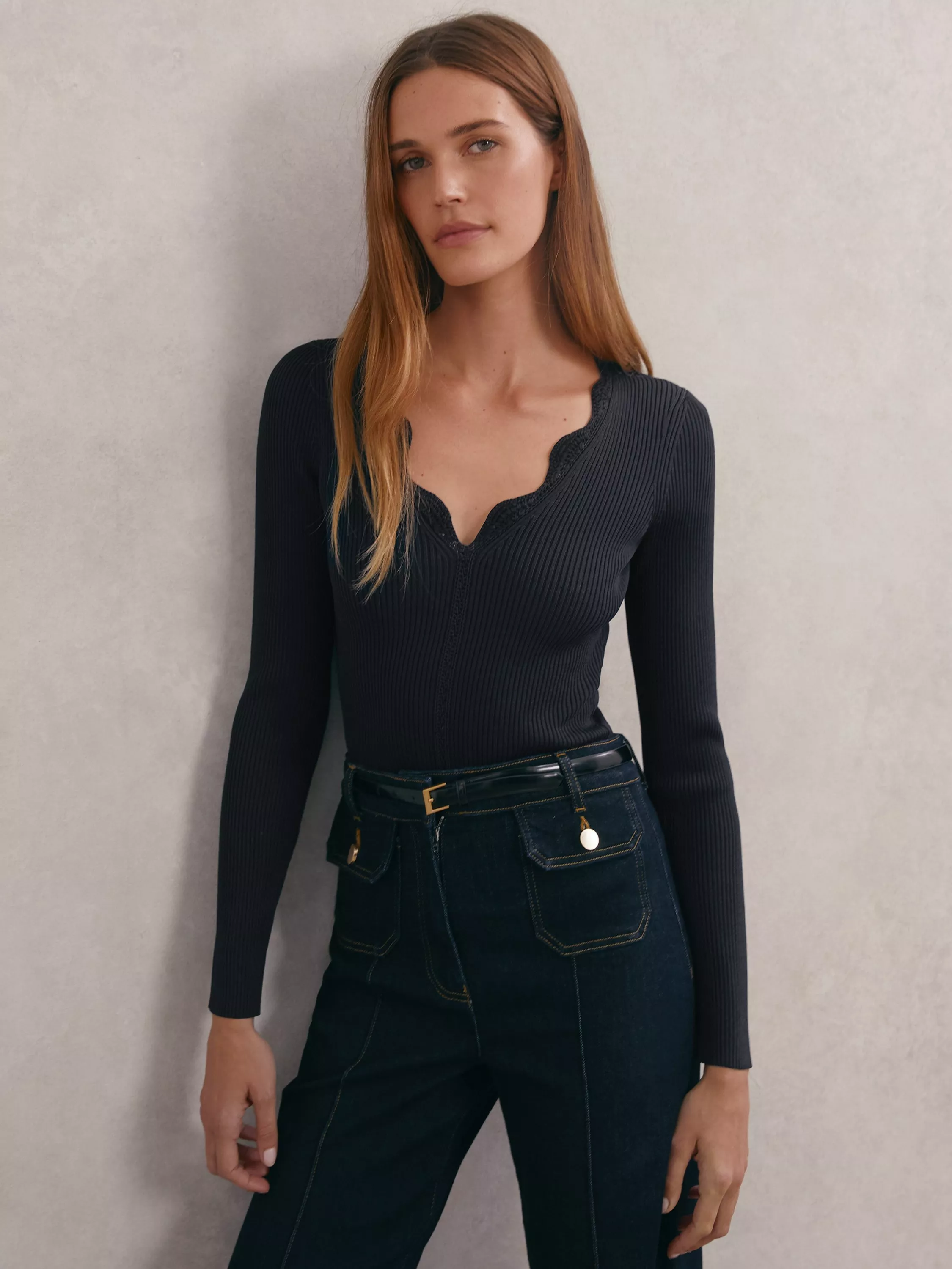 This fine jumper adds a refined touch to your day. Its slim cut fits neatly under layers, finished with a scallop edge V-neckline.