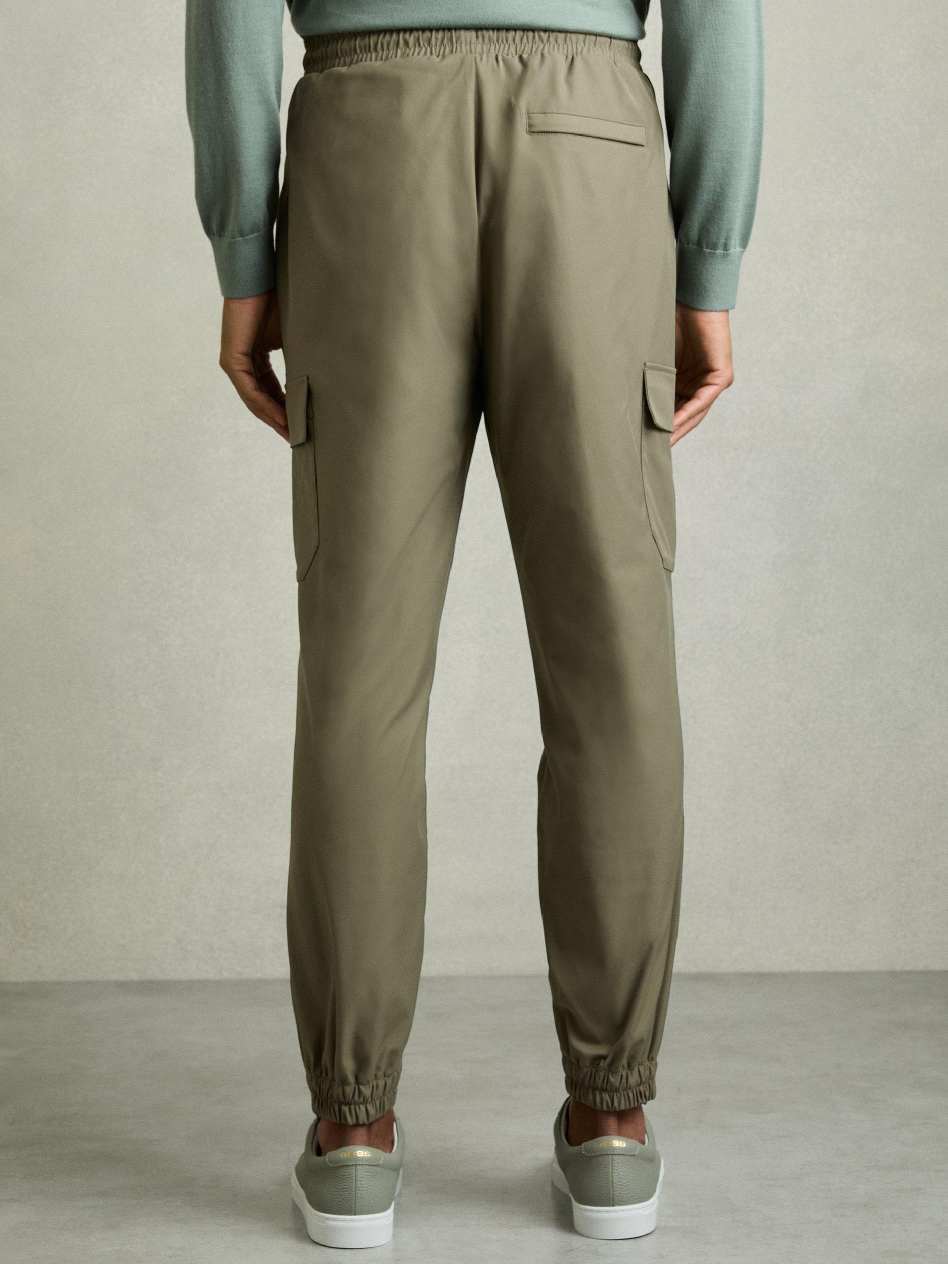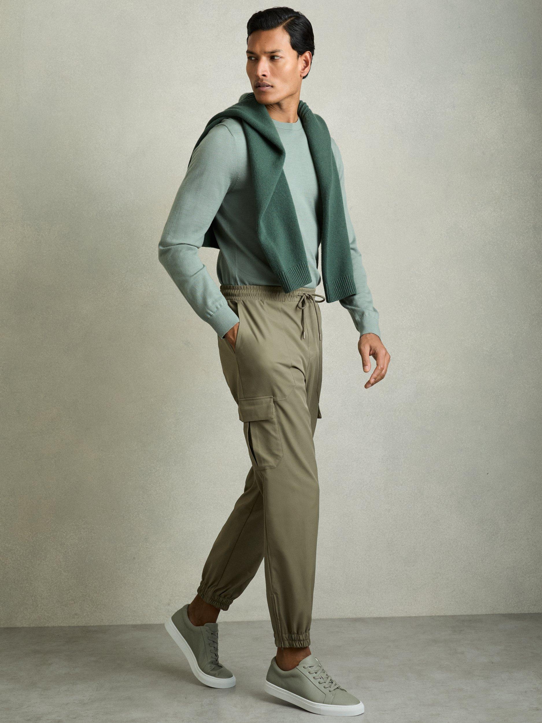 A crease-repellent technical stretch fabric is chosen for the stone Lavenham trousers from Reiss. Multiple pockets, a drawstring waist, and cuffed ankles are added. Zips expand the ankles for a slightly looser fit.