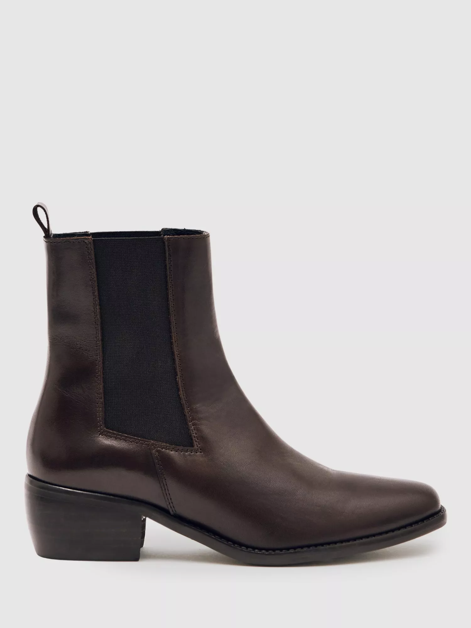 Reiss ankle chelsea boots, crafted in supple leather with an almond toe and sturdy block heel. The mid-height heel provides lift for everyday outings while the elastic sides make slipping them on a breeze.