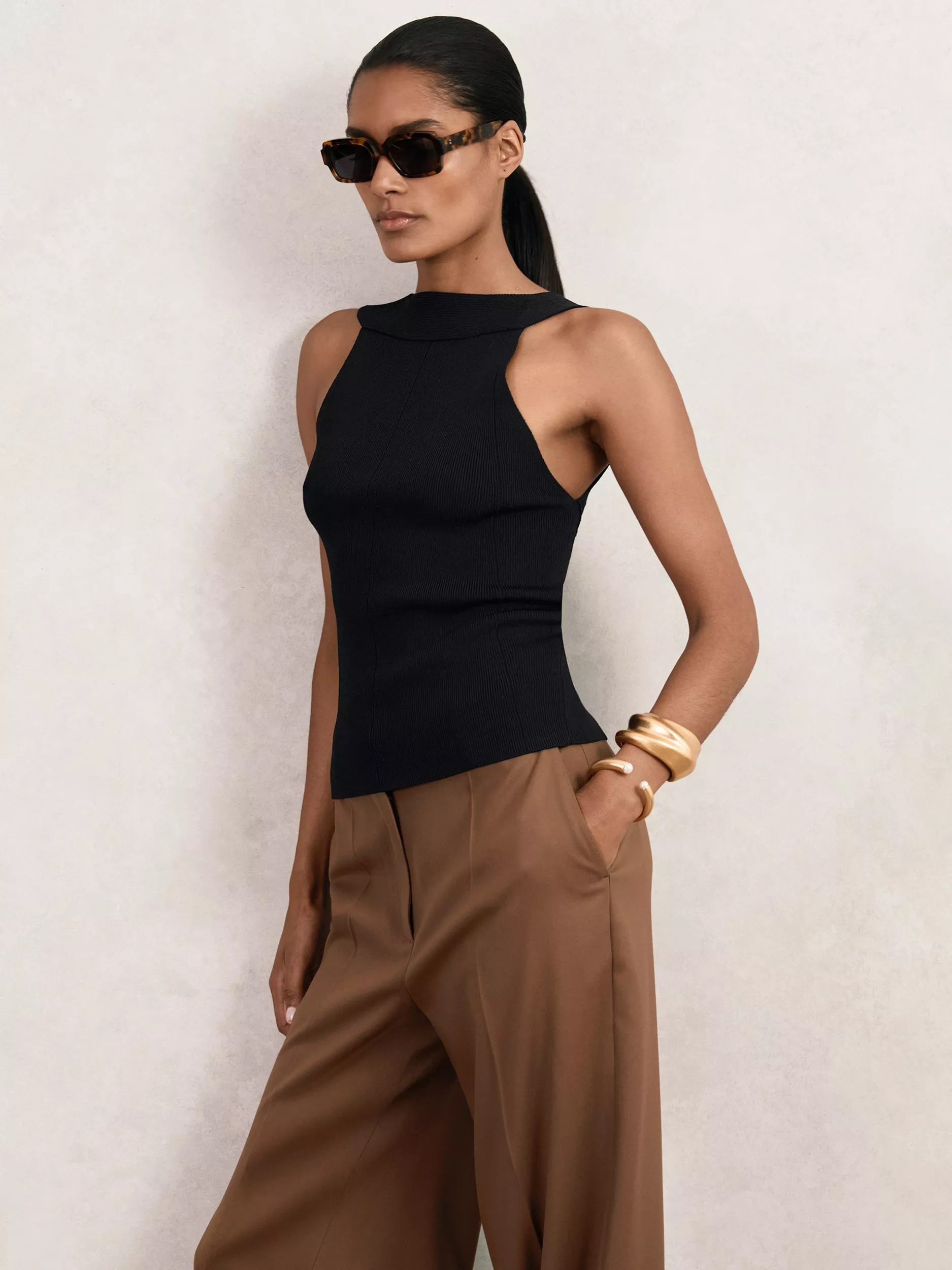 A high neck vest top, blending ease with a sharp silhouette. Its clever cut and square back flatters, perfect for lively gatherings or sunny days out.