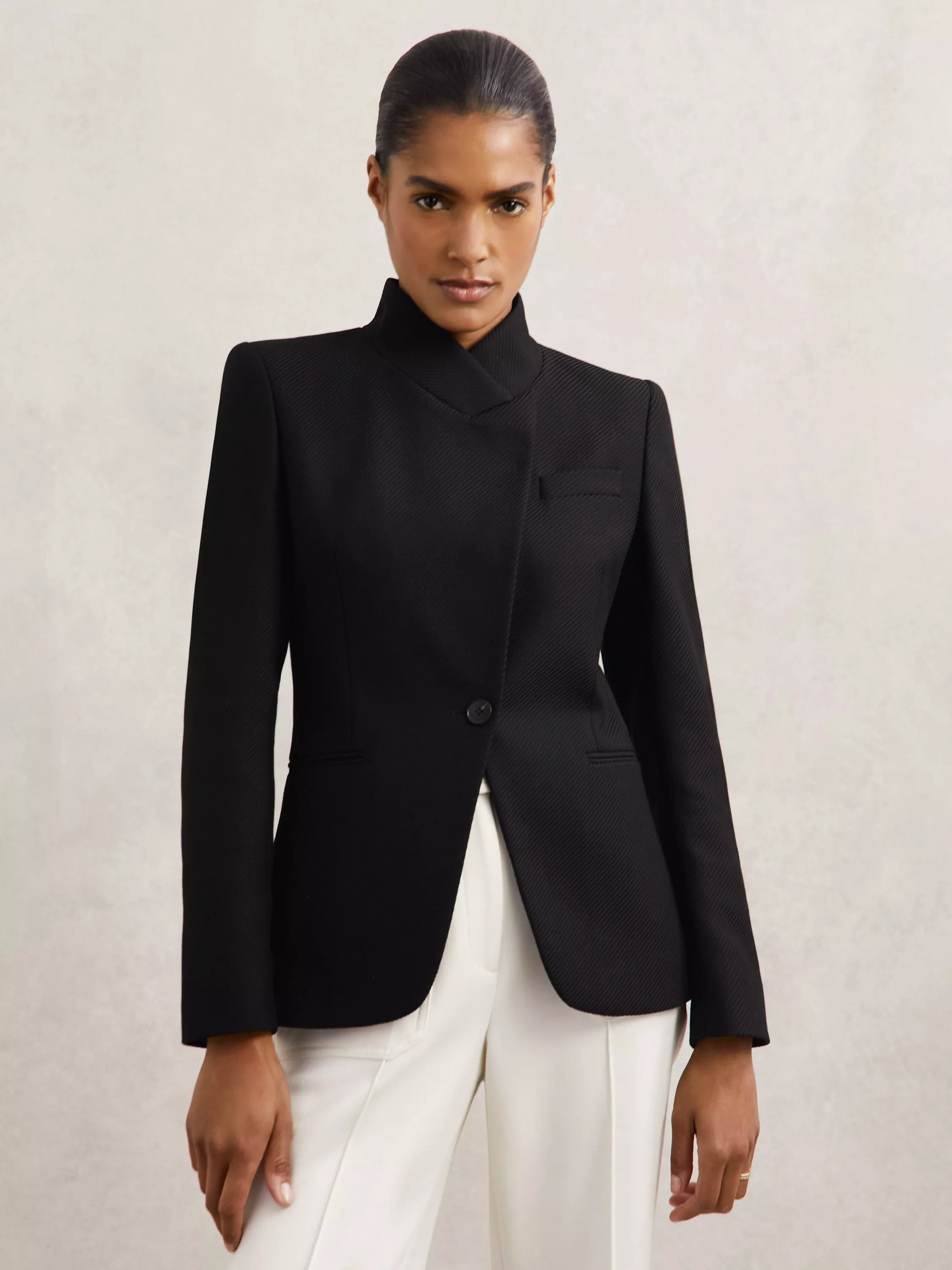 This single-breasted blazer offers a tailored fit and refined high neck, blending smart utility design with comfort so you feel ready for whatever your day brings.