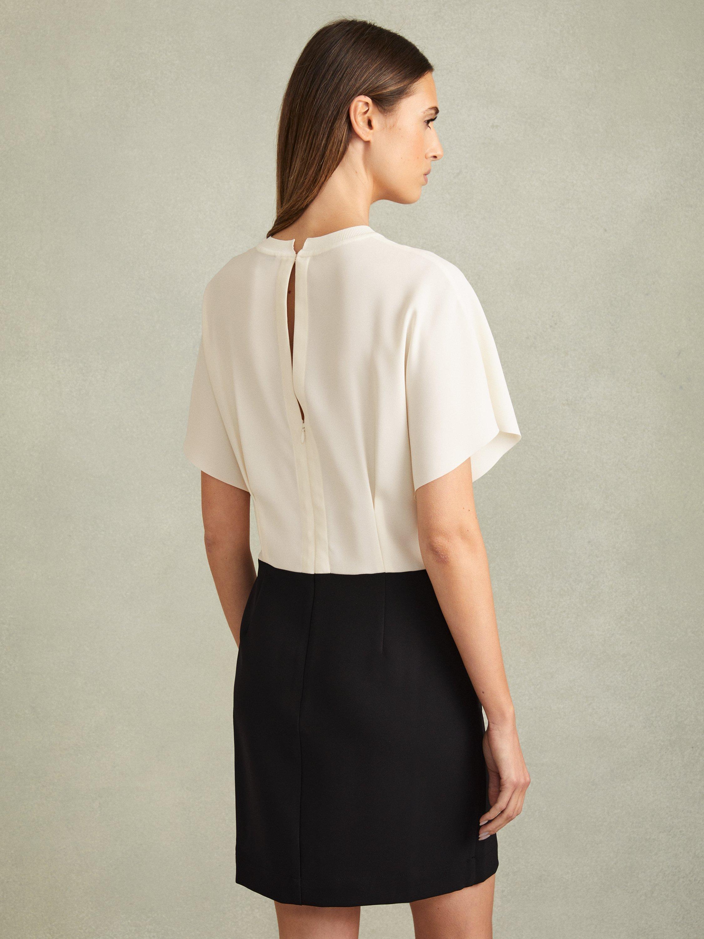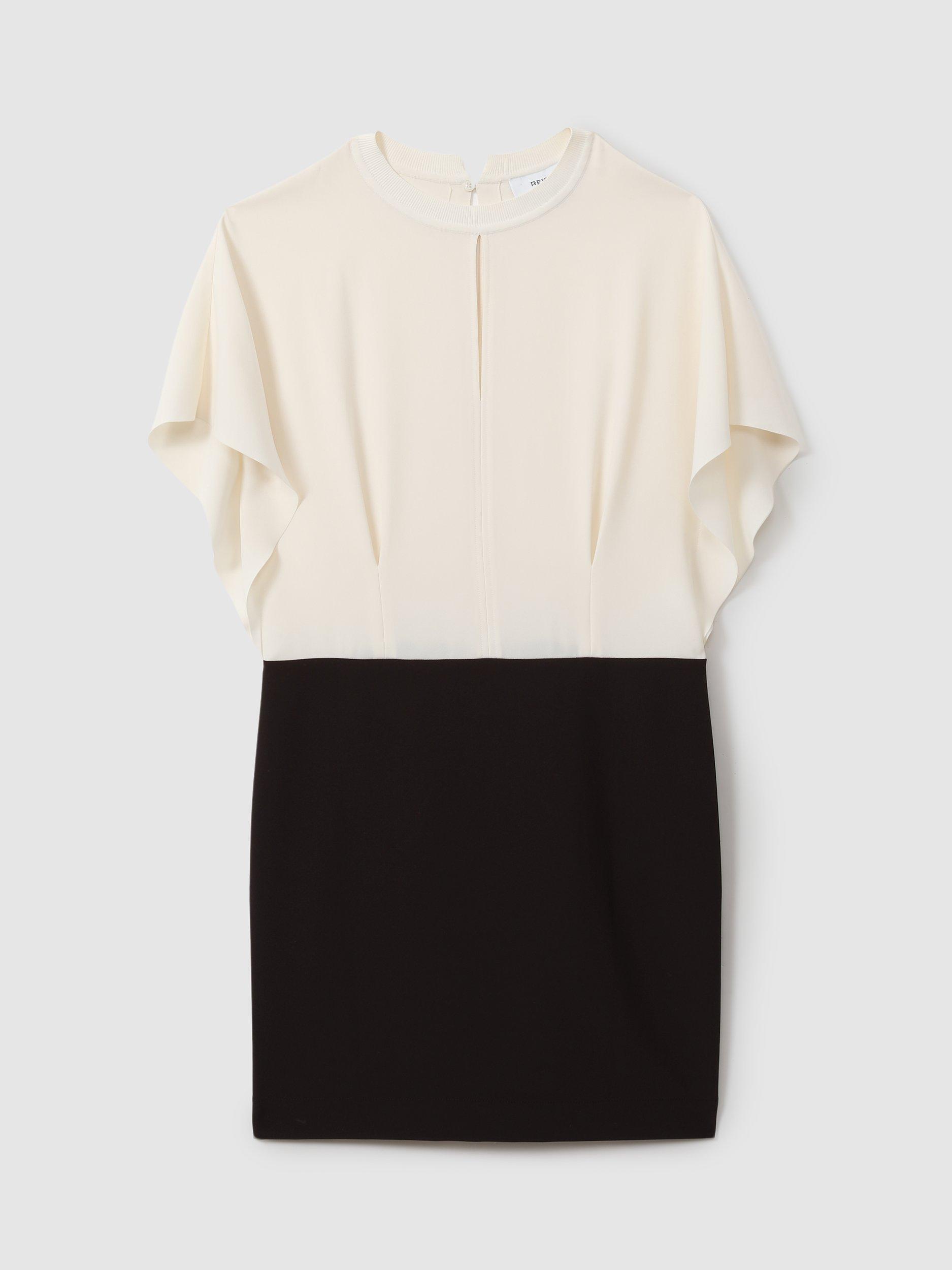 Cut to an iconic shift silhouette, this mini dress from Reiss is crafted from a blend of fabrics. Defined with a conventional round neckline and batwing sleeves, this style is dominated by monochromatic colour blocking.