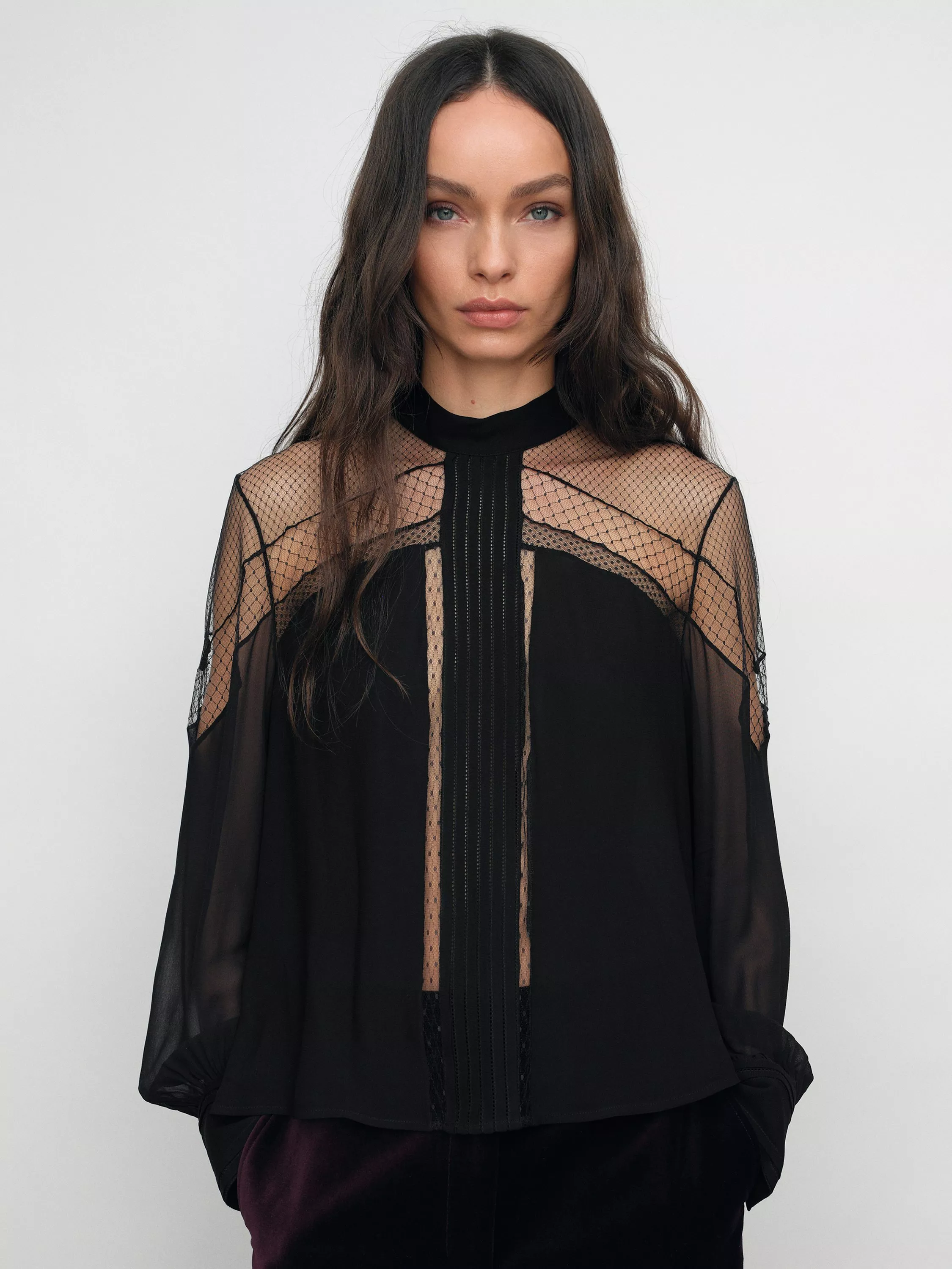 A blouse by Reiss, made from a soft viscose blend. Featuring a high neck and long sleeves, it is fashioned with intricate lace detailing. Effortless style for daily dressing.