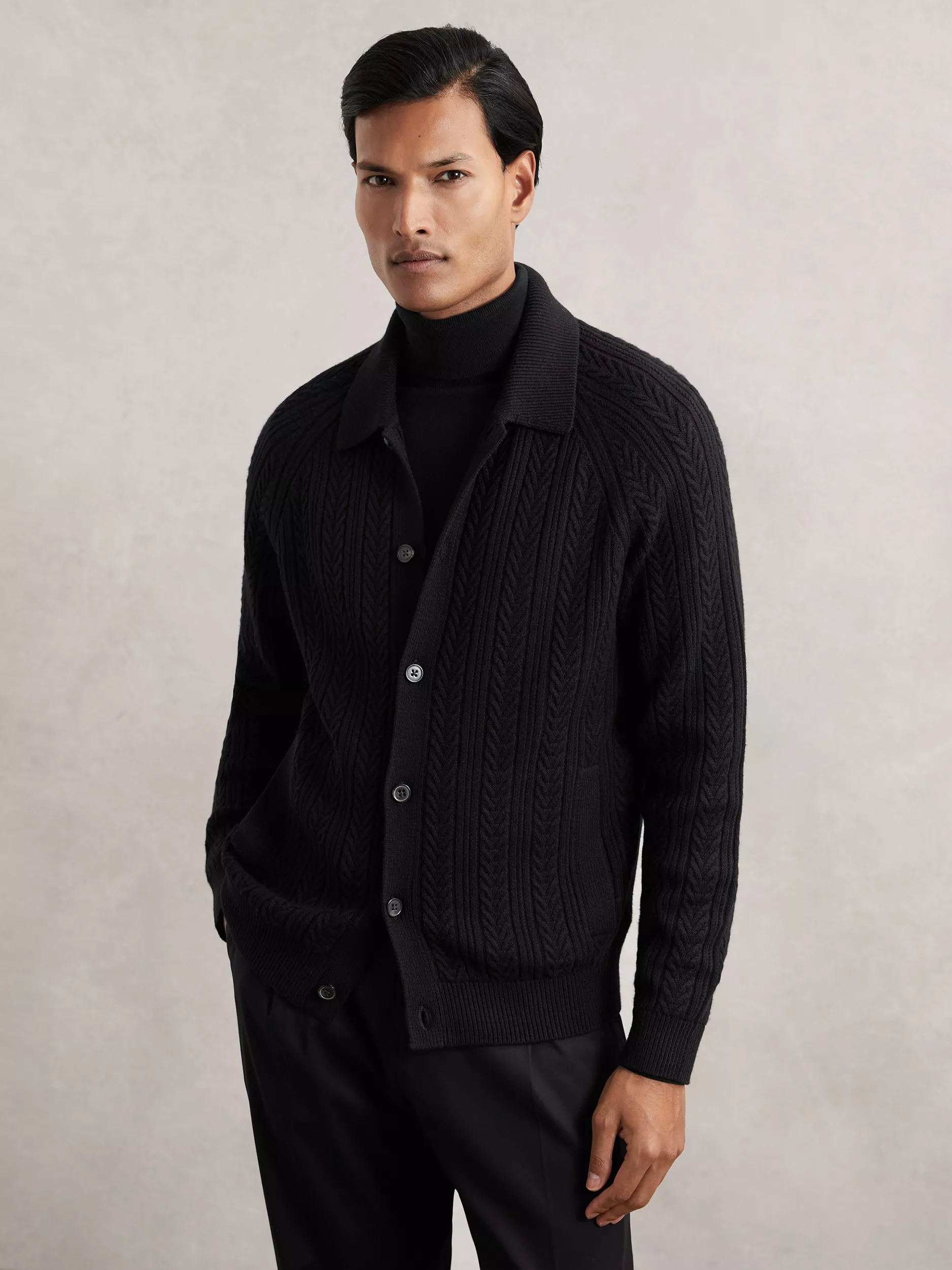 This cardigan features a ribbed collar and a cable-knit structure that makes it ideal for adding texture to an array of seasonal looks. It is also a distinctive knitwear design that still retains an effortless quality.