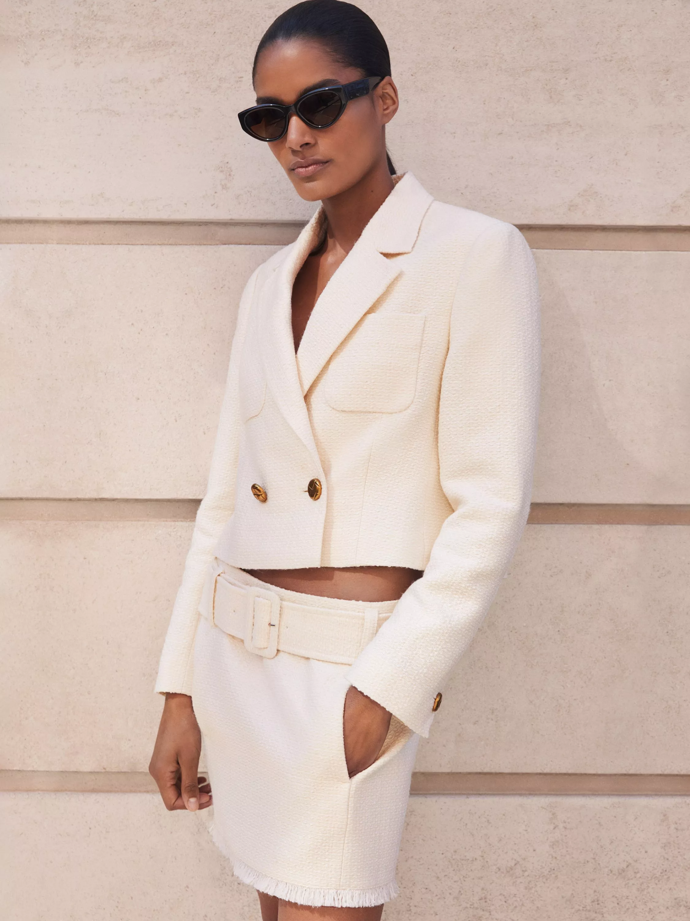 Woven in a luxurious wool blend, this belted mini skirt from Reiss is minimally detailed for endless wearability. With a frayed hem, slip on with a vest or sweatshirt for daily outings.