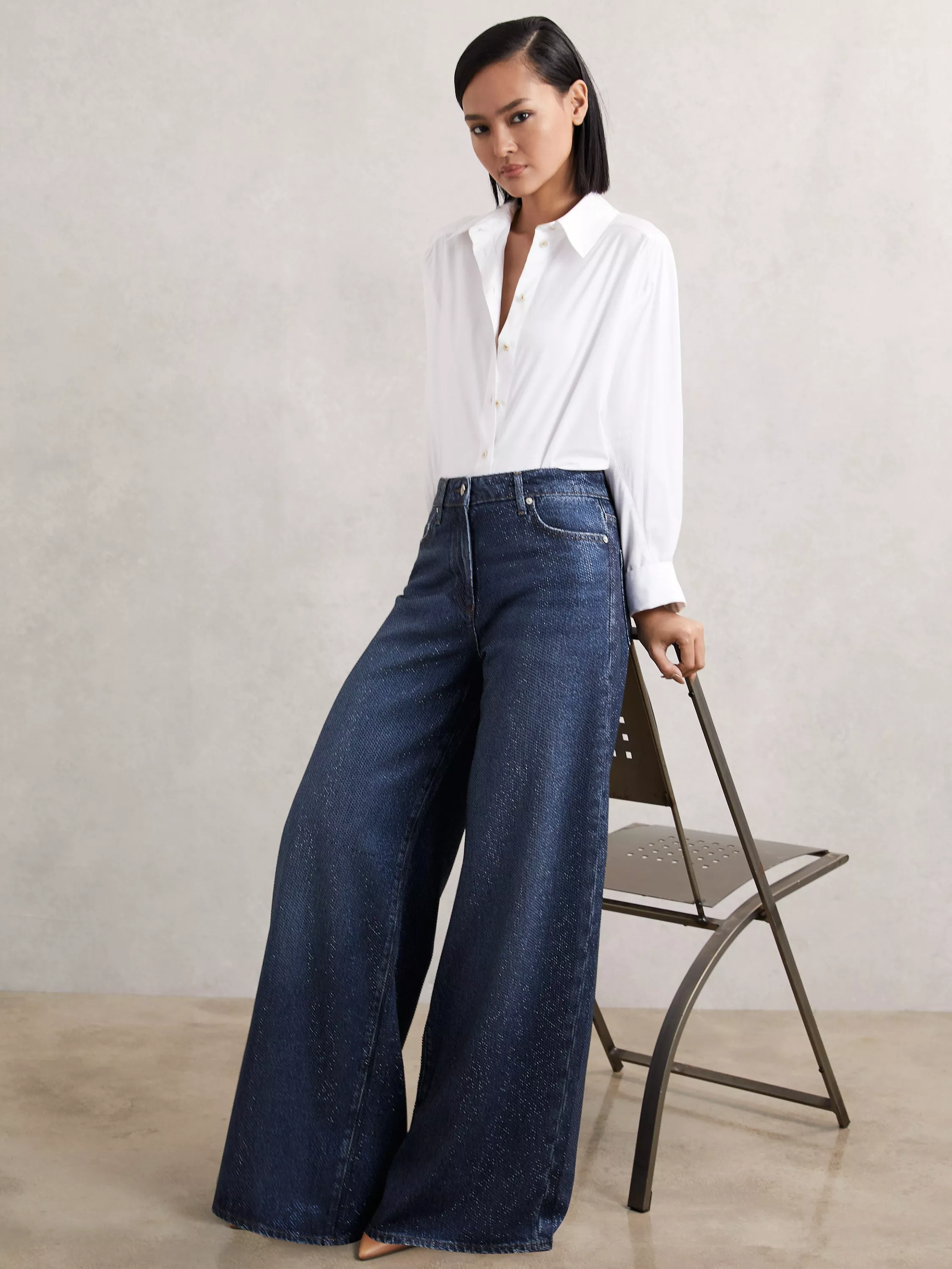 A pair of wide leg jeans from Reiss with embellishments. Made in denim with a mid rise and a zip fastening, they fall to a regular length.