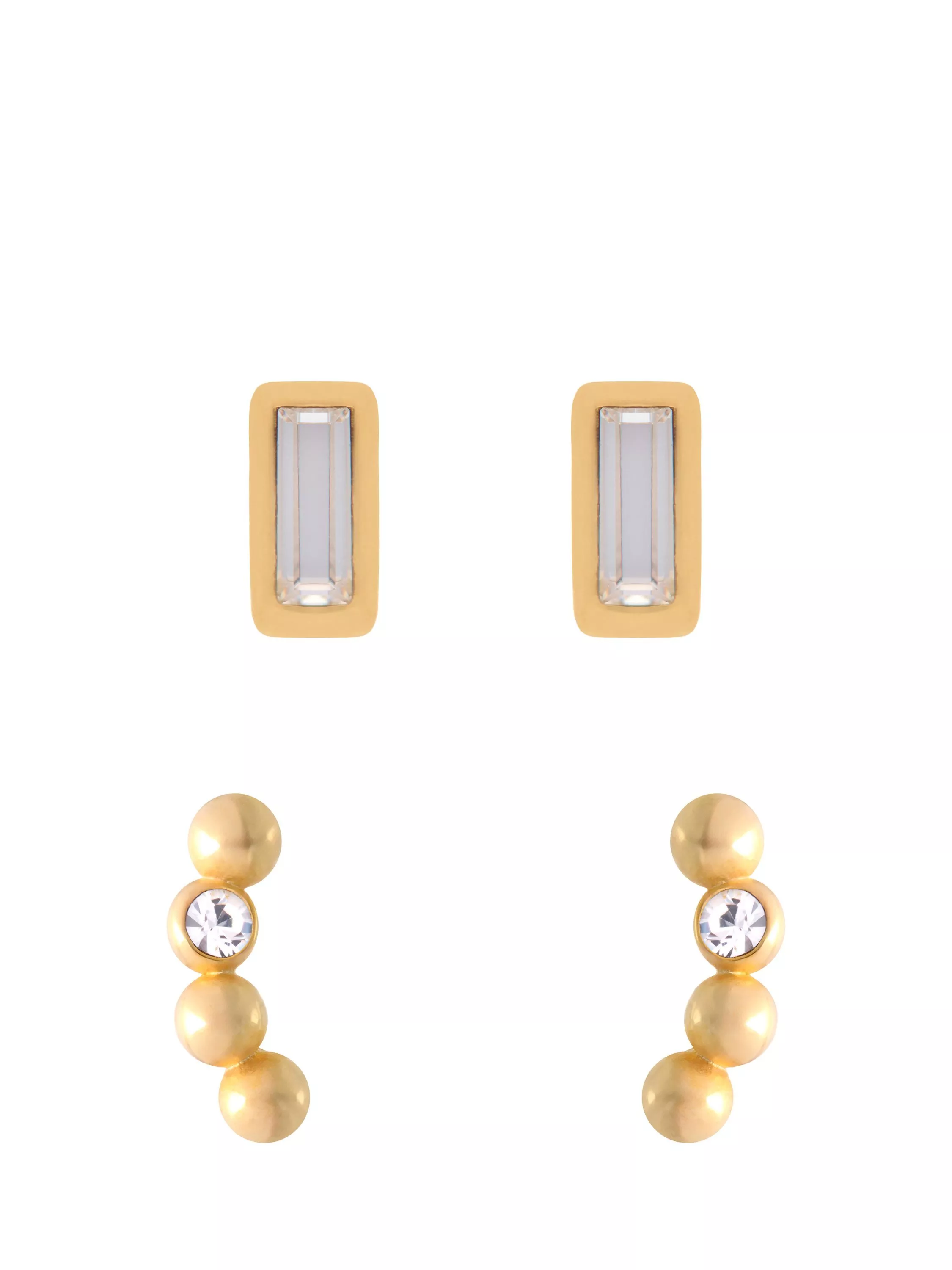 For chic simplicity, try the Mina Set from Reiss. This set features two pairs of dainty studs one with a clear baguette crystal and the other with a beaded metal curve accented with a crystal. Finished in gold-tone plating, these versatile studs are perfect for stacking or can be worn alone for a minimalist look.