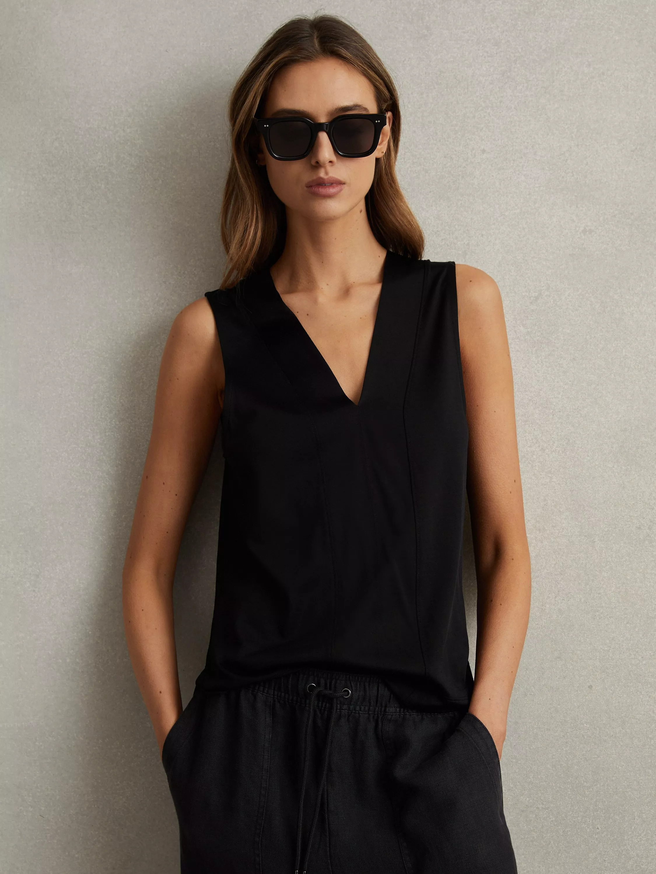 With a flattering v-neckline and a sleeveless design, it is made with light yet robust fabric for longevity of wear and will slot seamlessly into your everyday staples.