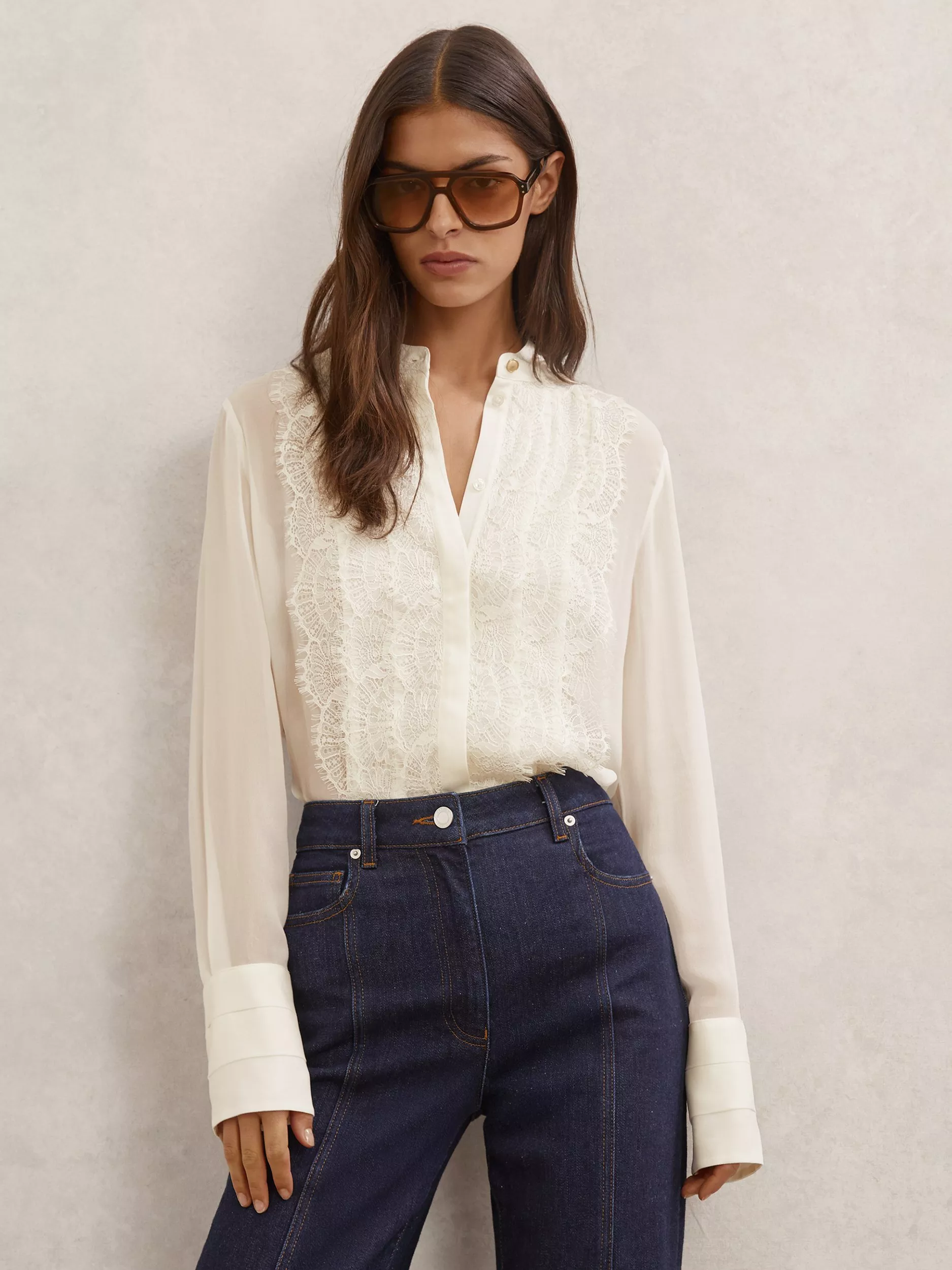 An effortless sheer blouse from Reiss, made from light viscose. Featuring a collar and long sleeves, it's accented with lace detailing through the front. Work-ready style that doesn't compromise comfort.
