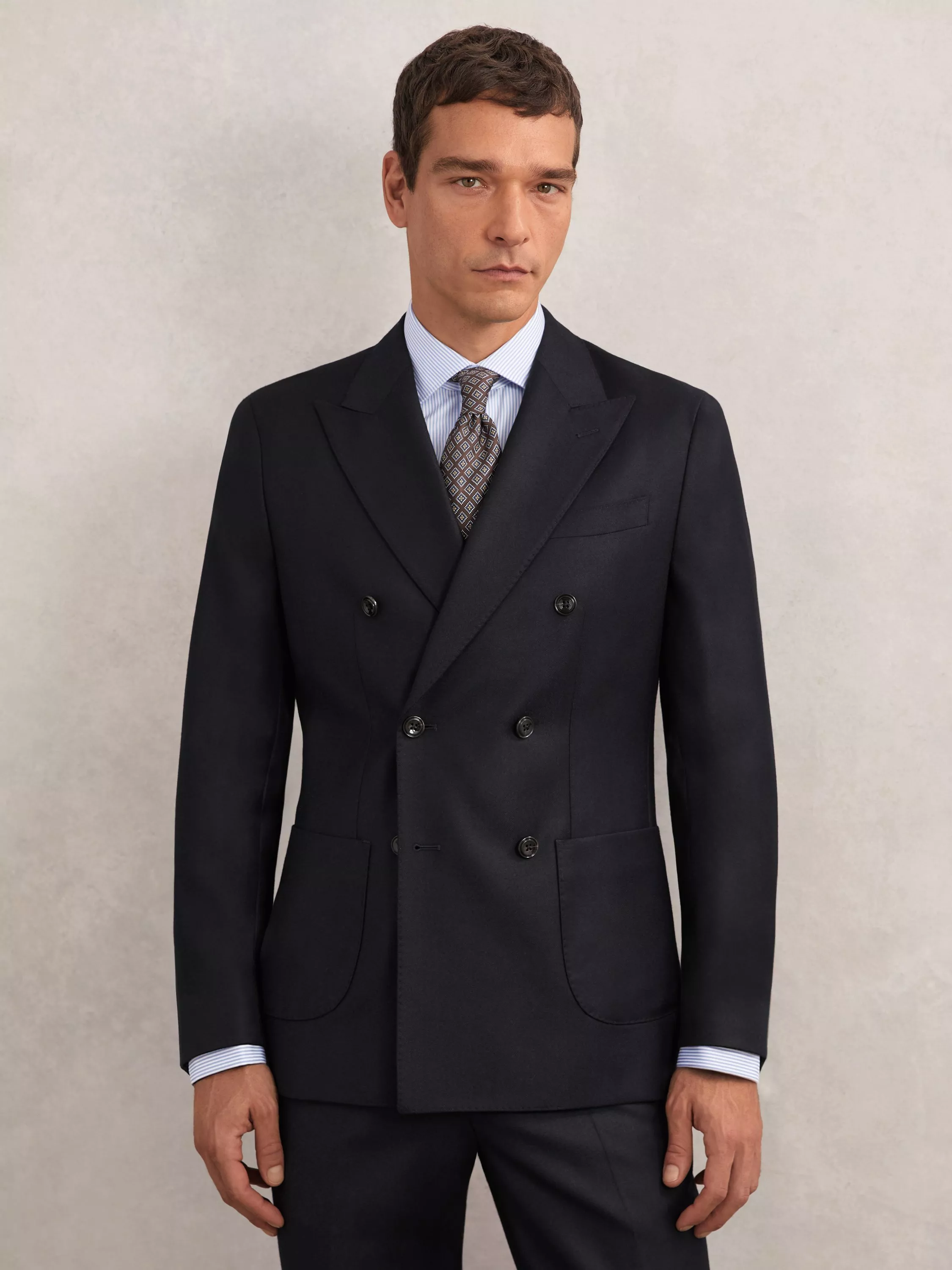 Express your own unique sense of style in the workplace or at social events with this blazer, a double-breasted silhouette defined by sharp peak lapels and two patch pockets.