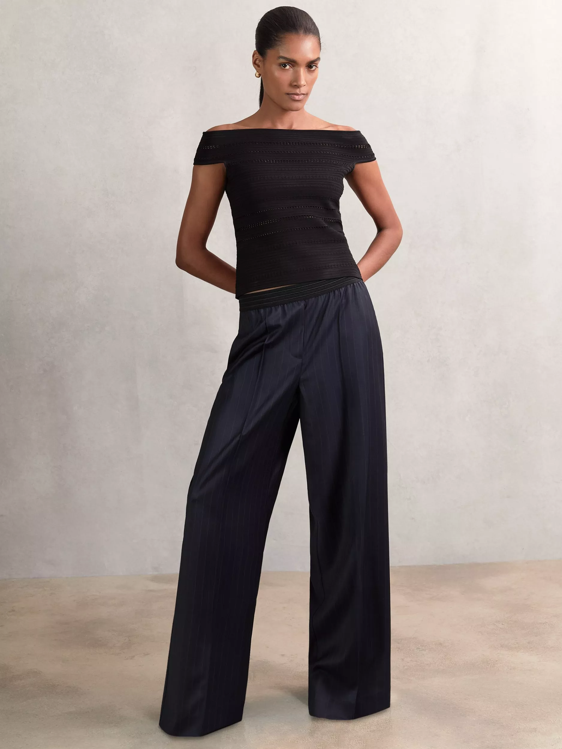 Confidence starts in the stance with this pair of wide-leg trousers by Reiss with a wool blended construction. They feature a mid rise with a zip fly, stripes and hems that are fall past the ankle.