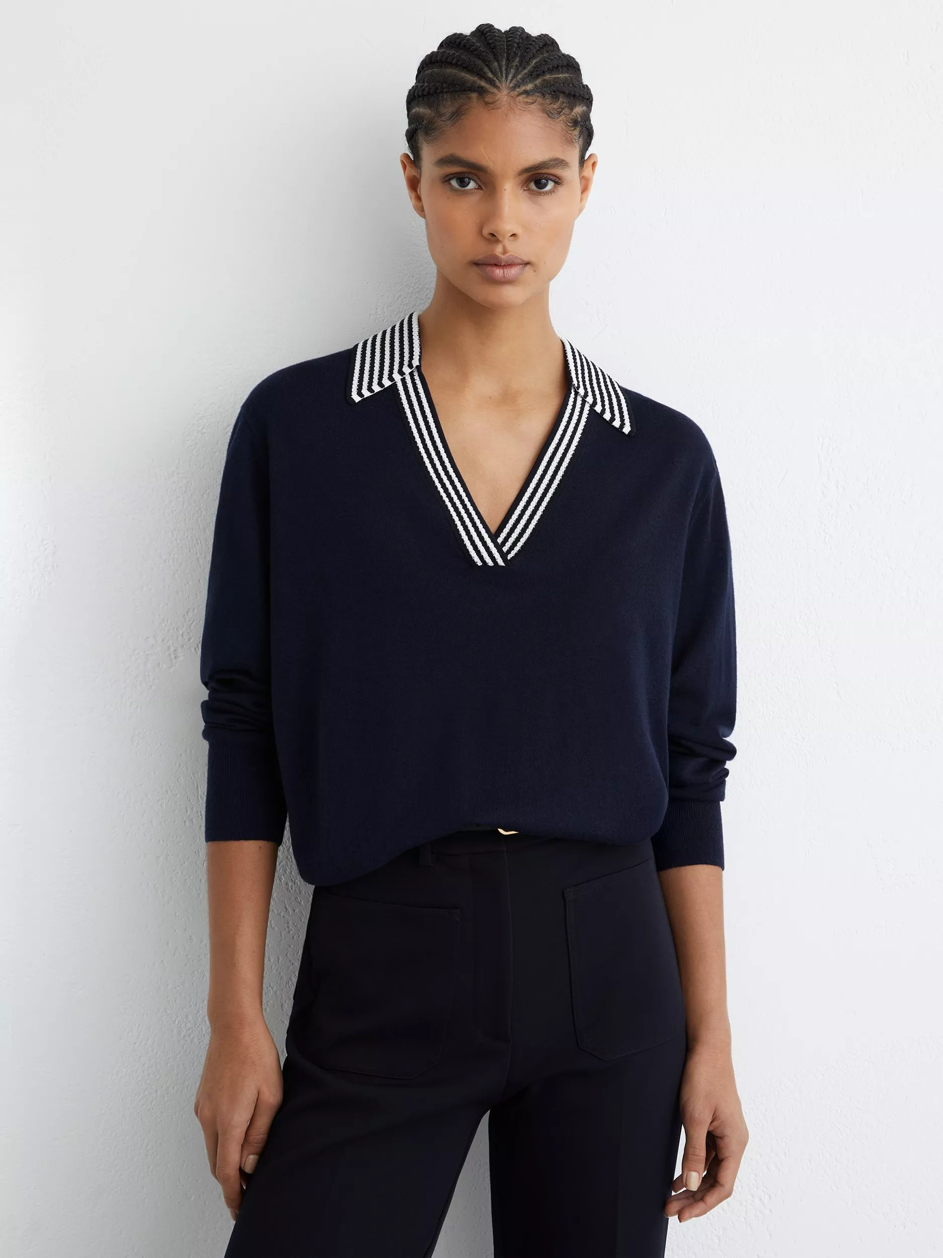 Offered in a wool blend, this V-neck jumper from Reiss has a cricket-inspired design.
