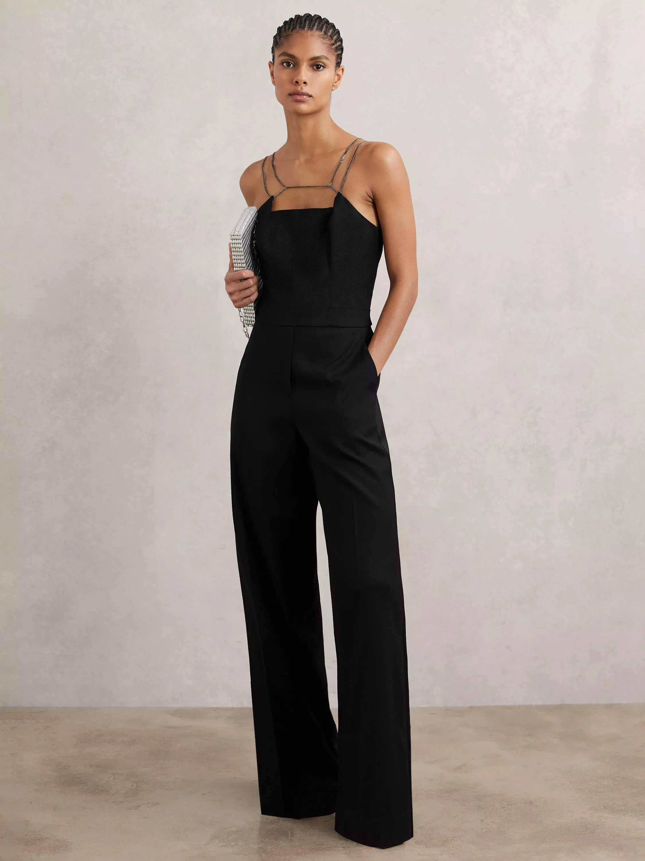 Elevate your evening with this chain detail jumpsuit. Its smooth viscose blend moves with you, while the square neck and spaghetti straps add a fresh edge. Designed for parties or nights out, it keeps you comfortable so you can enjoy every moment.