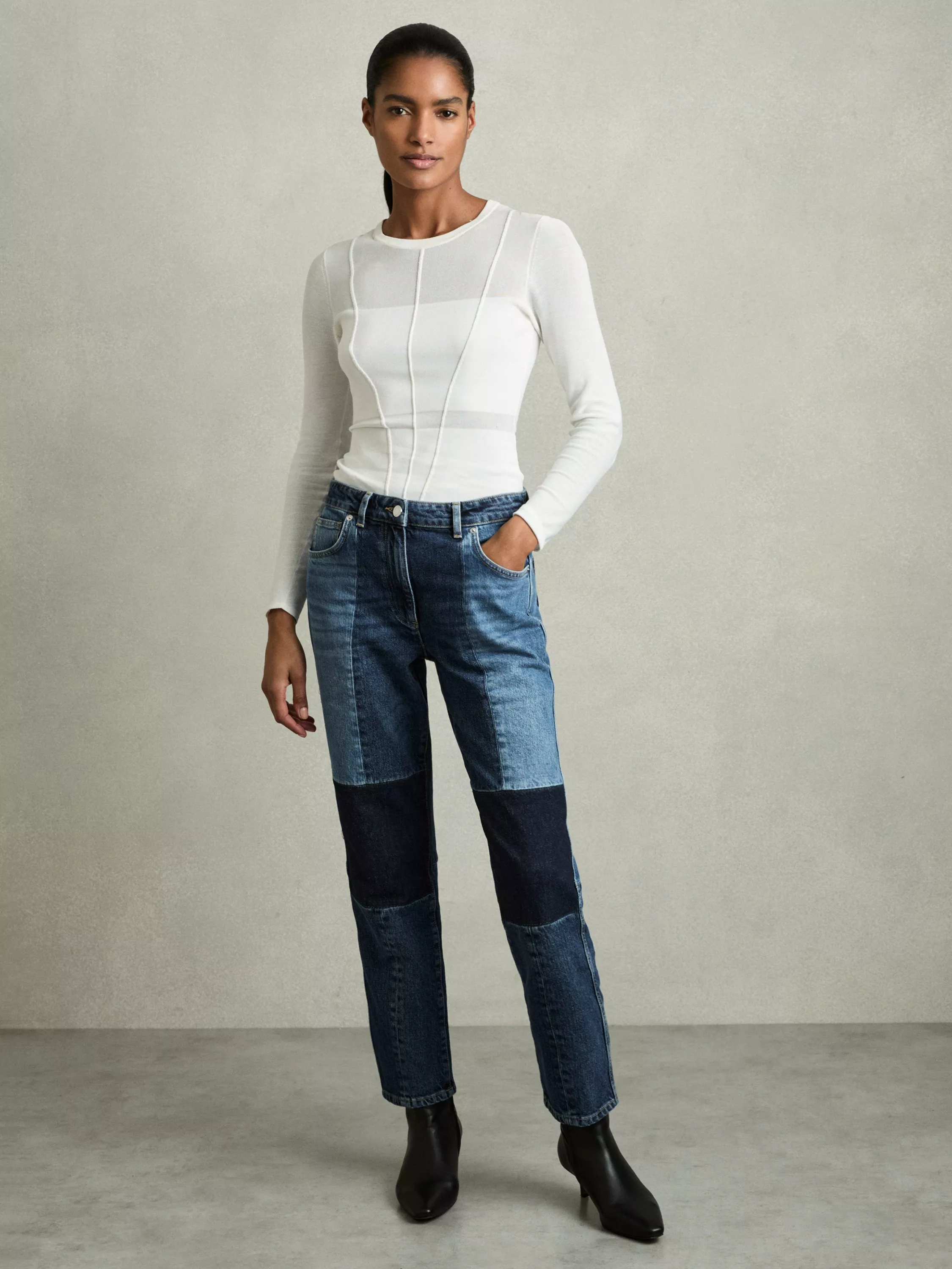 Offering both comfort and ease with a straight-leg silhouette, these mid rise jeans from Reiss are patchworked from mixed wash denim and finish at a regular length.