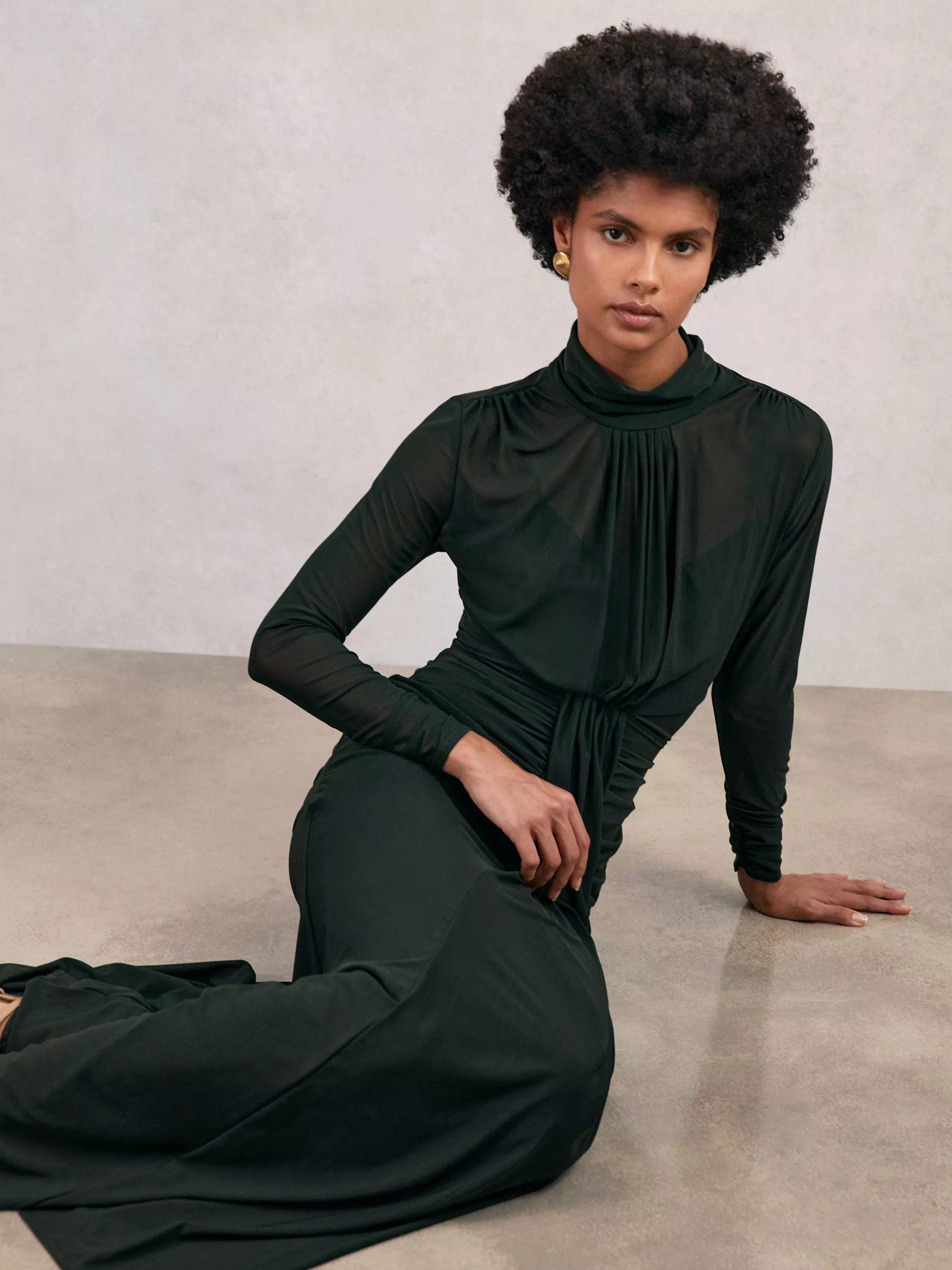 A ruched maxi dress from Reiss, with a high neckline and long sleeves to keep you comfortable and confident while you move and mingle. In a petite-fit, it looks sharp and feels effortless every time.