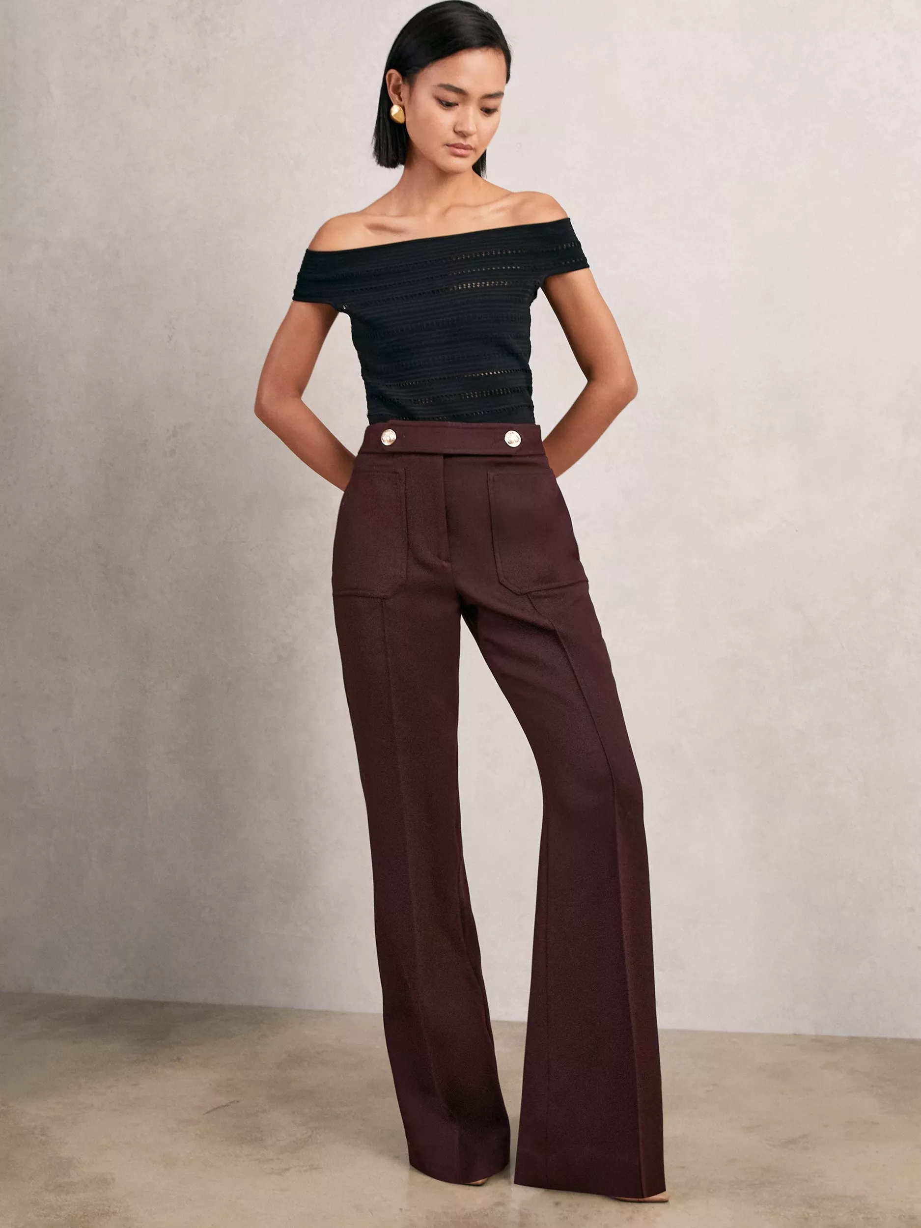 Flared leg trousers from Reiss. The mid-rise fit and wool blend deliver all-day ease and style, complete with a zip fastening and hems that fall to a regular length.