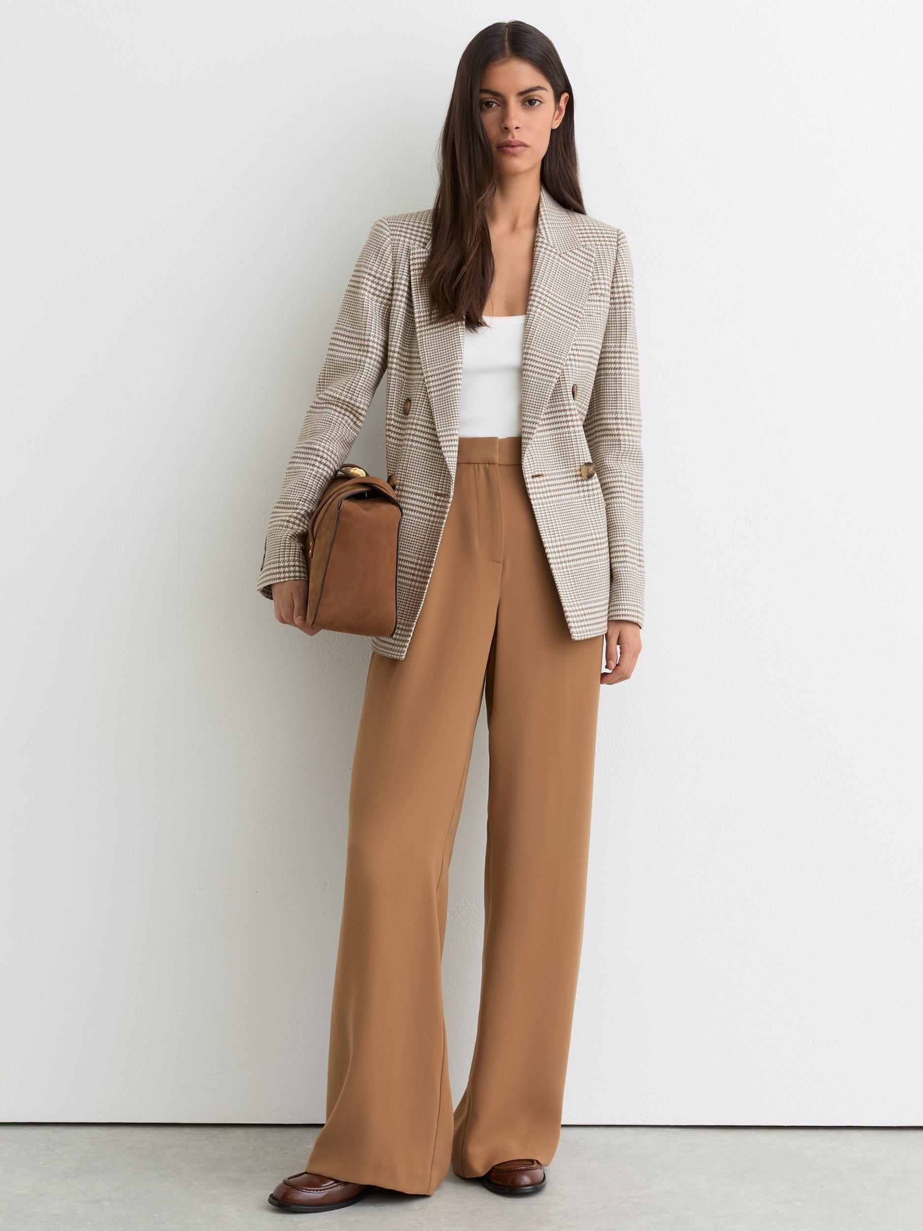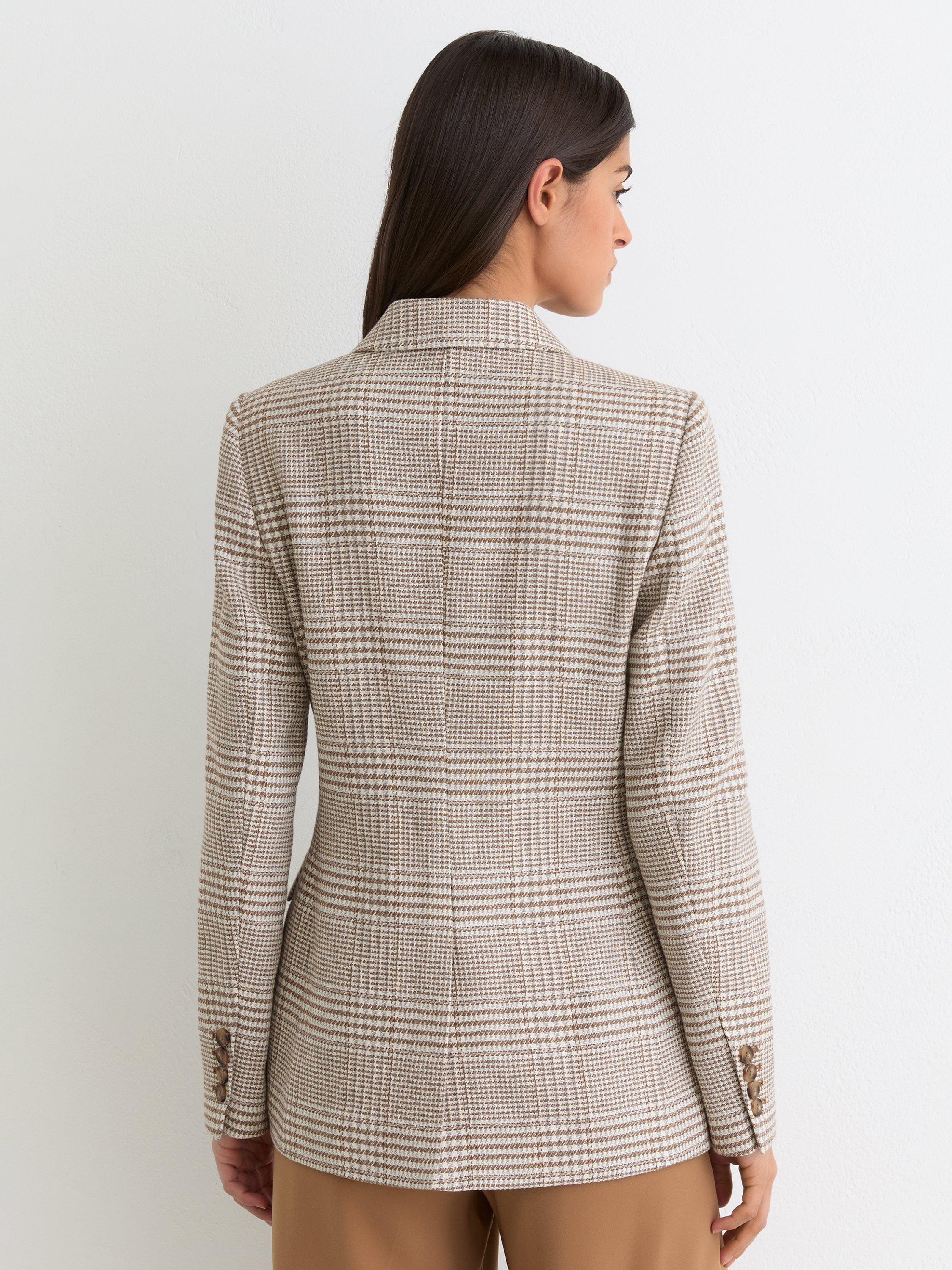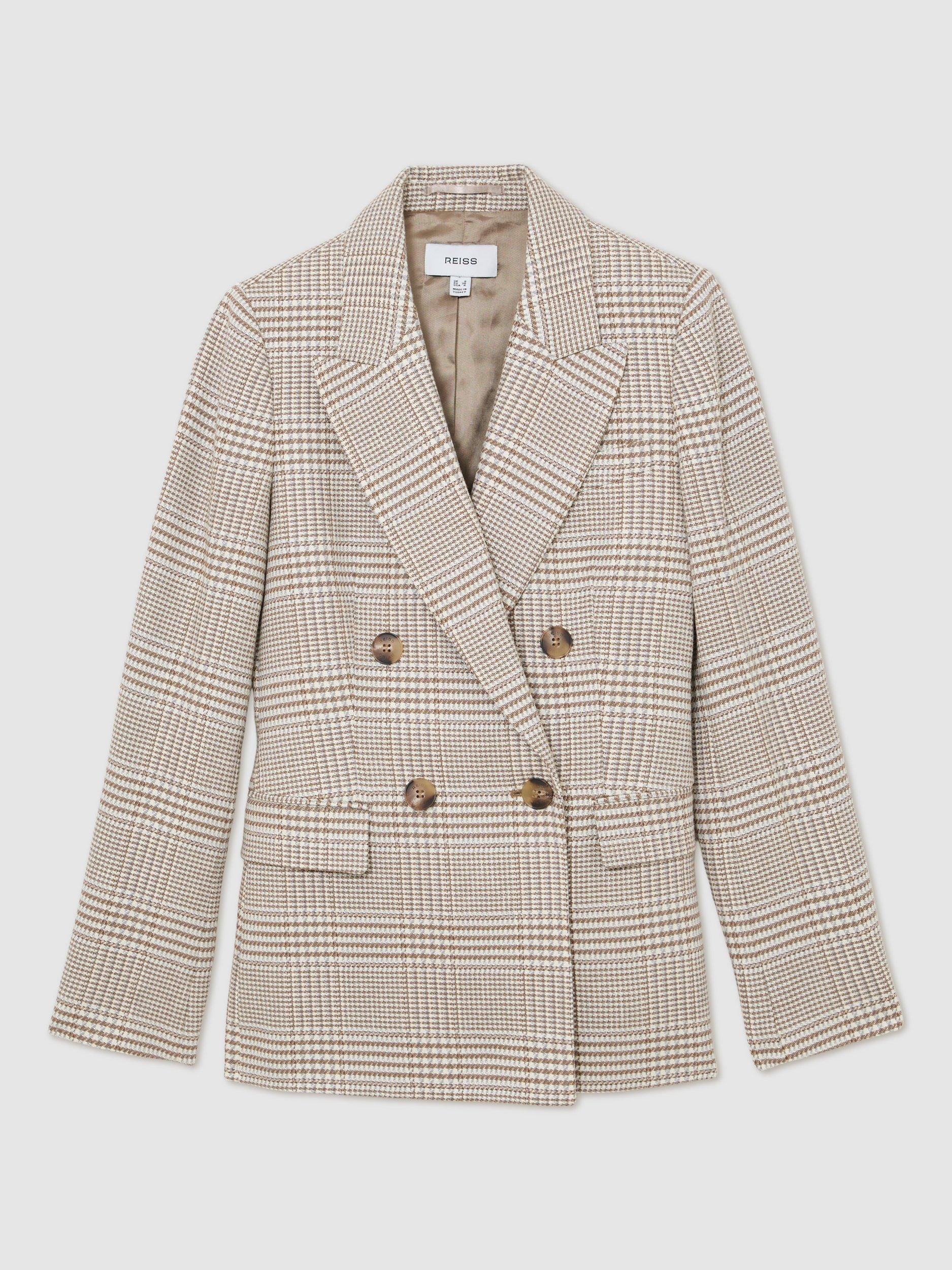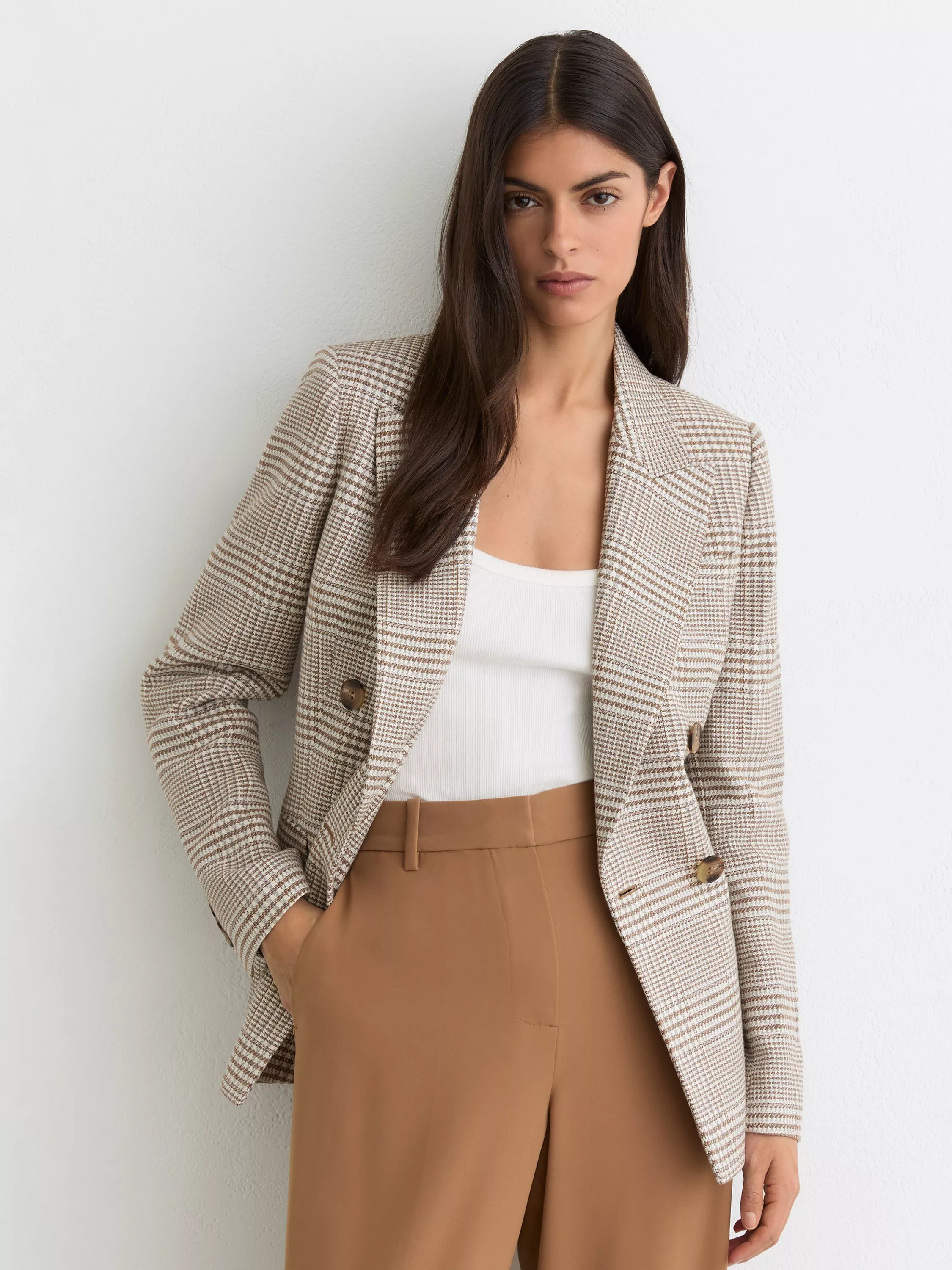 This double-breasted check blazer brings structure to your day, blending classic tailoring with a clever twist. Its petite fit sits just right, made from a cotton blend that feels comfortable yet sharp.