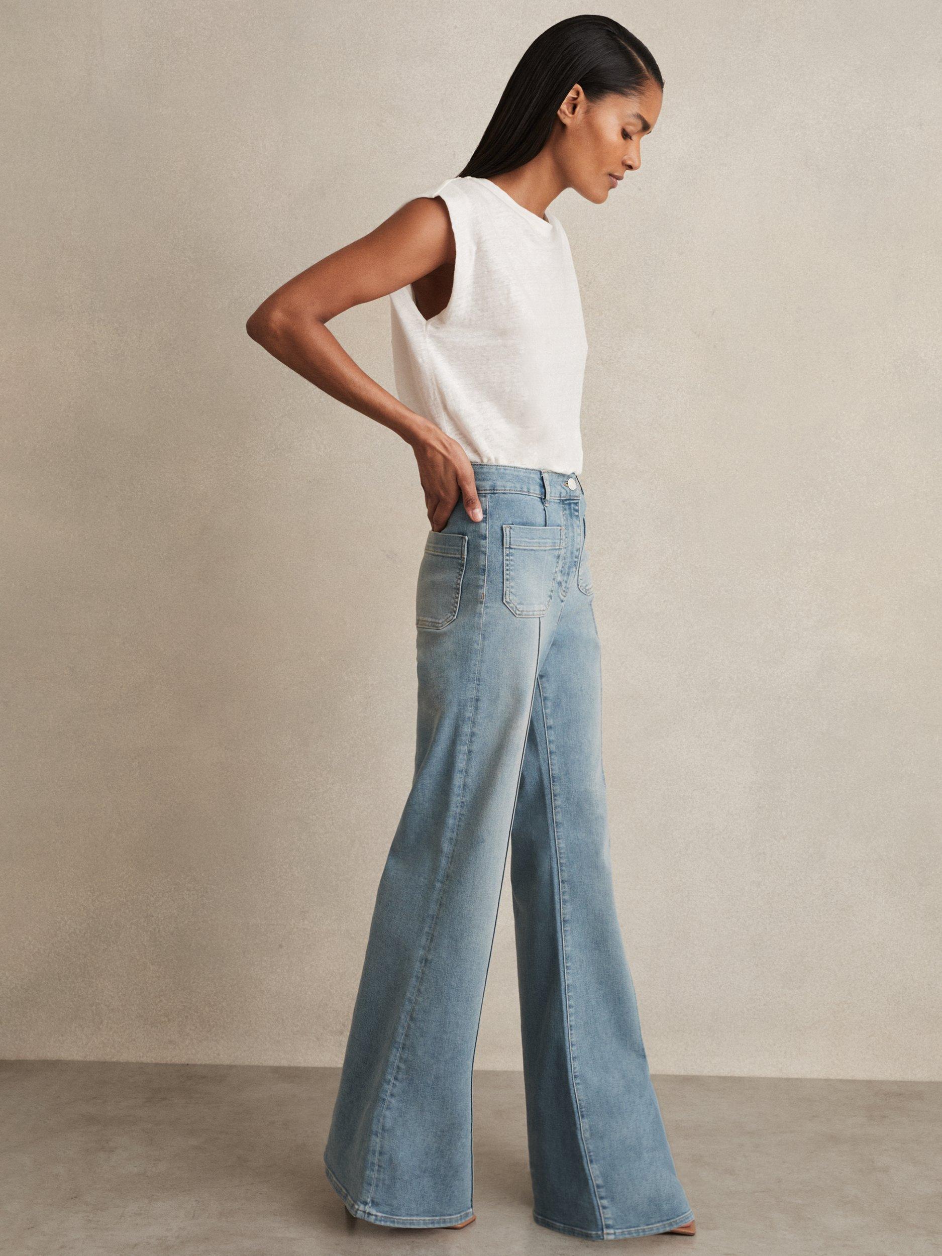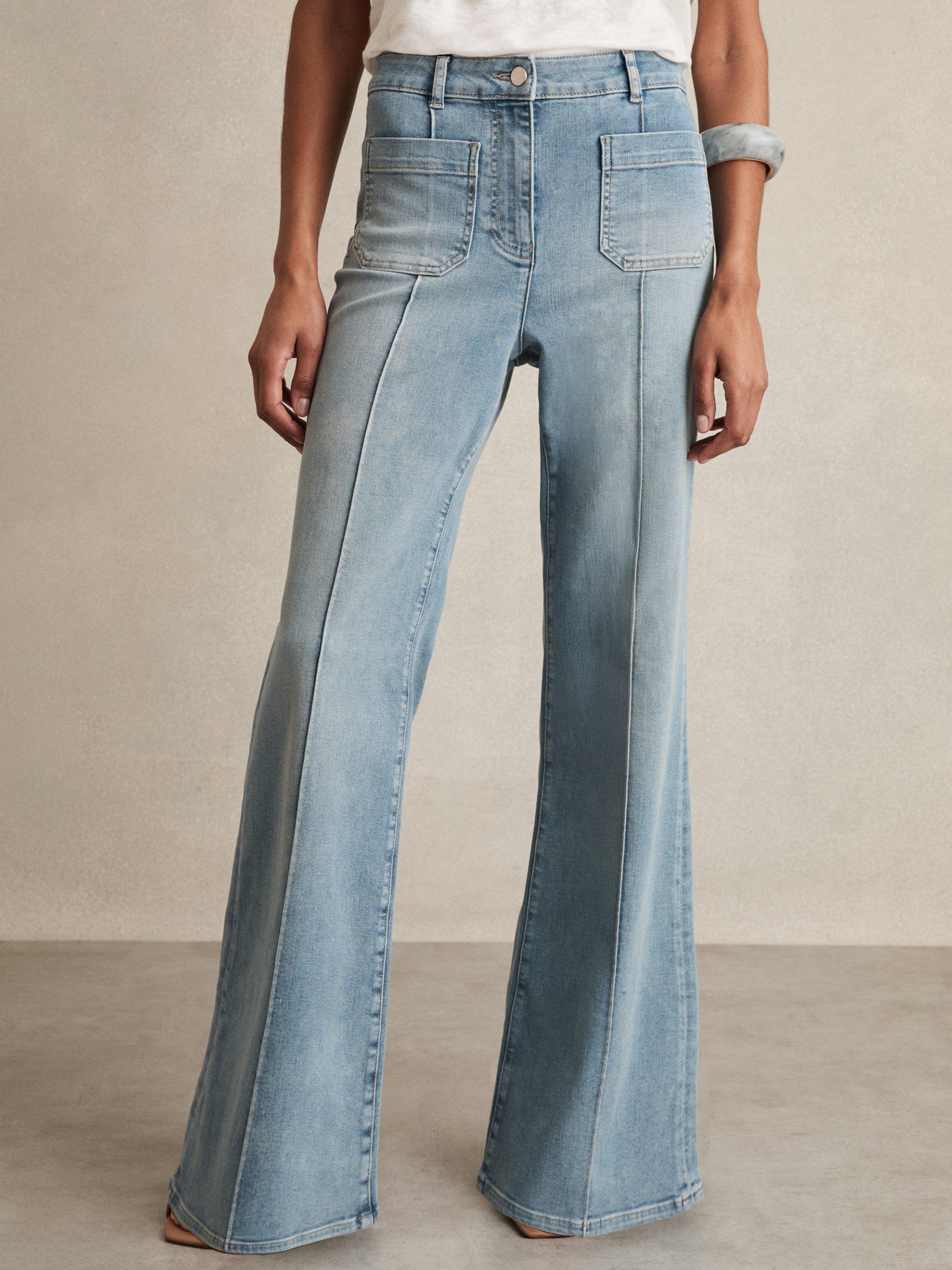A pair of '70s inspired flared petite jeans from Reiss with patch pockets. Sculpted from denim featuring a mid rise and a classic zip fly, they fall to a regular length.