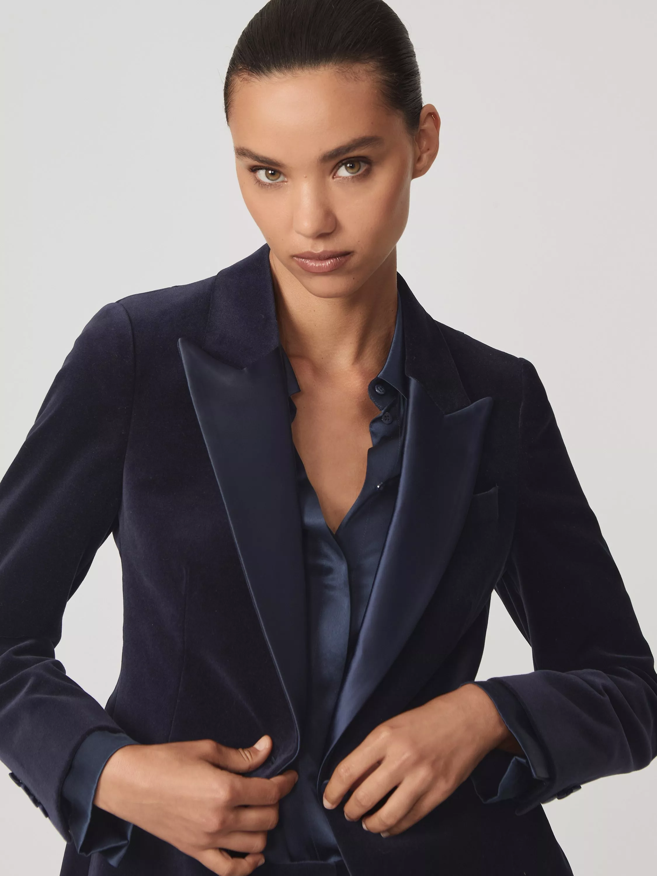This petite single-breasted jacket adds confidence to your evening look. The crisp cotton design and velvet finish adds a plush feel, while thoughtful tailoring keeps you comfortable. Style it your way for any occasion.