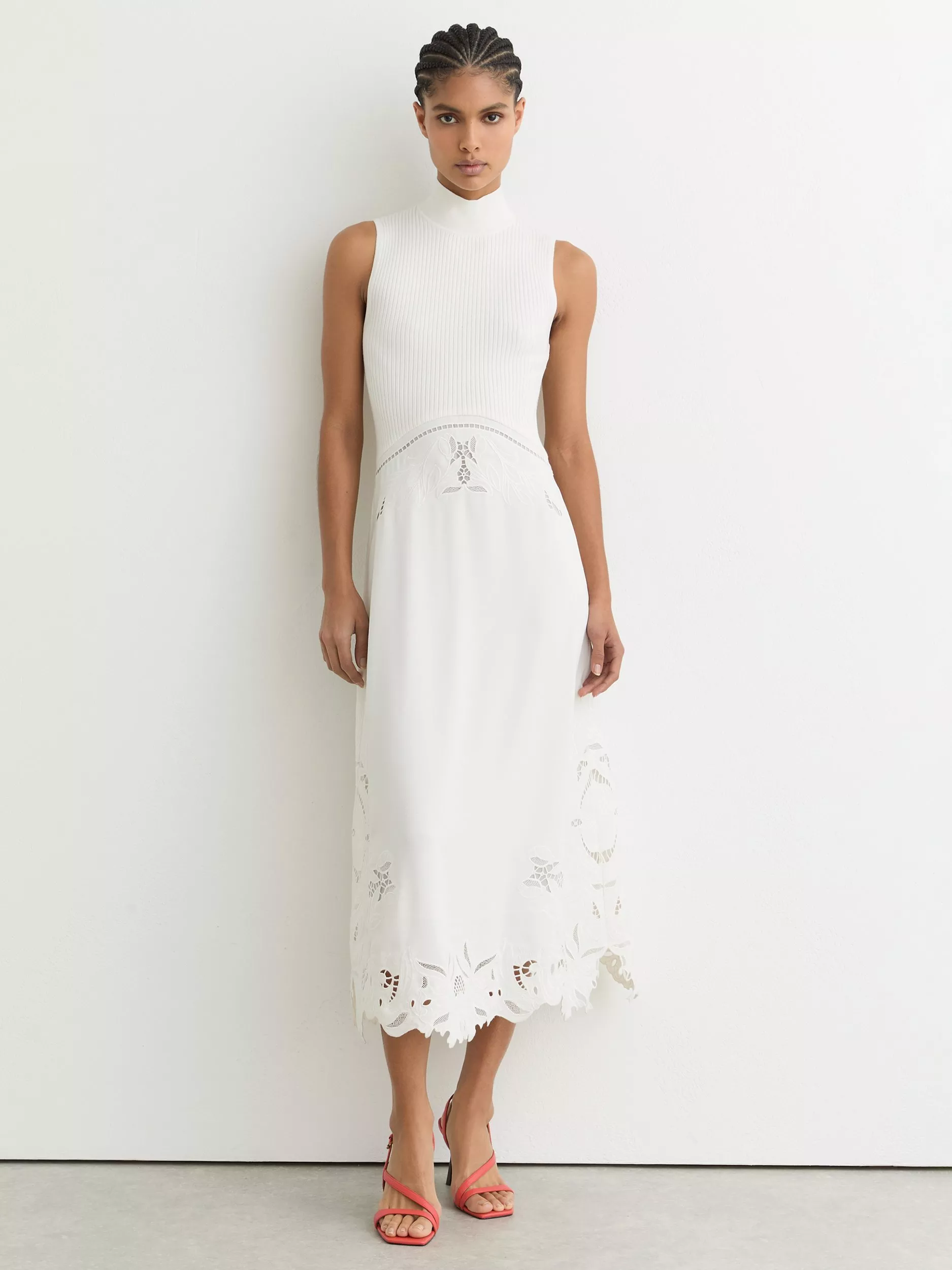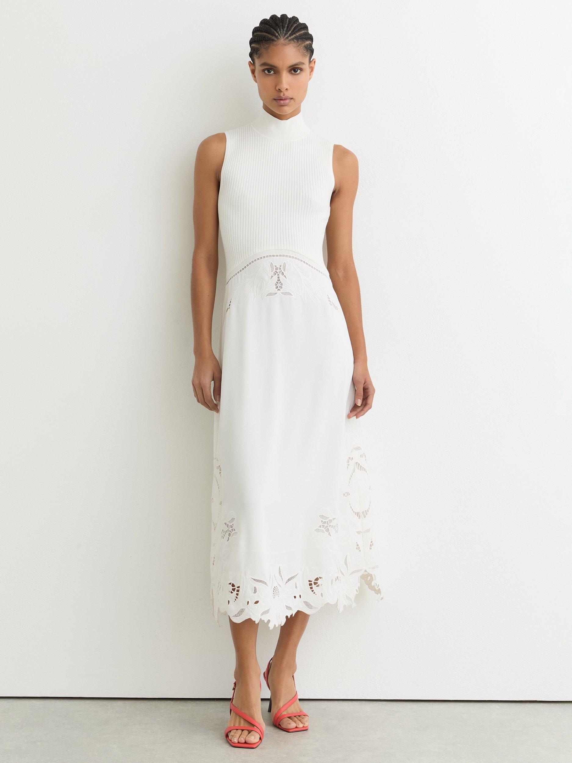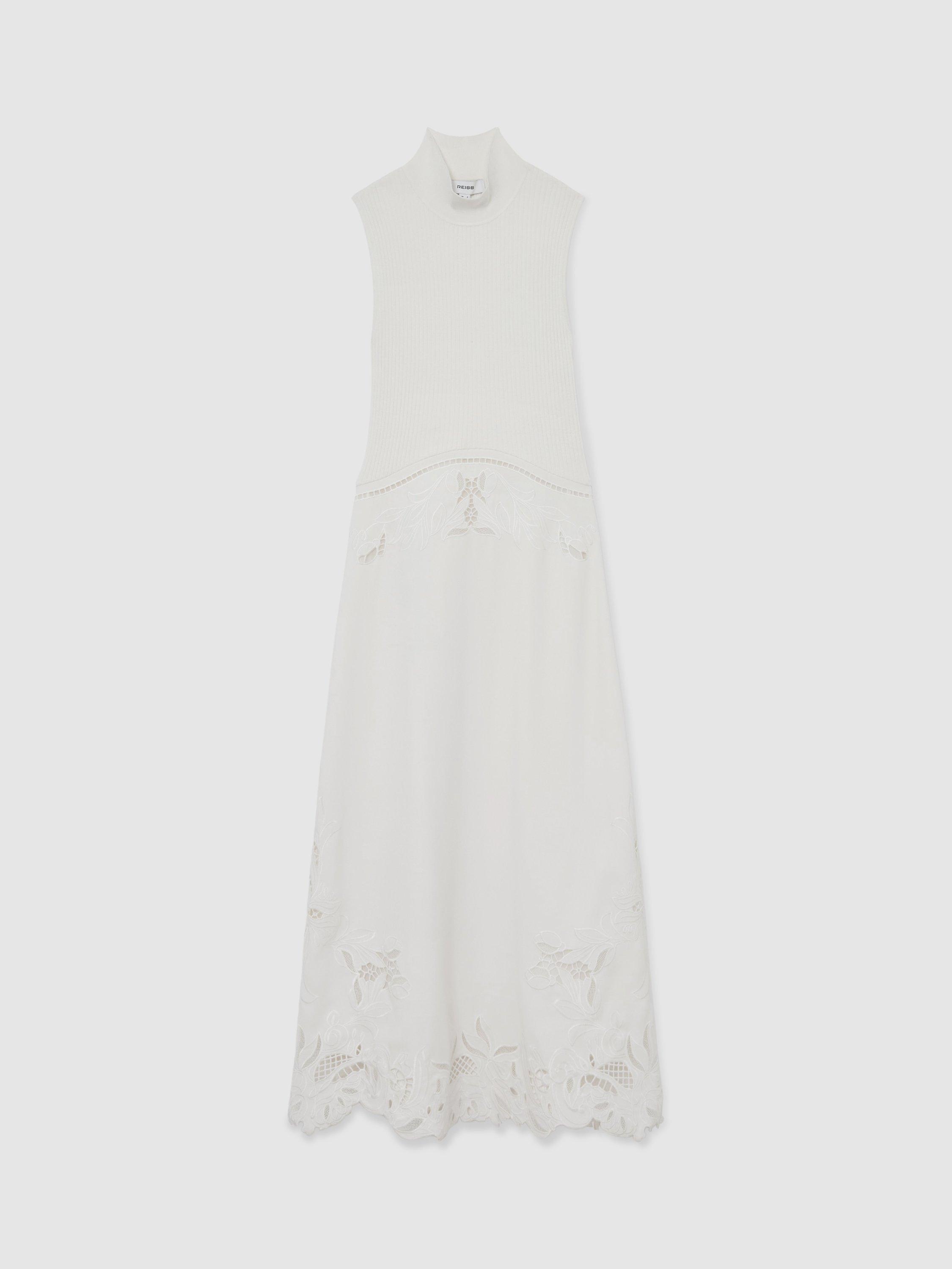 This sleeveless midi knit dress by Reiss features a high neck and floral details.