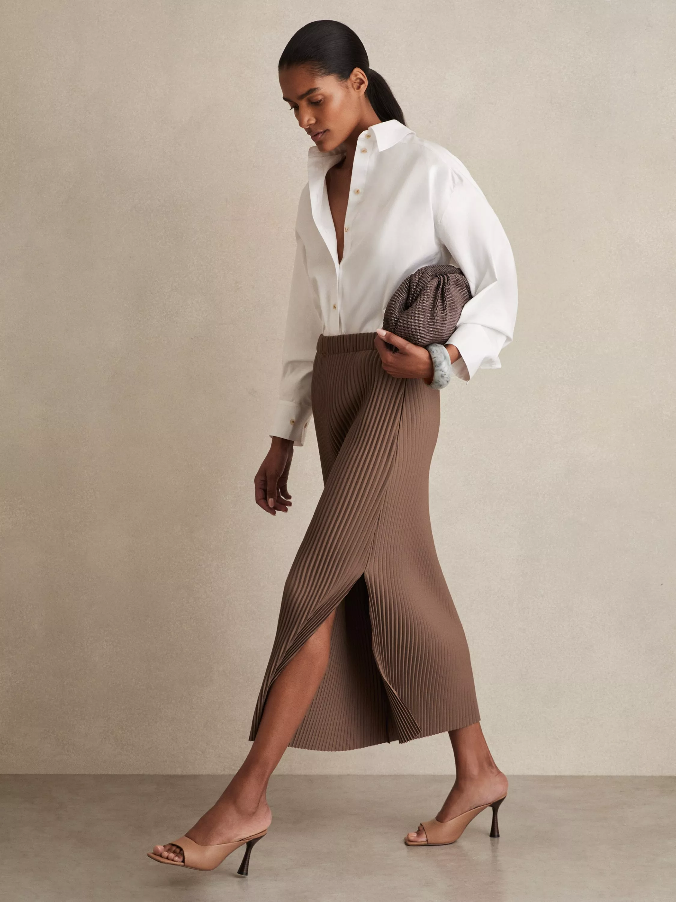 With gentle pleating all-over, this A-line shaped midi skirt from Reiss is free of unnecessary embellishments.