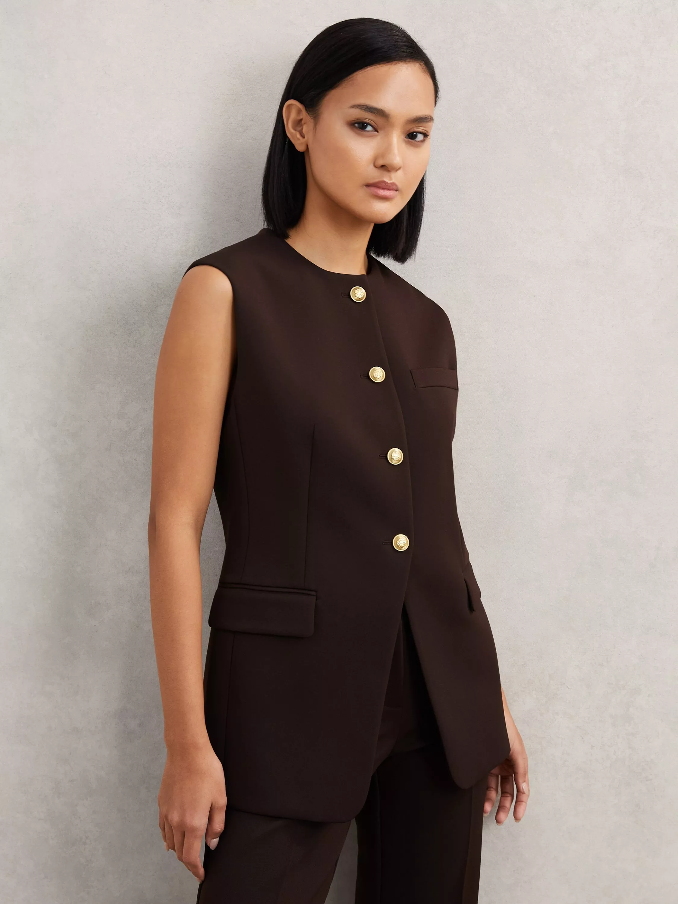 This longline waistcoat brings sharp style to your day. The round neck and sleeveless design let you move freely, giving you a versatile layer that adds confidence and smart edge to any look.