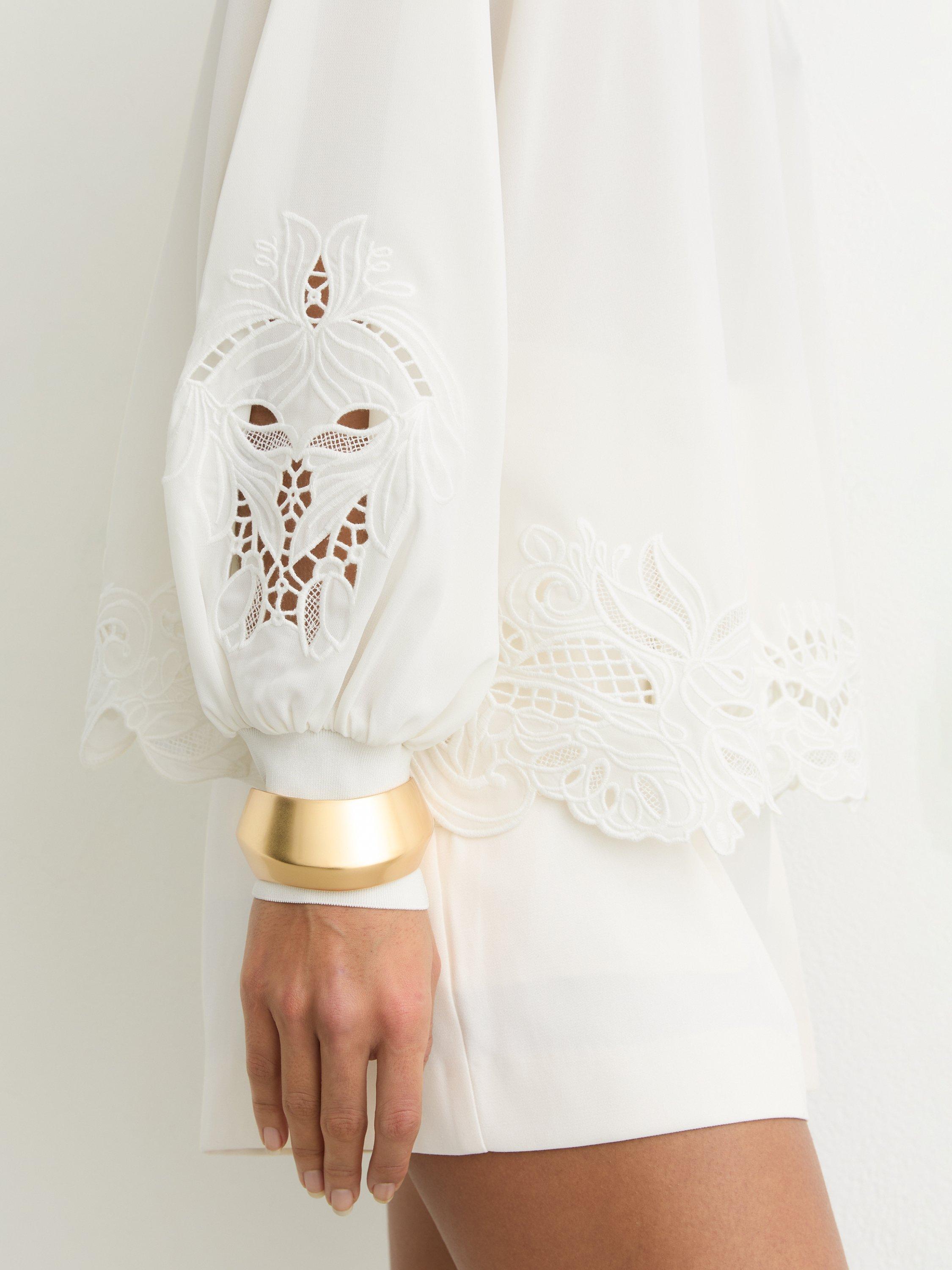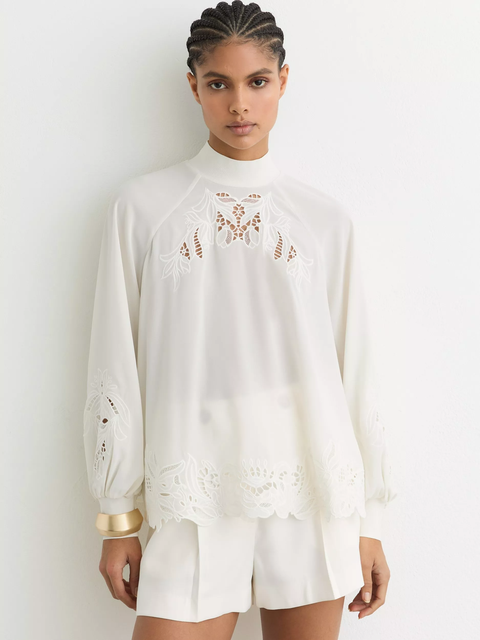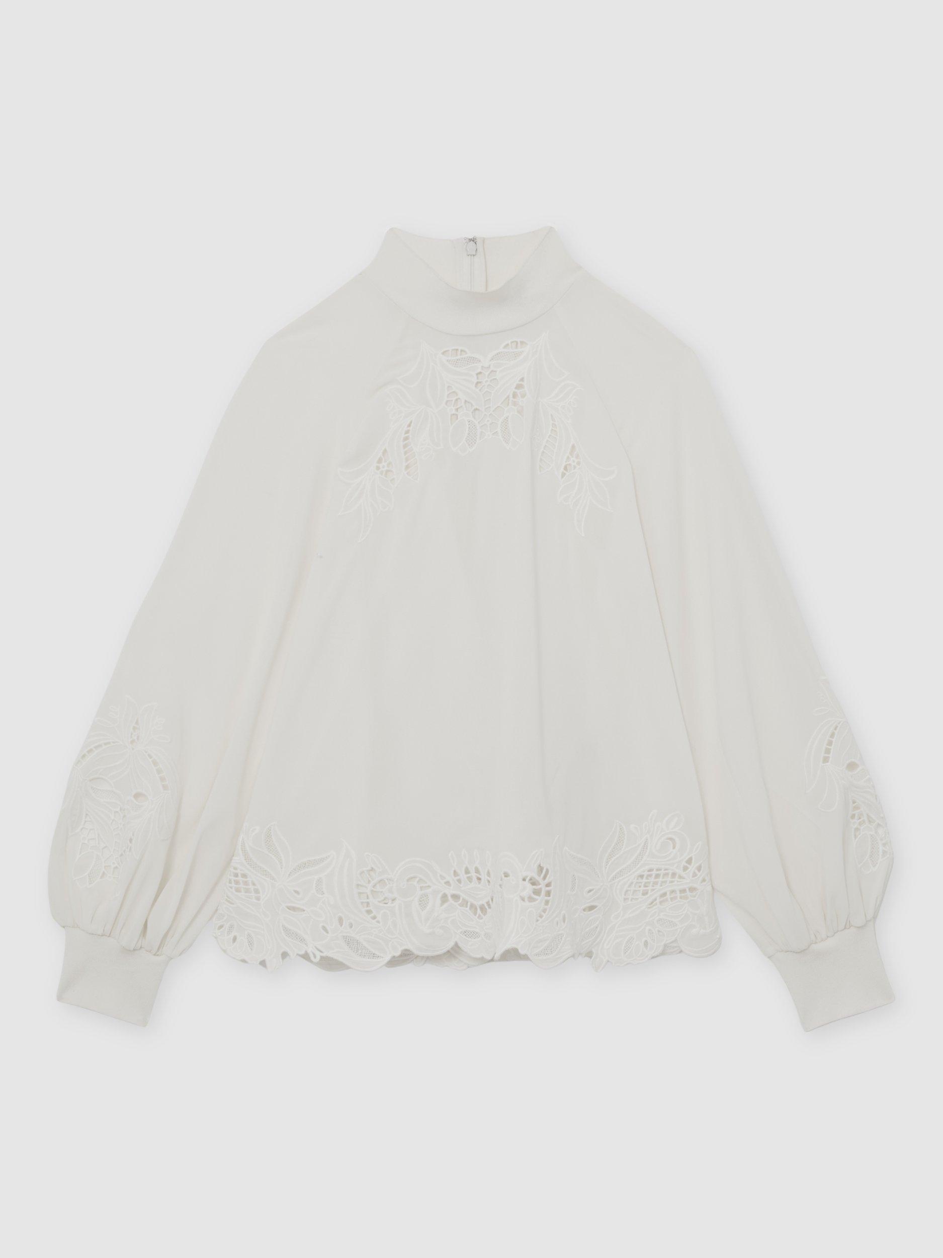 This blouse by Reiss features delicate cutwork floral embroidery. With a high funnel neck and long puff sleeves, it's casual, cool, and perfect from morning on.