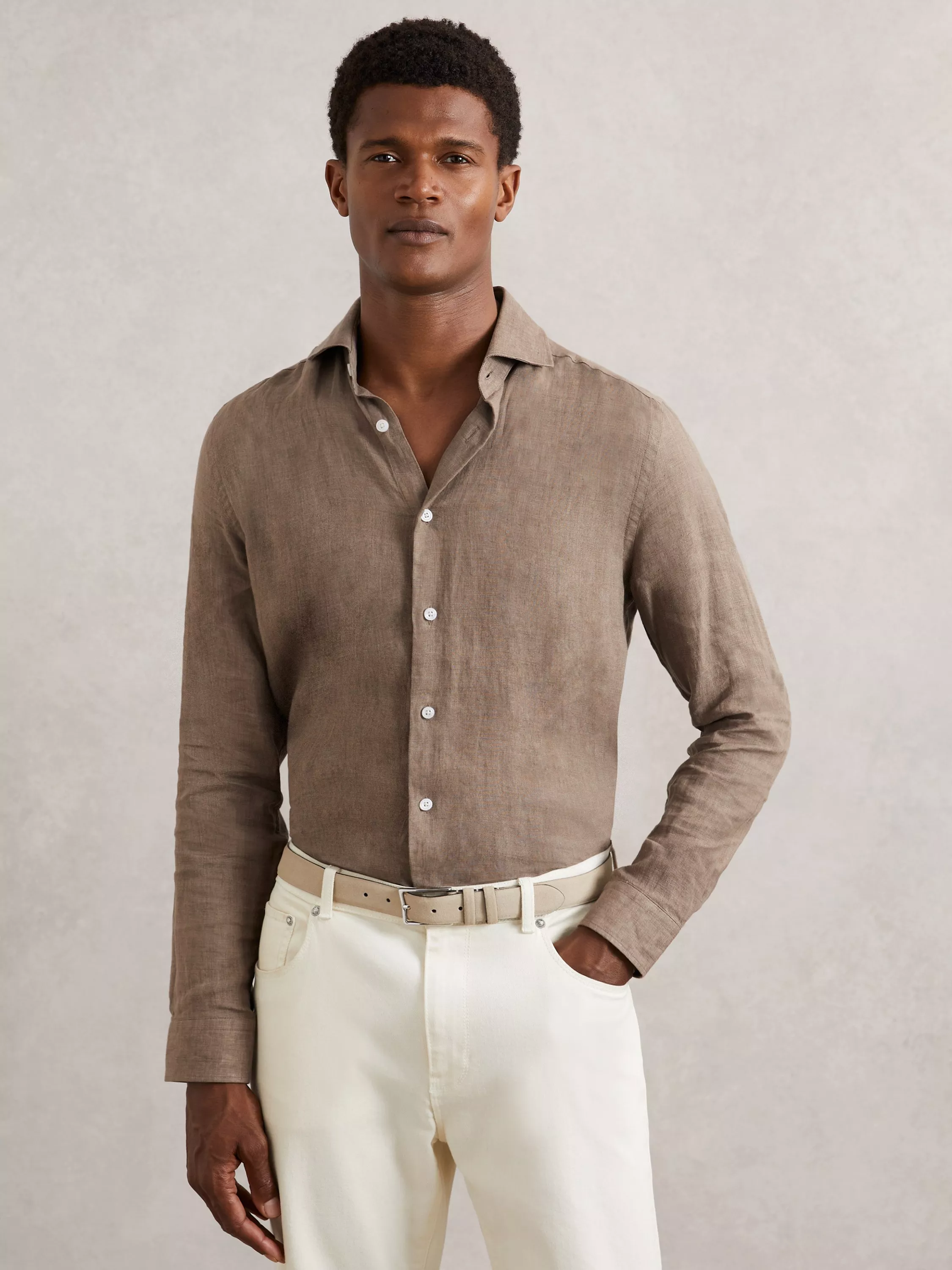 The long-sleeve Ruban shirt is designed from a lightweight, breathable linen fabric with a slight marled texture, perfect for resort destinations.
