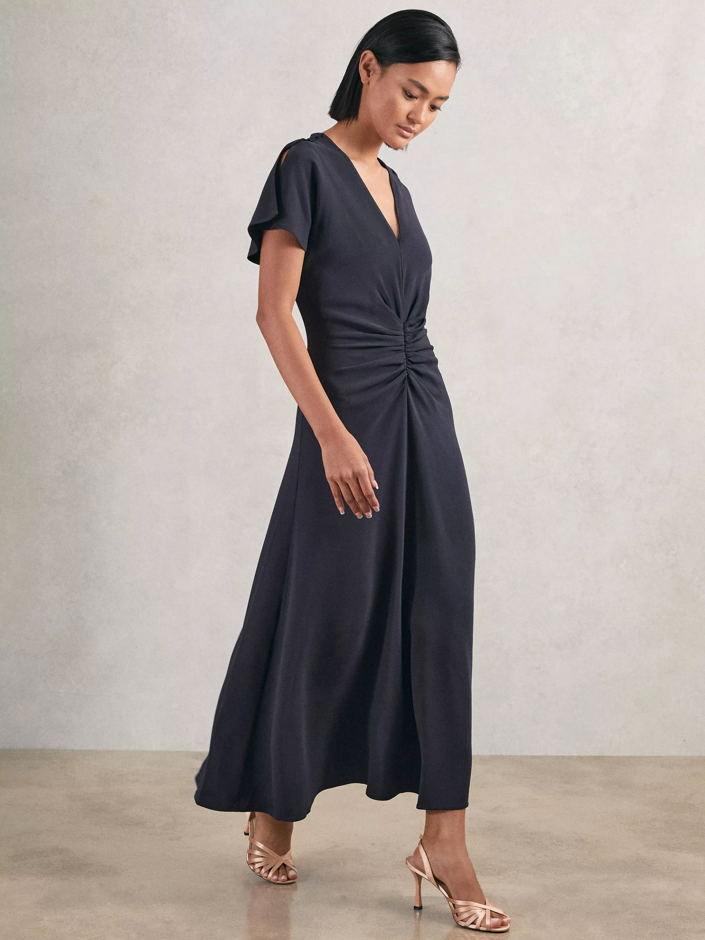 This midi dress by Reiss is designed for warm weather adventures. Its A-line shape and V-neck flatter, making it ideal for summer gatherings or everyday ease.