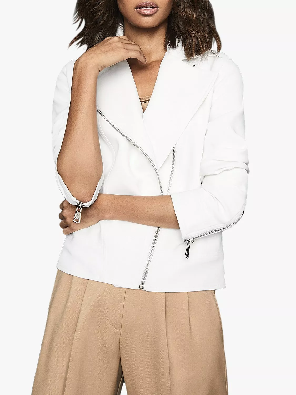 Inspired by utility-style, the Sabine biker jacket from Reiss offers vintage design with minimal detailing to keep it looking sleek. Zipping up to the side and with zip detailing at the sleeves, match it with all your evening and weekend looks.
