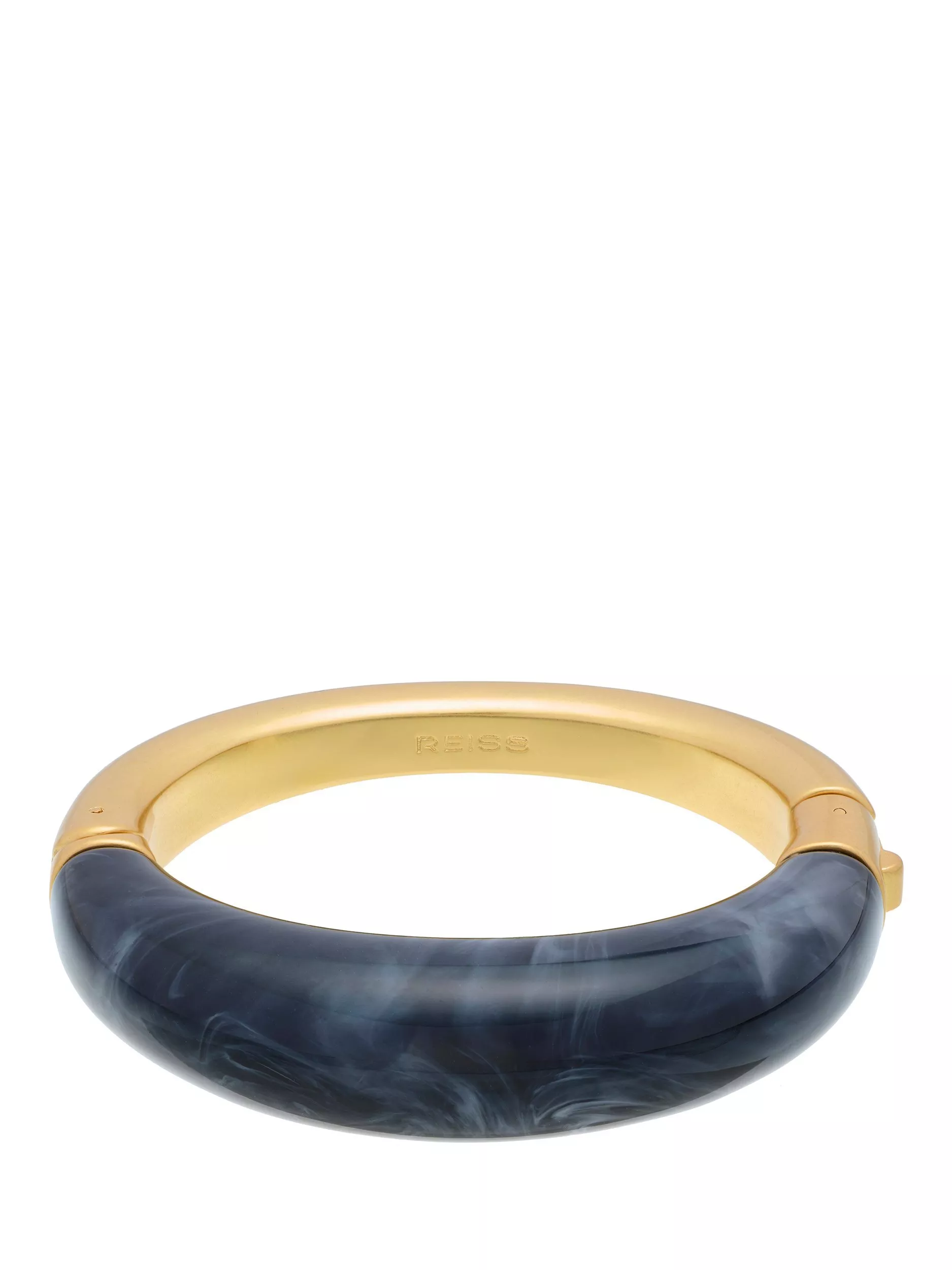 Reiss's Salma Scoop Hinged Bangle is a modern statement accessory. Perfect for day and evening wear, it features half gold-tone plating and half faux black marble for a bold yet refined look. The hinged closure ensures a secure and comfortable fit. Packaged in a Reiss branded gift box, it makes the perfect gift or a stylish addition to your jewellery collection.