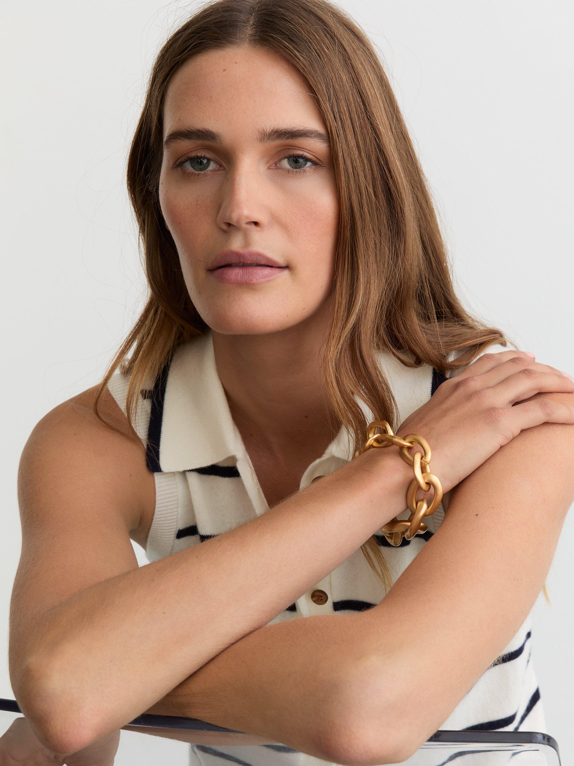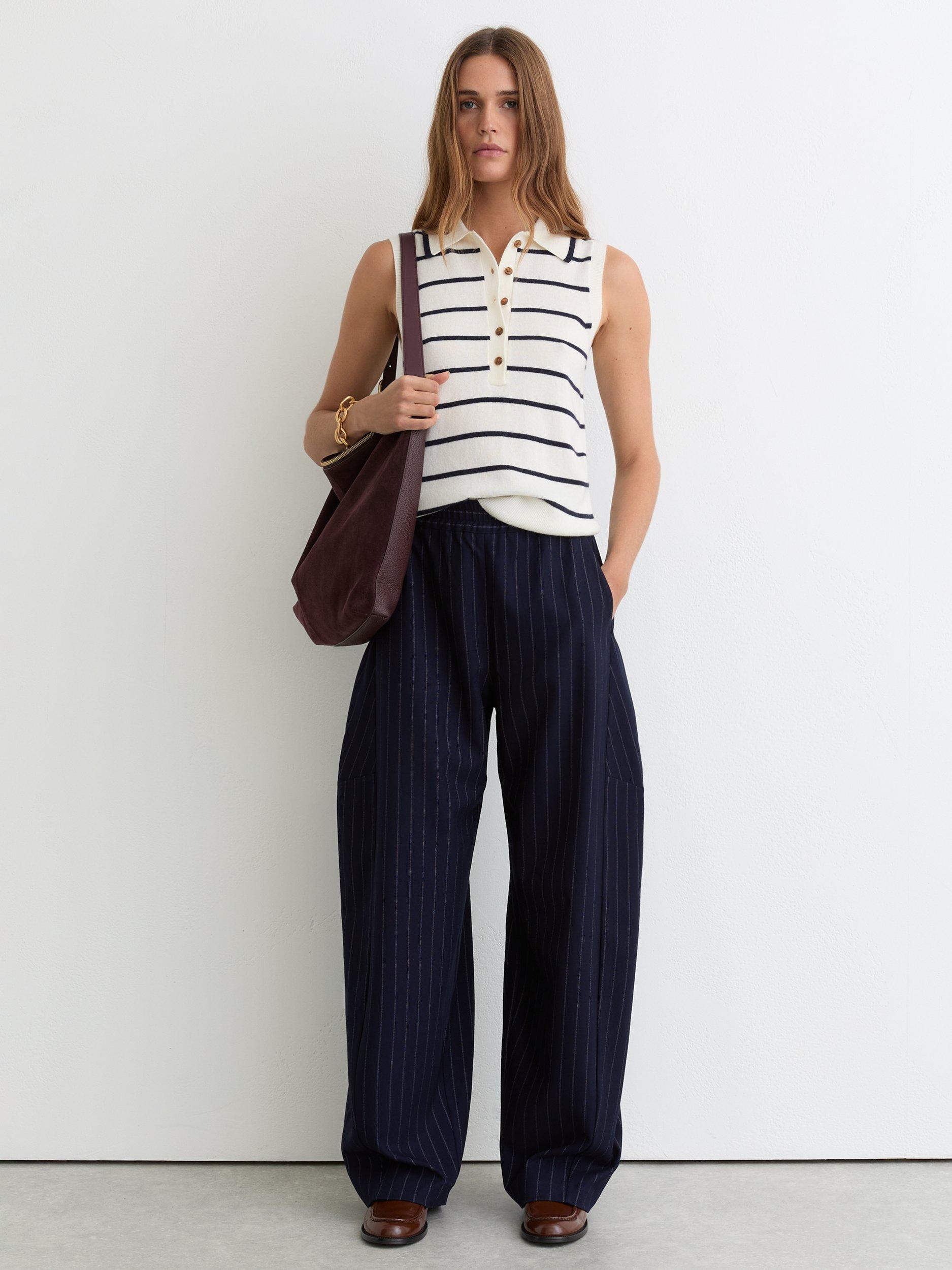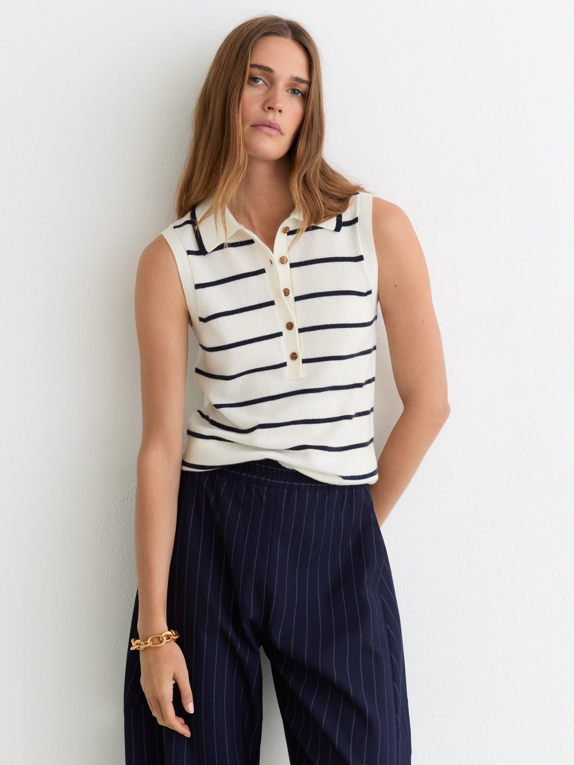 ReissSarah Stripe Button Polo Top, Ivory/Navy