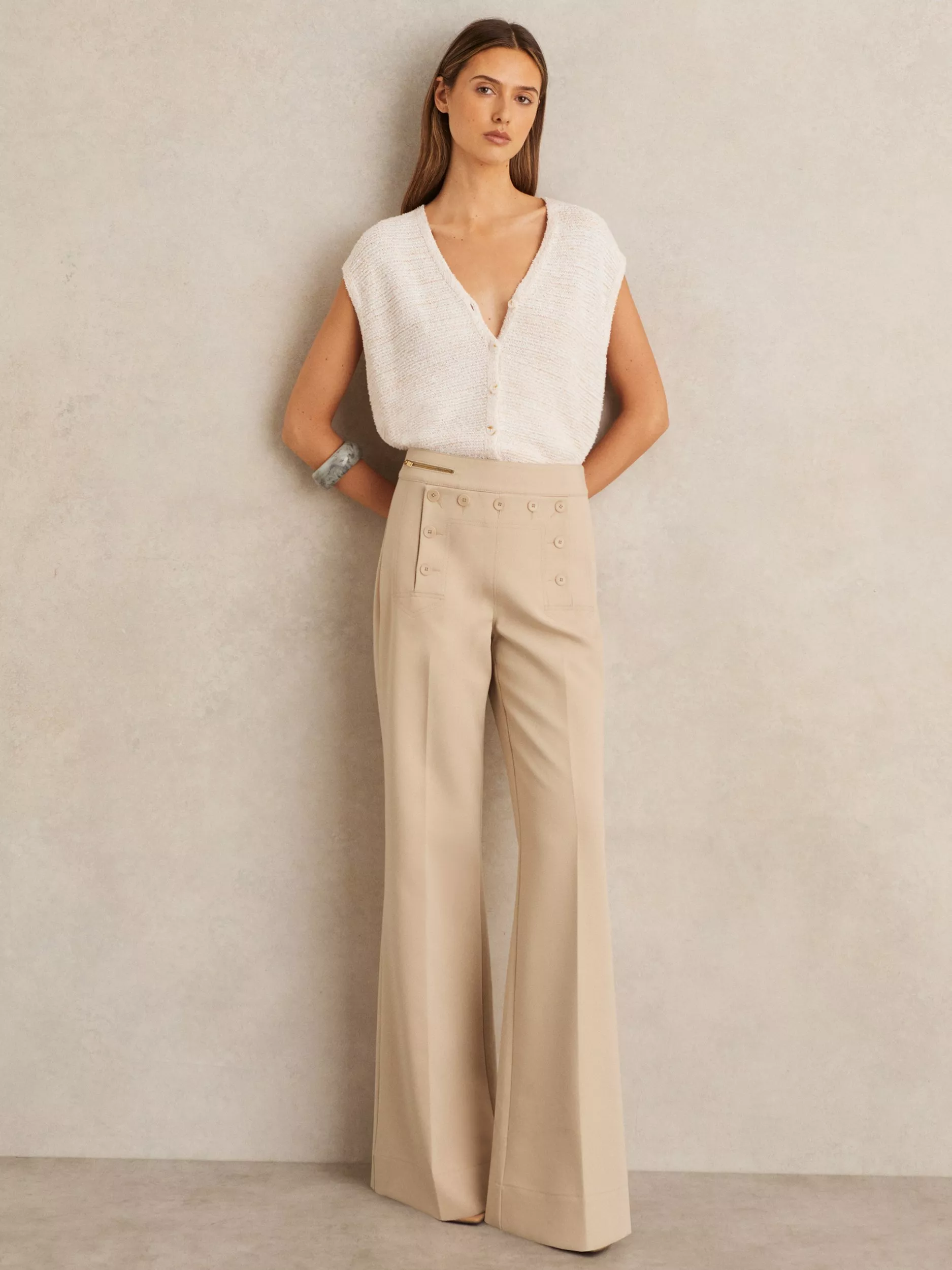 With nautical design influences, this pair of wide leg trousers by Reiss is crafted with stretch for comfort. Showcasing a buttoned front flap, this pair fastens with a zip at the waist.