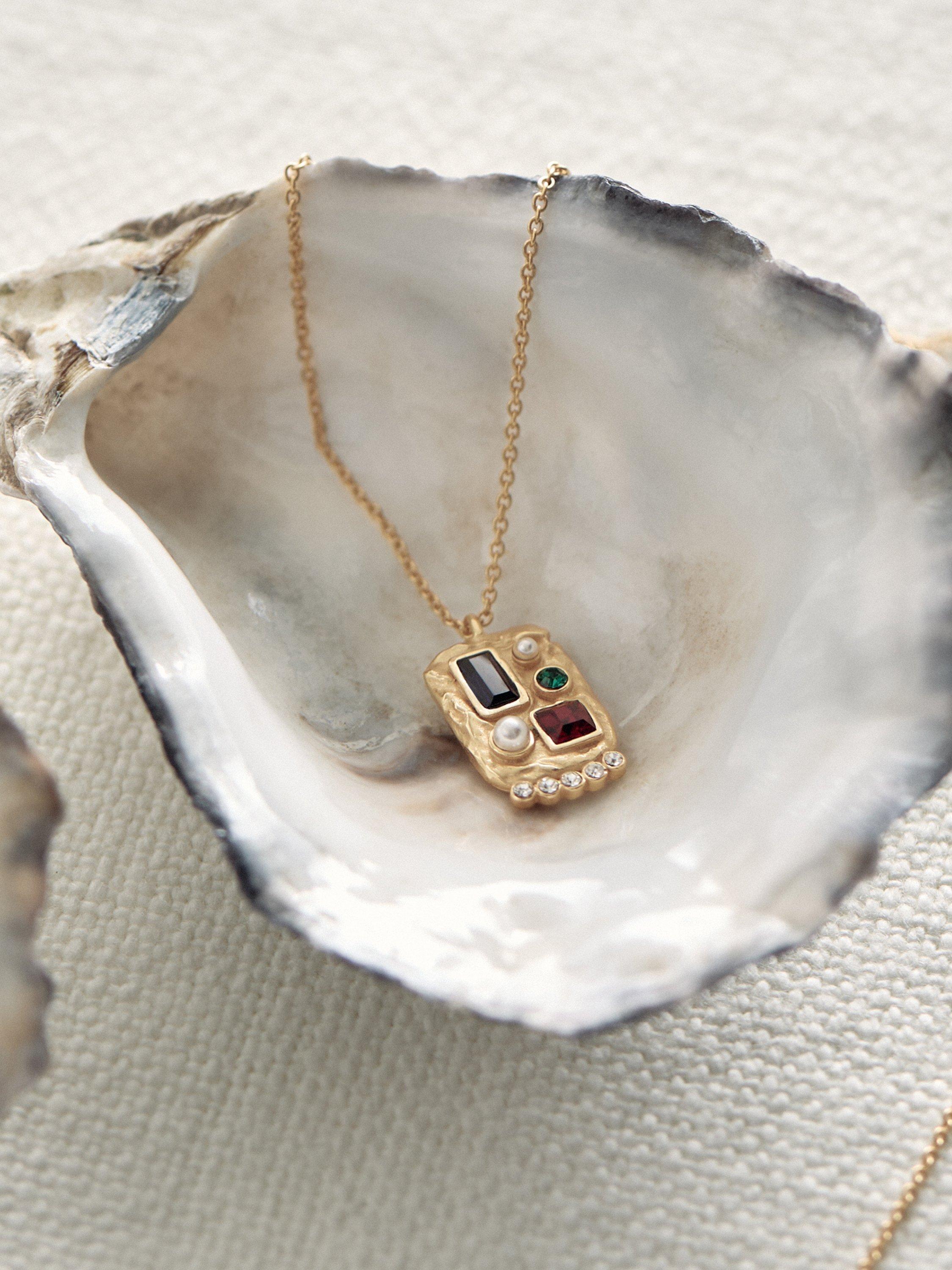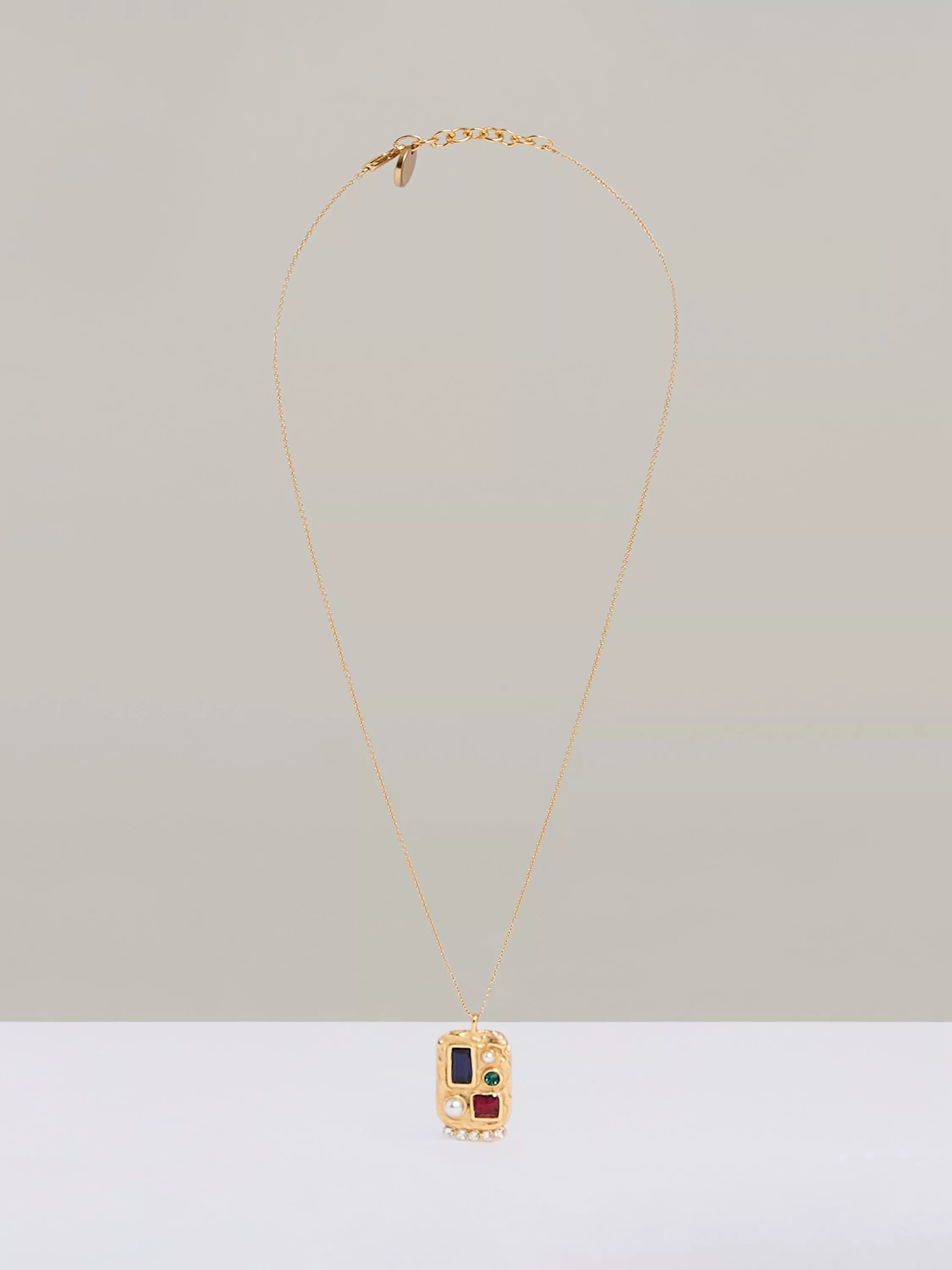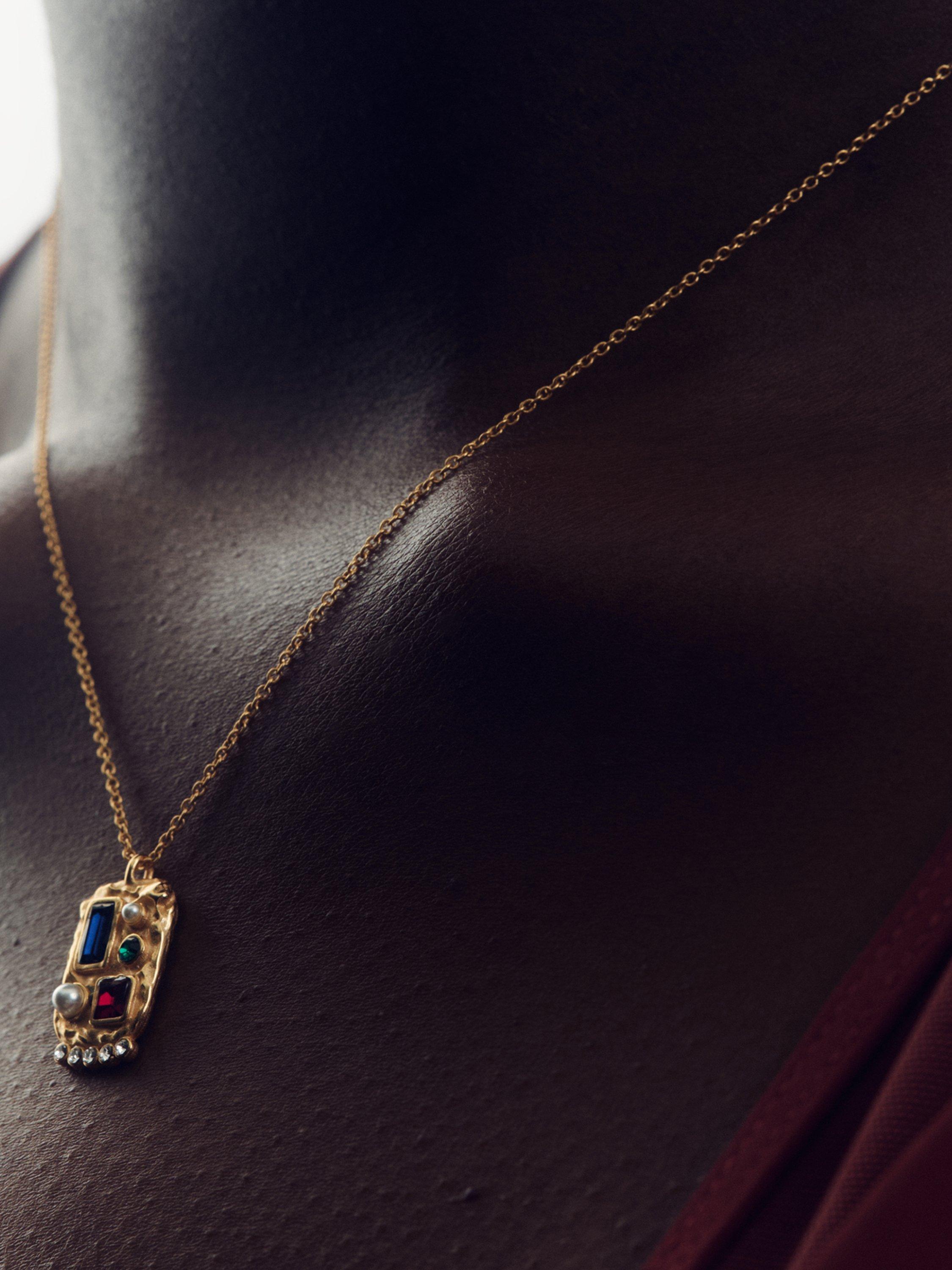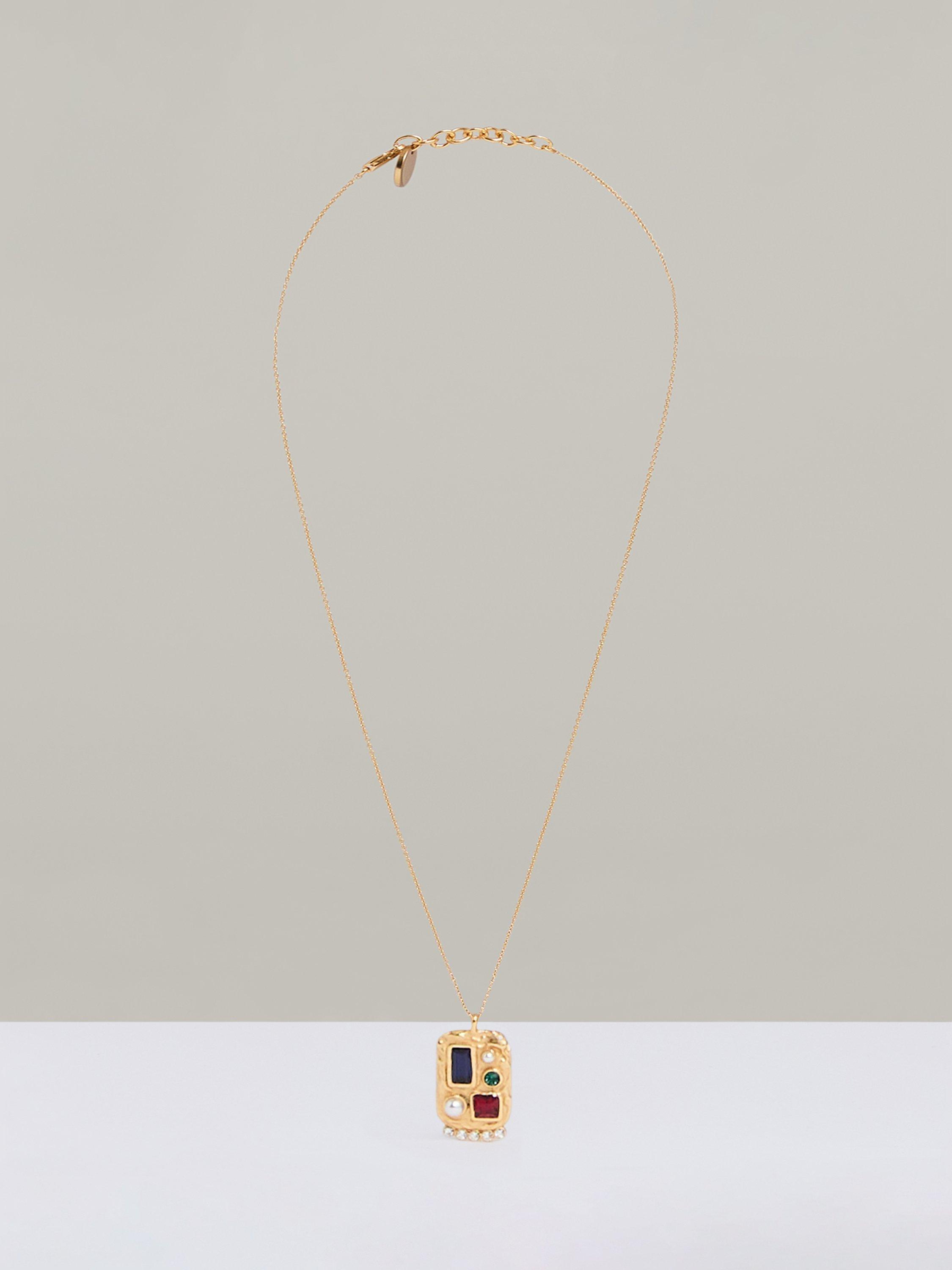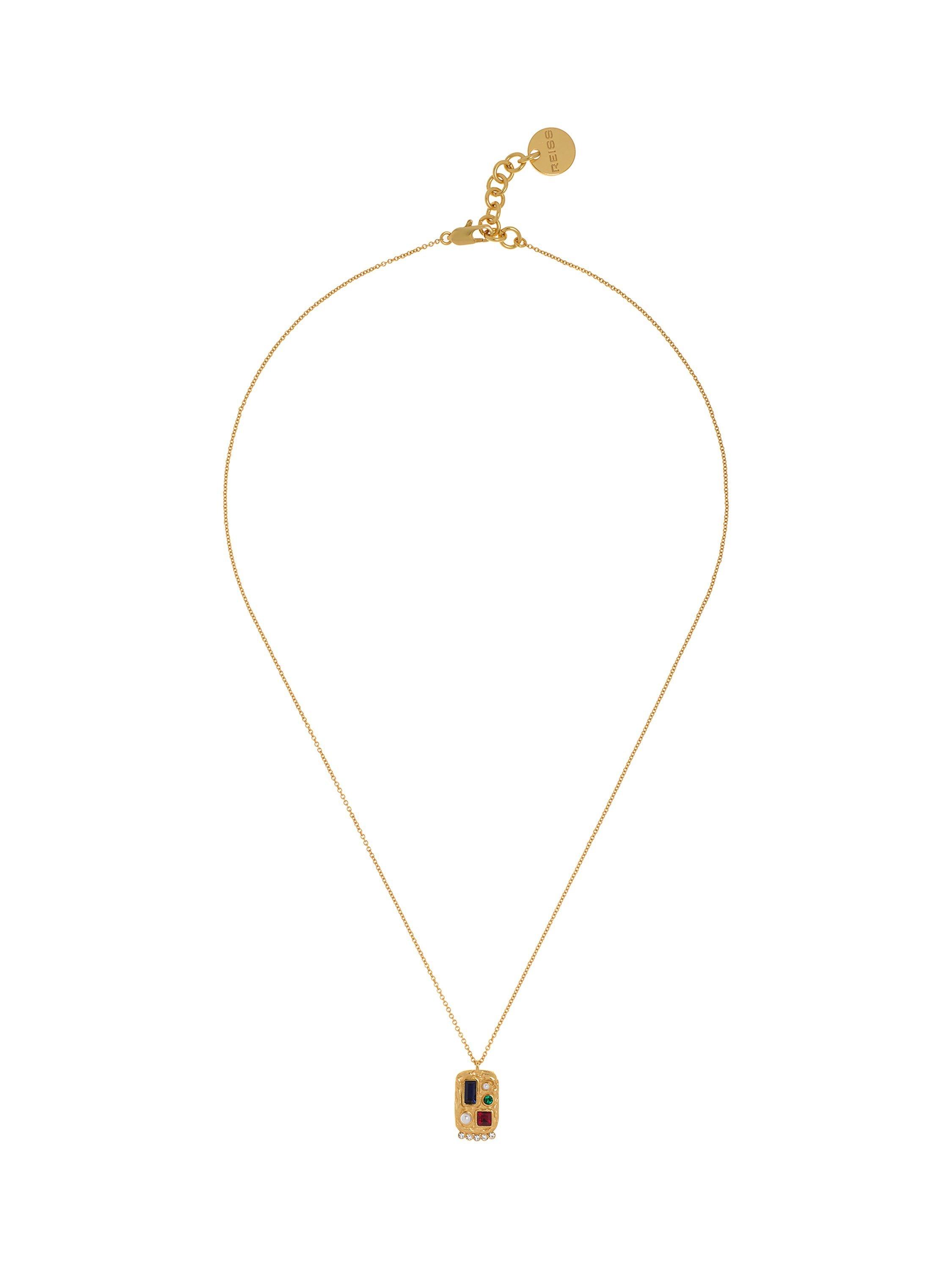 Elevate your look with Reiss' Skylar crystal rectangular pendant necklace. This stunning necklace features a collage of hand-set crystals and glass pearl cabochons, creating an elegant and eye-catching design. Finished in gold-tone plating with an adjustable chain for the perfect fit, it comes packaged in a Reiss branded gift box.