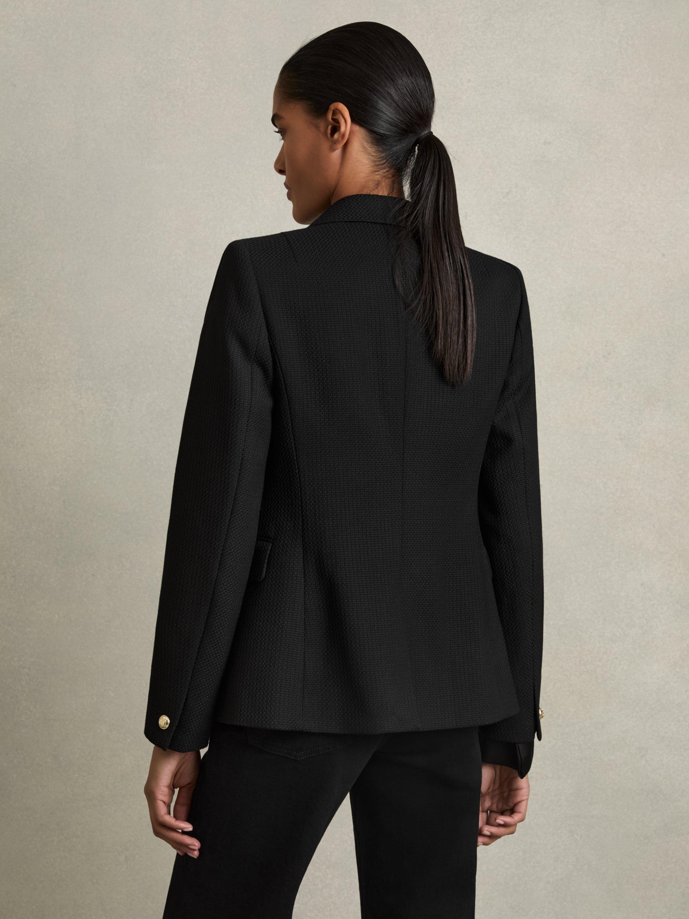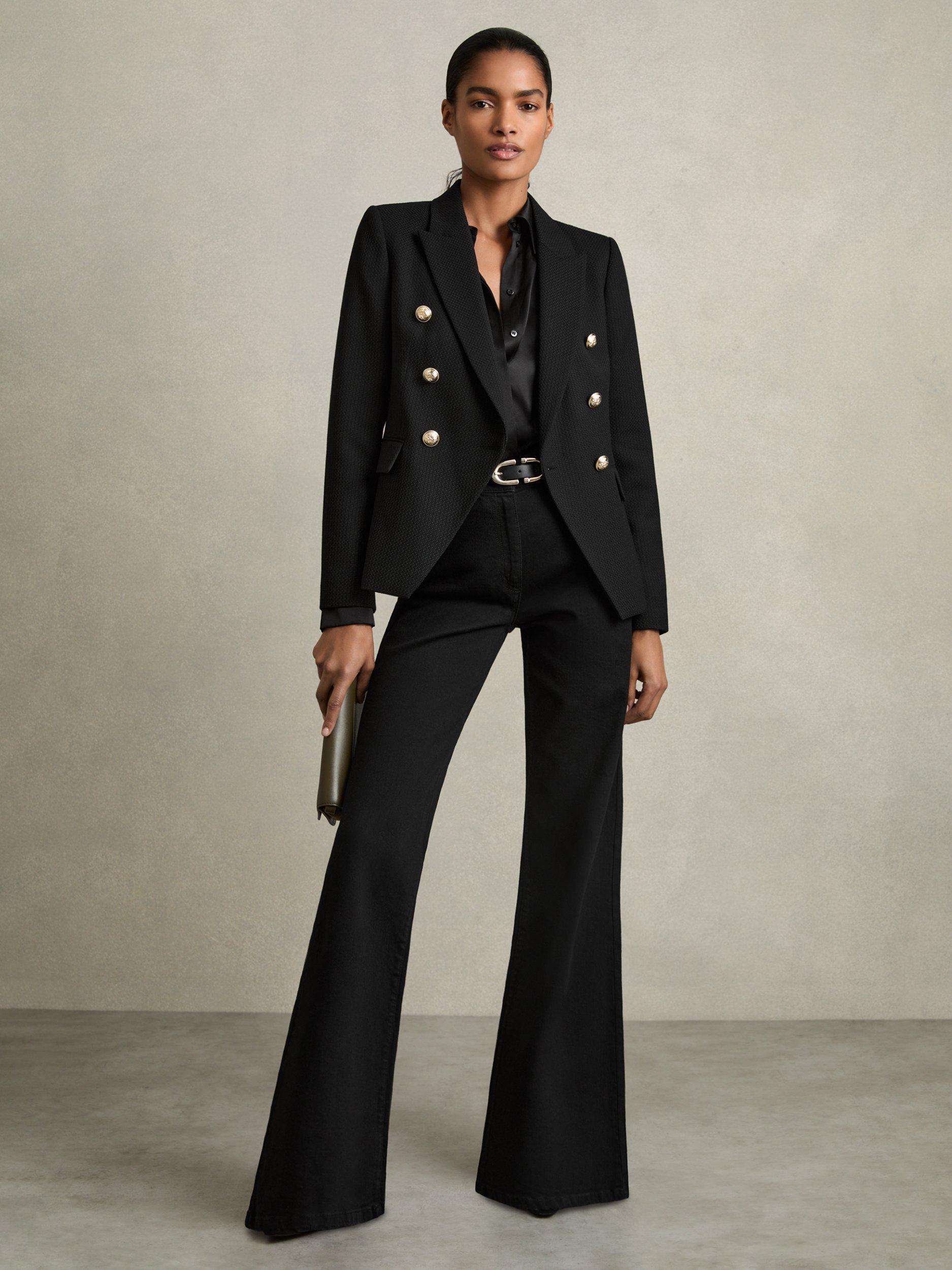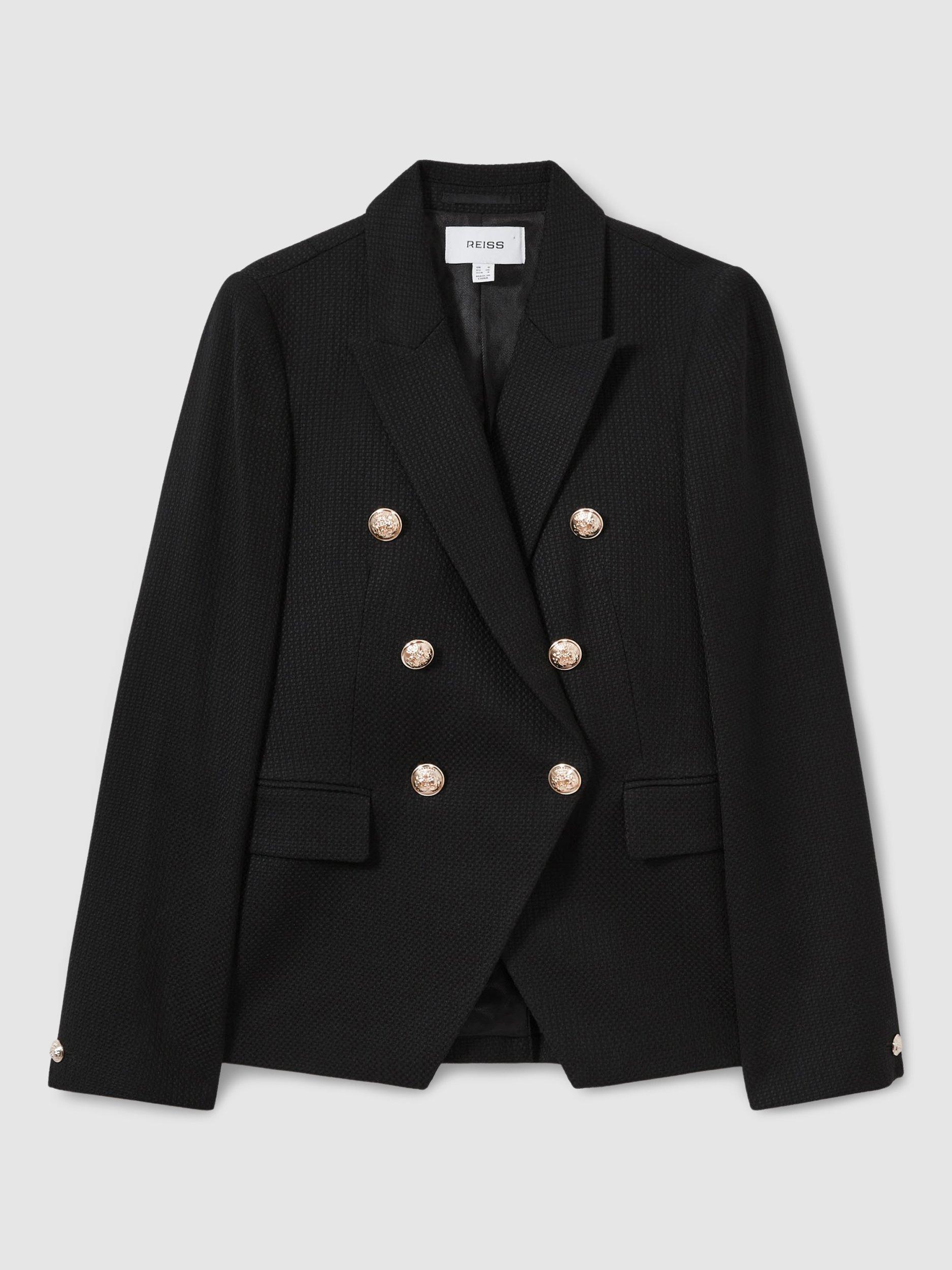 An elegant layering piece for smart events, this double-breasted blazer by Reiss sits at the hips for practical coverage. With classic collar lapels, a point wrap with gold-toned button detailing, it is made from a luxury wool blend.