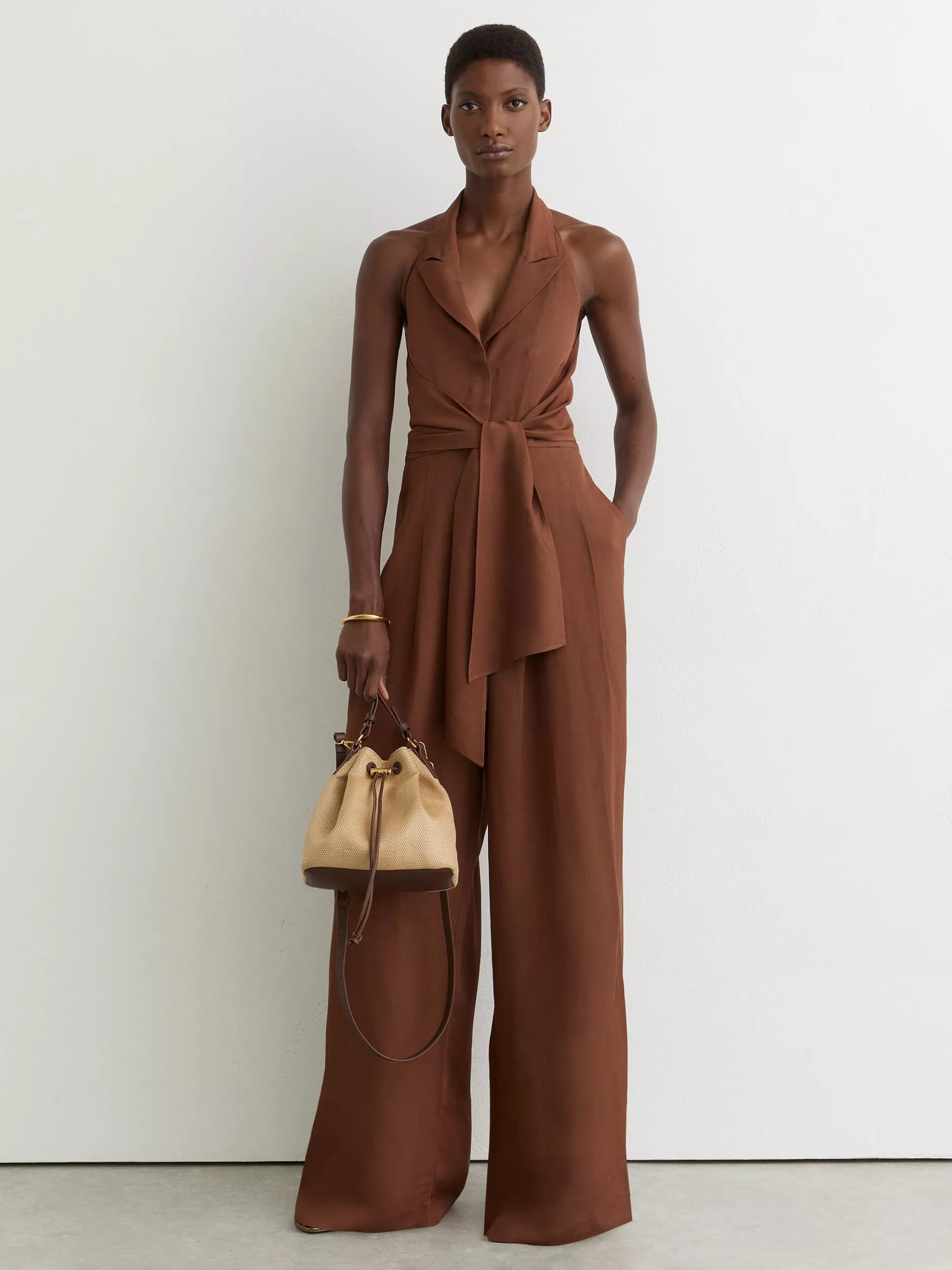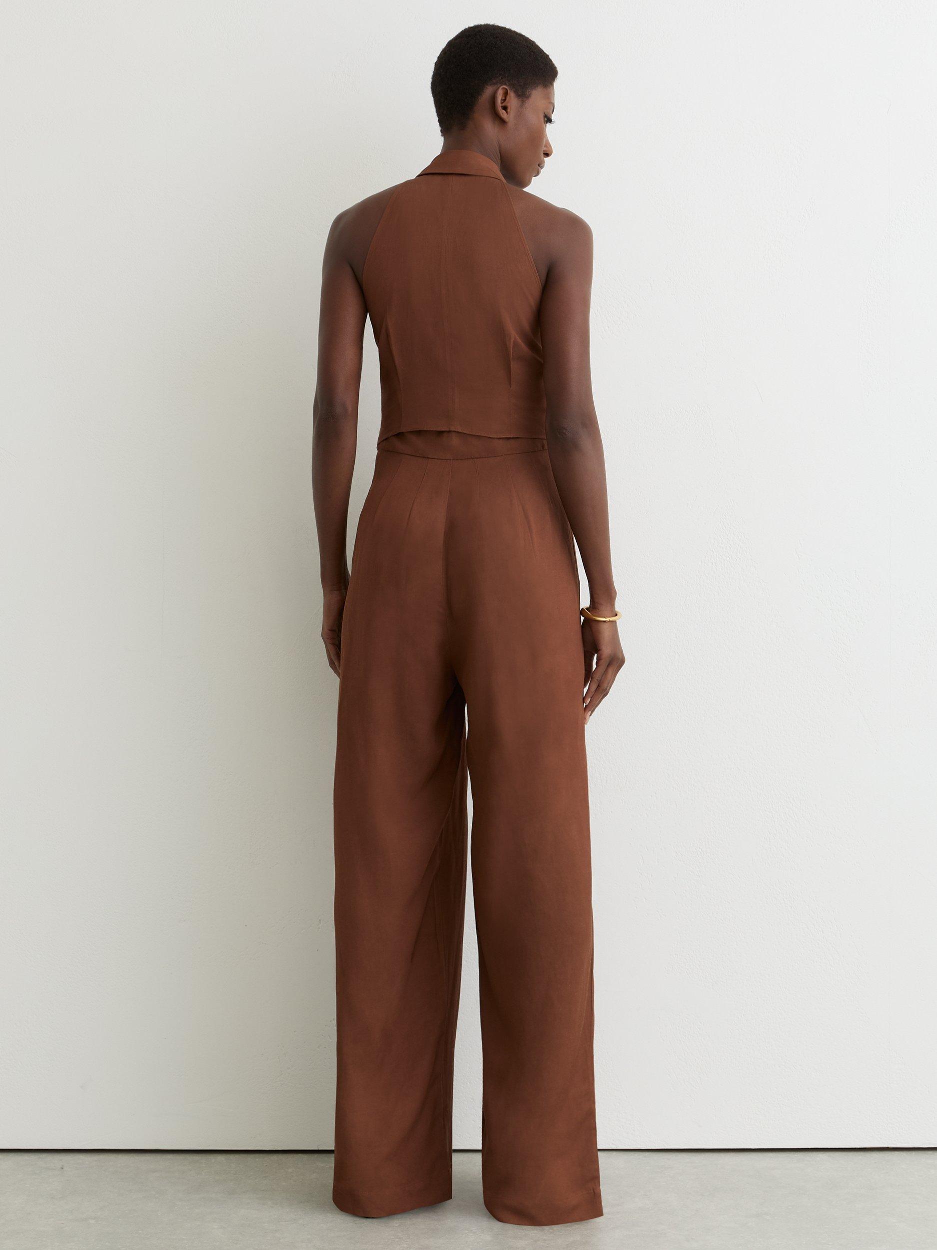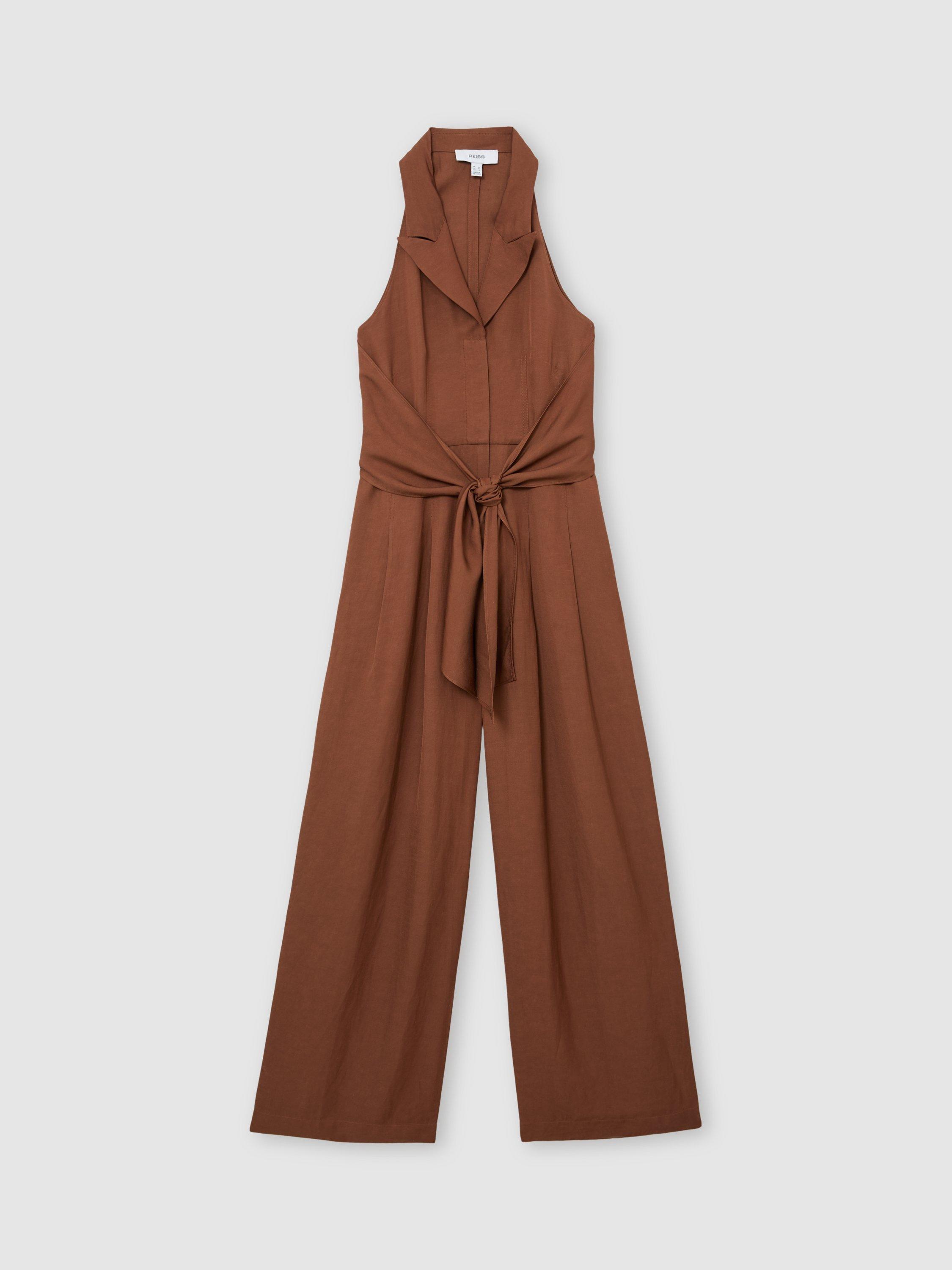 Comfort meets flair in this wide-leg jumpsuit, designed for easy movement and all-day ease in a soft viscose-linen blend. The lapel V-neck and sleeveless style is finished with a tie front and easygoing pockets.