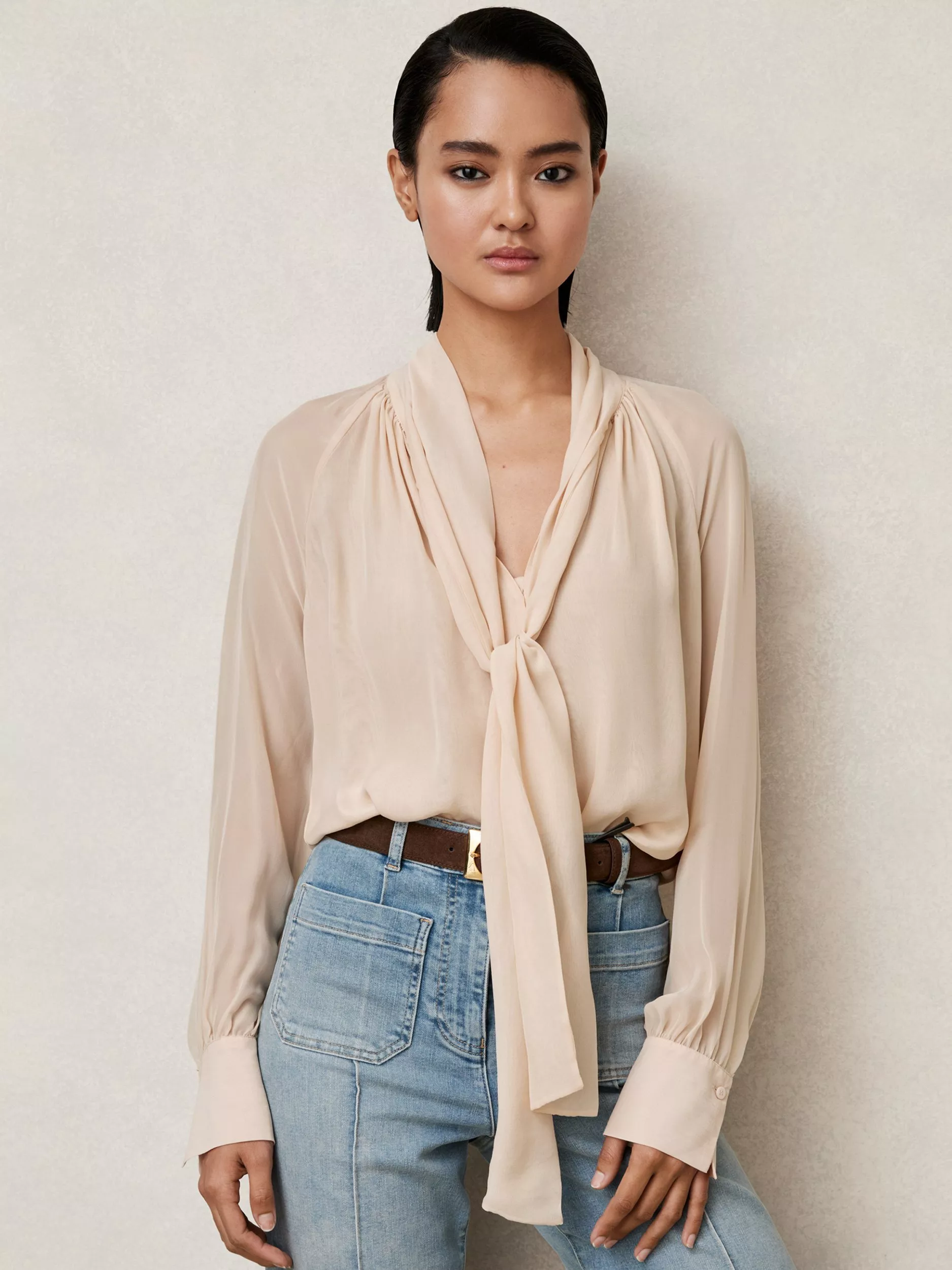Reiss offers a refined silk-blend blouse with a tie neck and long sleeves – designed for effortless style and all-day comfort. Its gently flowing silhouette makes every weekday moment both polished and relaxed.