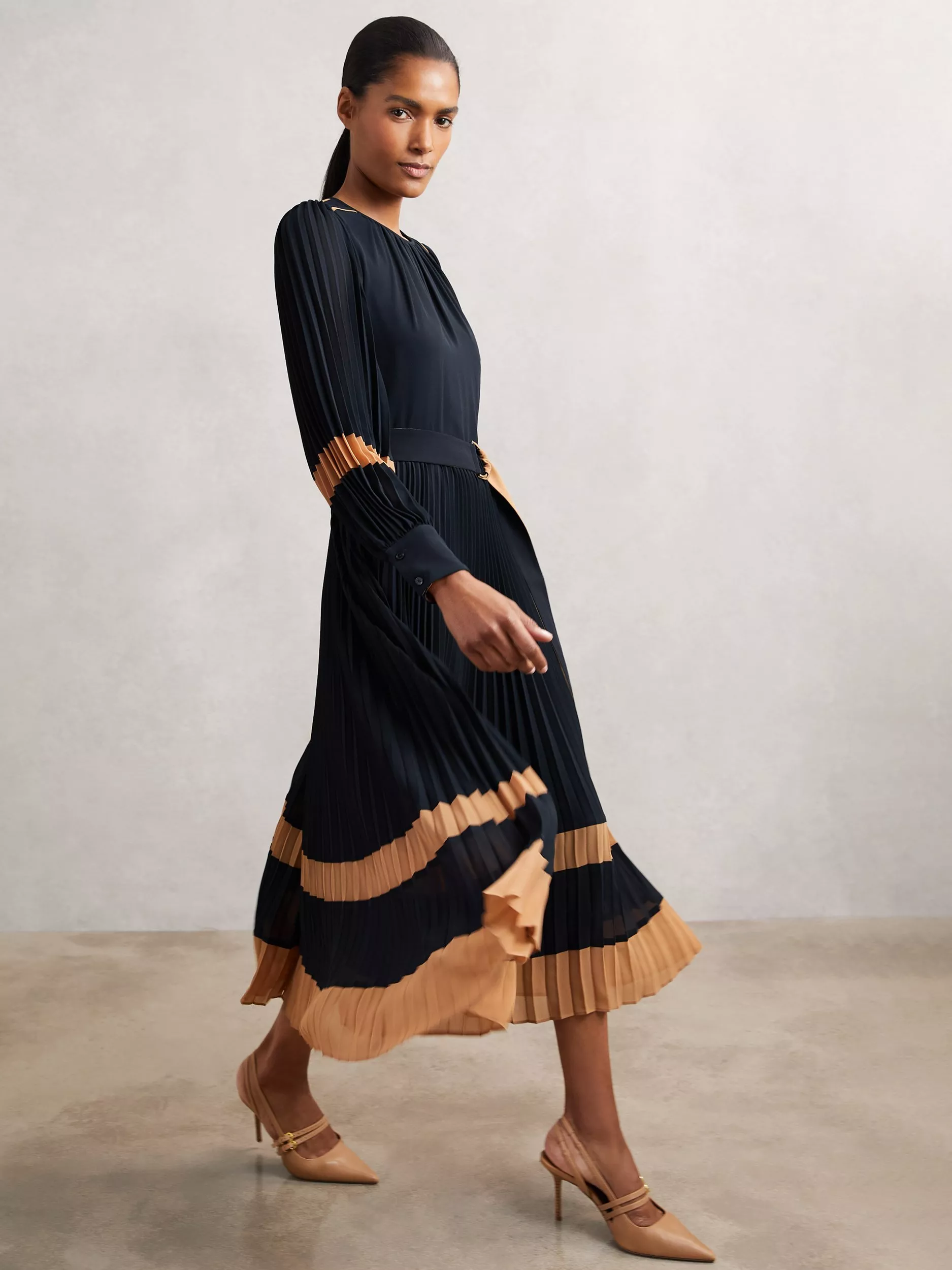A dress detailed with contrast colour stripes and all-over pleats, giving confidence from meetings to meet-ups. Its mid-length cut and D-ring belted waist make every outing feel effortless. The easy zip keeps your routine simple so you get on with your day feeling ready.