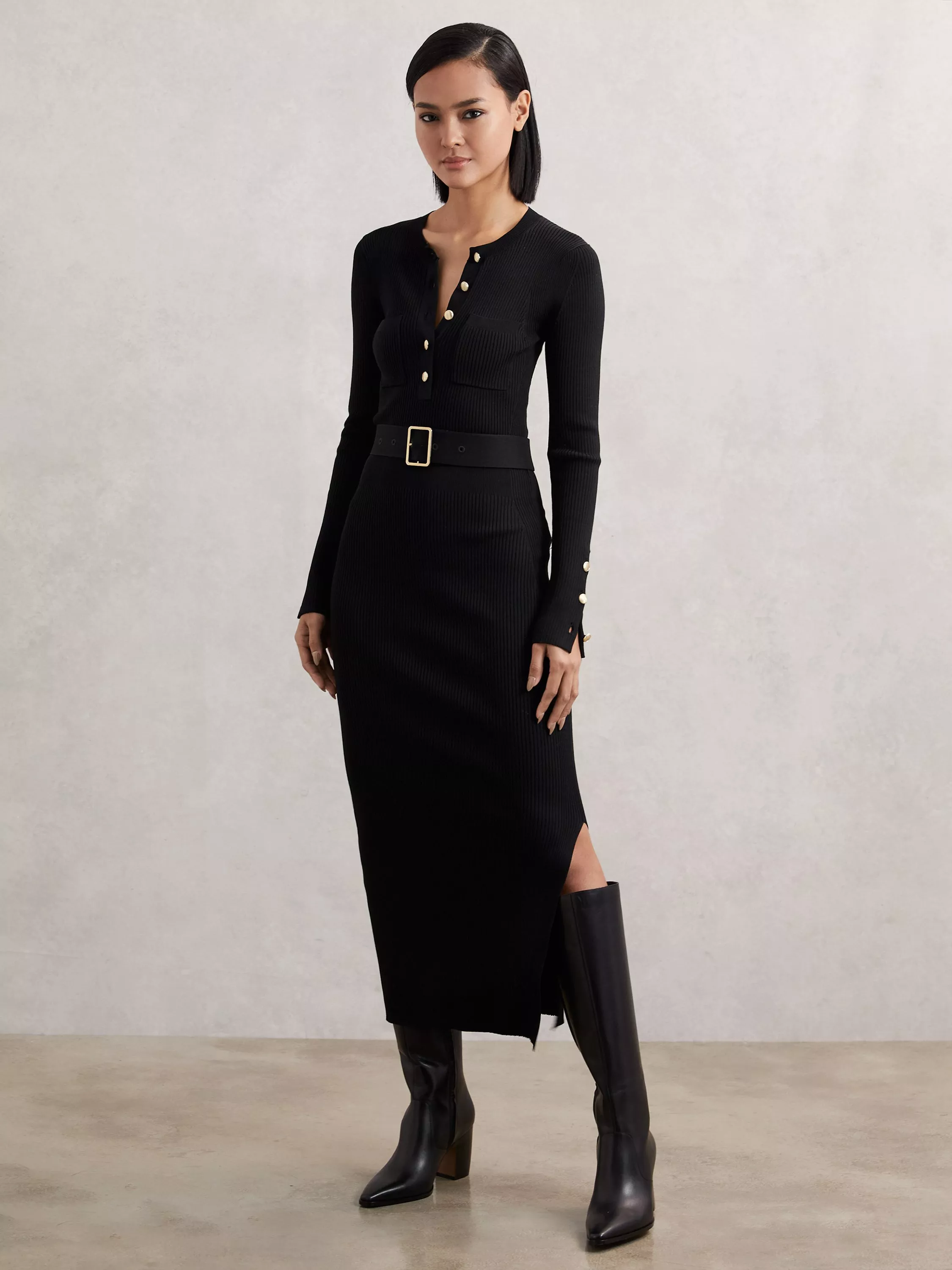 This midi sheath dress features a round neck and long sleeves in a soft viscose blend. Its streamlined silhouette, split hem and button accents help you move confidently through any day. Easy comfort meets sharp style for everyday impact.