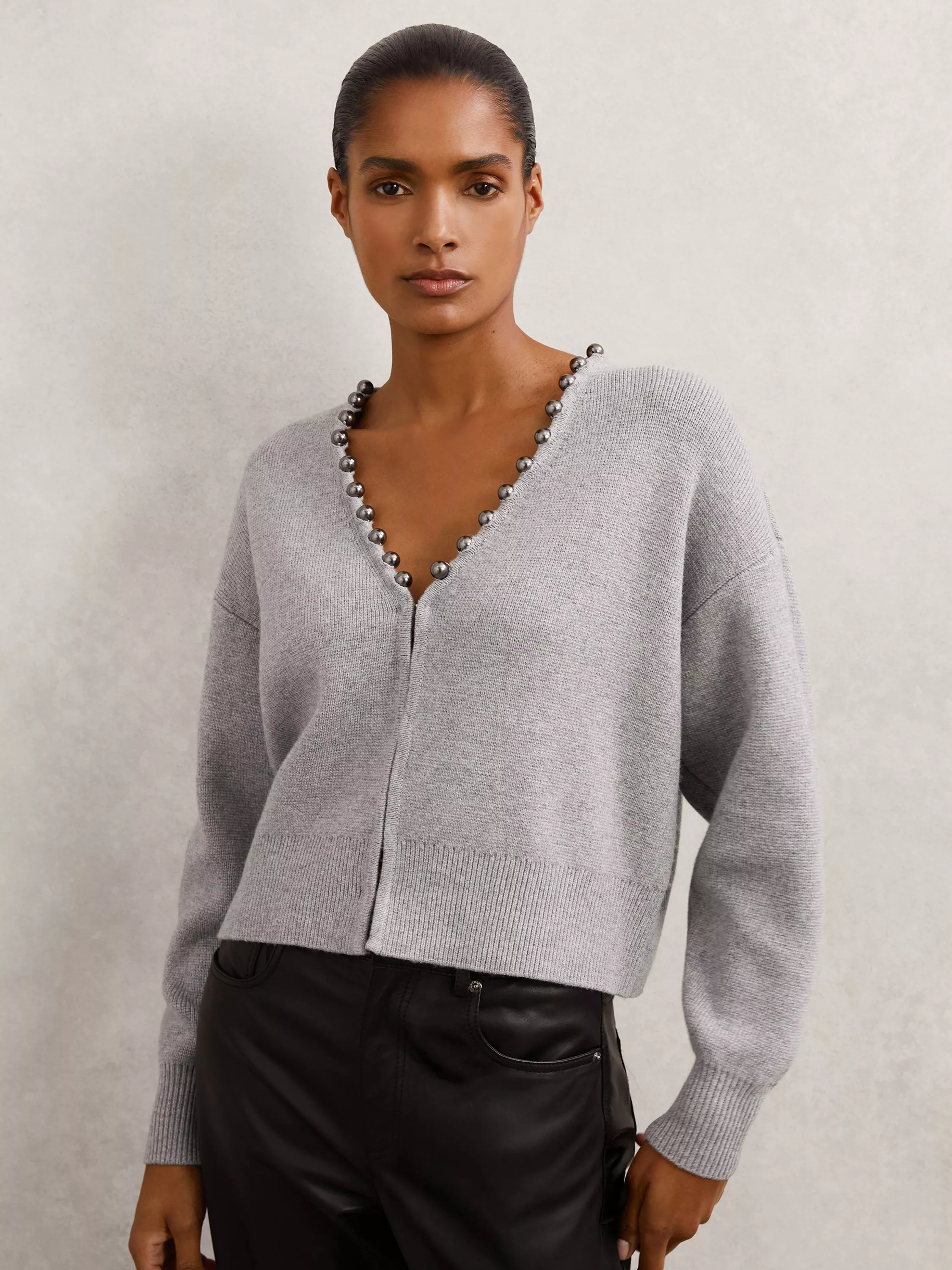 Layer up with this soft, lightweight cardigan from Reiss, with a ball embellished trim V-neck. The fine knit and zip fastening add comfort and style, making this a standout choice for your everyday moments.
