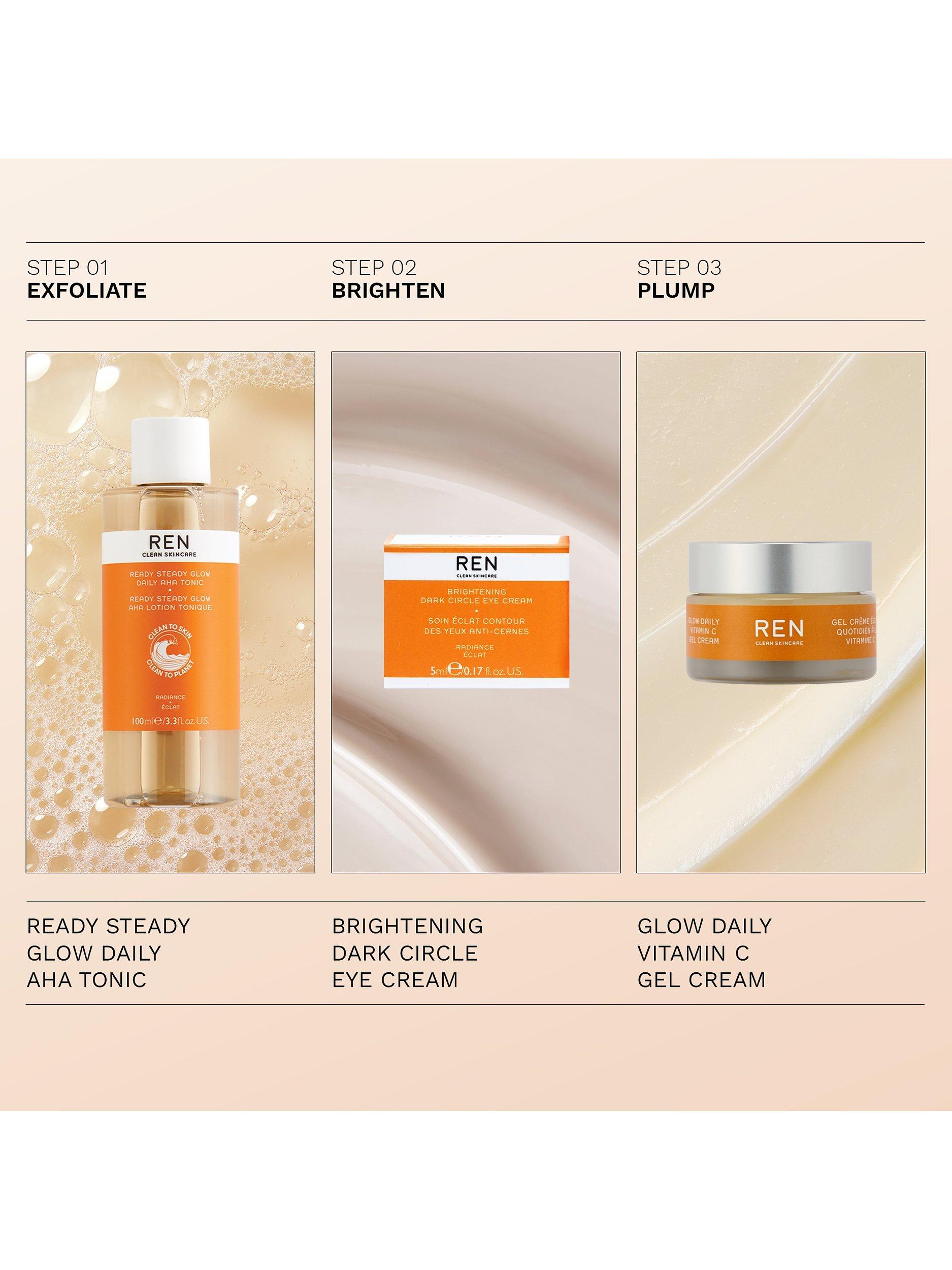 - Radiance Ready Steady Glow Daily AHA Tonic 100ml Aqua (Water), Sodium Lactate, Lactic Acid, Heptyl Glucoside, Potassium Azeloyl Diglycinate, Triethyl Citrate, Glyceryl Caprylate, Salix Nigra (Willow) Bark Extract, Benzoic Acid, Citrus Nobilis (Mandarin) Peel Oil, Citrus Aurantium Dulcis (Orange) Flower Oil, Citrus Grandis (Grapefruit) Peel Oil, Citrus Tangerina (Tangerine) Peel Oil, Heptanol, Parfum* (Fragrance), Limonene Brightening Dark Circle Eye Cream 5ml Aqua (Water), Undecane, Glycerin, Caprylic/Capric Triglyceride, Tridecane, Polyglyceryl-3 Polyricinoleate, Polyglyceryl-4 Isostearate, Shea Butter Ethyl Esters, Avena Sativa (Oat) Kernel Oil, Sorbitol, Jojoba Esters, Xylitylglucoside, Silica, Sodium Chloride, Anhydroxylitol, Coco-Caprylate/Caprate, Helianthus Annuus Seed Wax, Propanediol, Benzyl Alcohol, Hydroxyacetophenone, Stearalkonium Hectorite, Xylitol, Glycogen, Polyglyceryl-3 Ricinoleate, Disteardimonium Hectorite, Sodium Hyaluronate, Propylene Carbonate, Glucose, Sambucus Nigra Flower Extract, Acacia Decurrens Flower Wax, Polyglycerin-3, Tocopherol, Citric Acid Glow Daily Vitamin C Gel Cream 15ml Aqua (Water), Cetearyl Ethylhexanoate, Glycerin, Lauryl Laurate, Cetearyl Alcohol, Tapioca Starch, Ascorbyl Glucoside, Hydroxyacetophenone, Carbomer, Phenoxyethanol, Cetearyl Glucoside, Citrus Grandis (Grapefruit) Peel Oil, Glycogen, Hippophaë Rhamnoides Oil, Citrus Aurantium Dulcis (Orange) Flower Oil, Parfum* (Fragrance), Tocopherol, Citrus Nobilis(Mandarin Orange) Peel Oil, Citrus Tangerina (Tangerine) Peel Oil, Magnesium Ascorbyl Phosphate, Diglucosyl Gallic Acid, Ammonium Bicarbonate, Glucose, Helianthus Annuus (Sunflower) Seed Oil, Rosmarinus Officinalis (Rosemary) Leaf Extract, Sodium Hydroxide, Citral, Limonene, Linalool* 100% Natural Fragrance - Parfum 100% Naturel