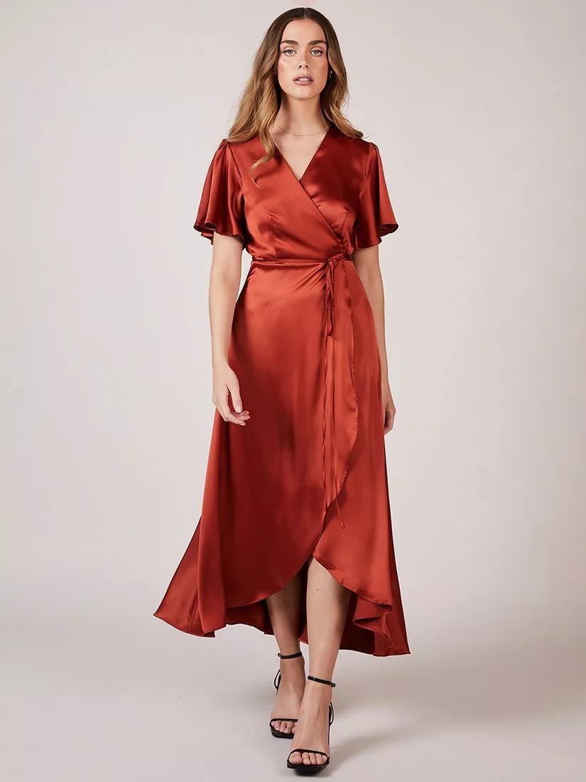 Universally flattering the Florence is an ankle length v neck wrap dress with floaty sleeves and a tie waist. Designed in London and crafted from the most beautiful flowing crepe fabric the Florence is for bridesmaids with serious dress game.