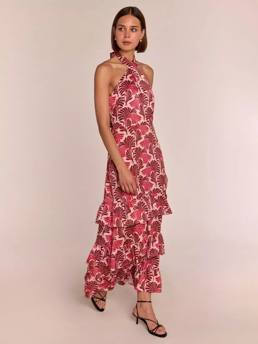 This fun midi-length halterneck dress features a flattering cross-front detail and a zip-up back for a perfect fit. Designed for comfort as well as compliments, the Jamie includes an elasticated section at the back, while the tiered skirt adds flow and movement with every step. The vibrant fan print brings a splash of colour, making it the perfect choice for a destination wedding guest or any special event under the sun.