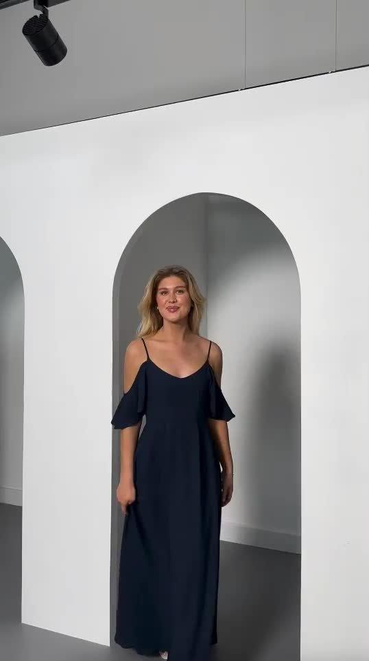 The Mykonos is a floor length gown with a v neck spaghetti straps and cold shoulder sleeves. The high waistline incorporates darts for a flattering fit and the back is finished with a concealed zip. Perfect for channelling your inner bohemian this is one hell of a cool bridesmaids dress.