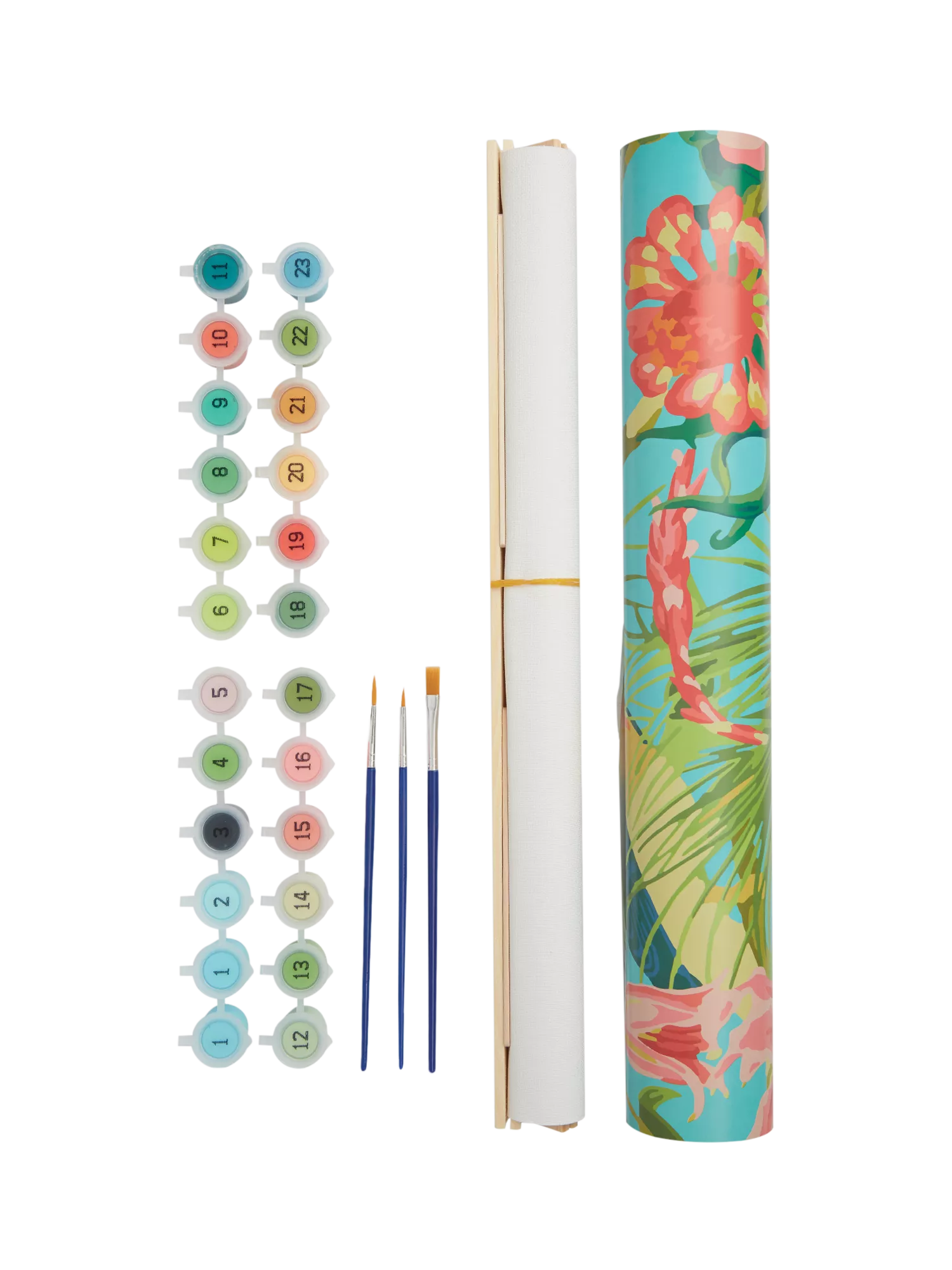 This fun "Exotic Birds' design includes a canvas, 23x paints and 3x brushes.