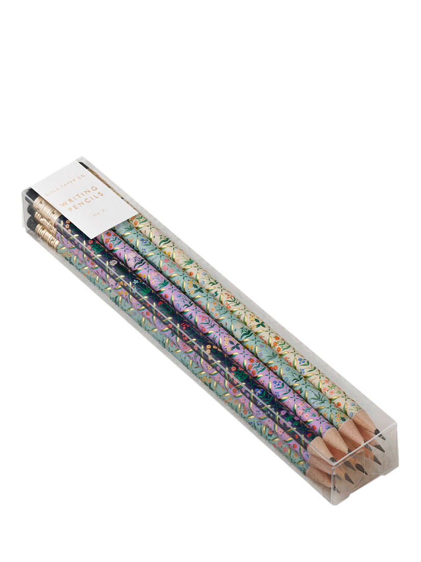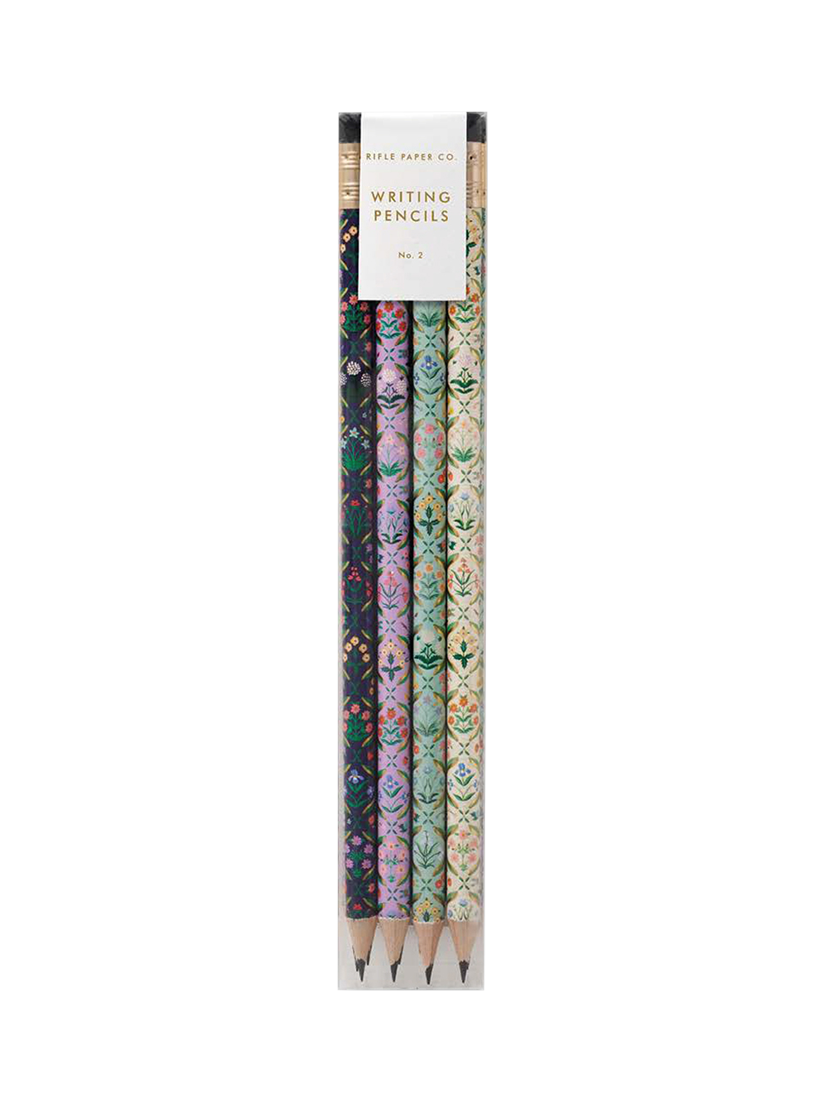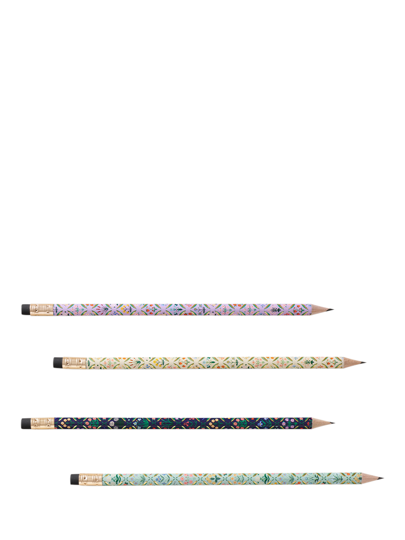 The Estee Pencil Set from Rifle Paper Co. includes a mix of soft, floral designs accented with gold foil. Each pencil comes pre-sharpened with a coordinating eraser—perfect for notes, sketches, or adding a little beauty to your daily desk setup.