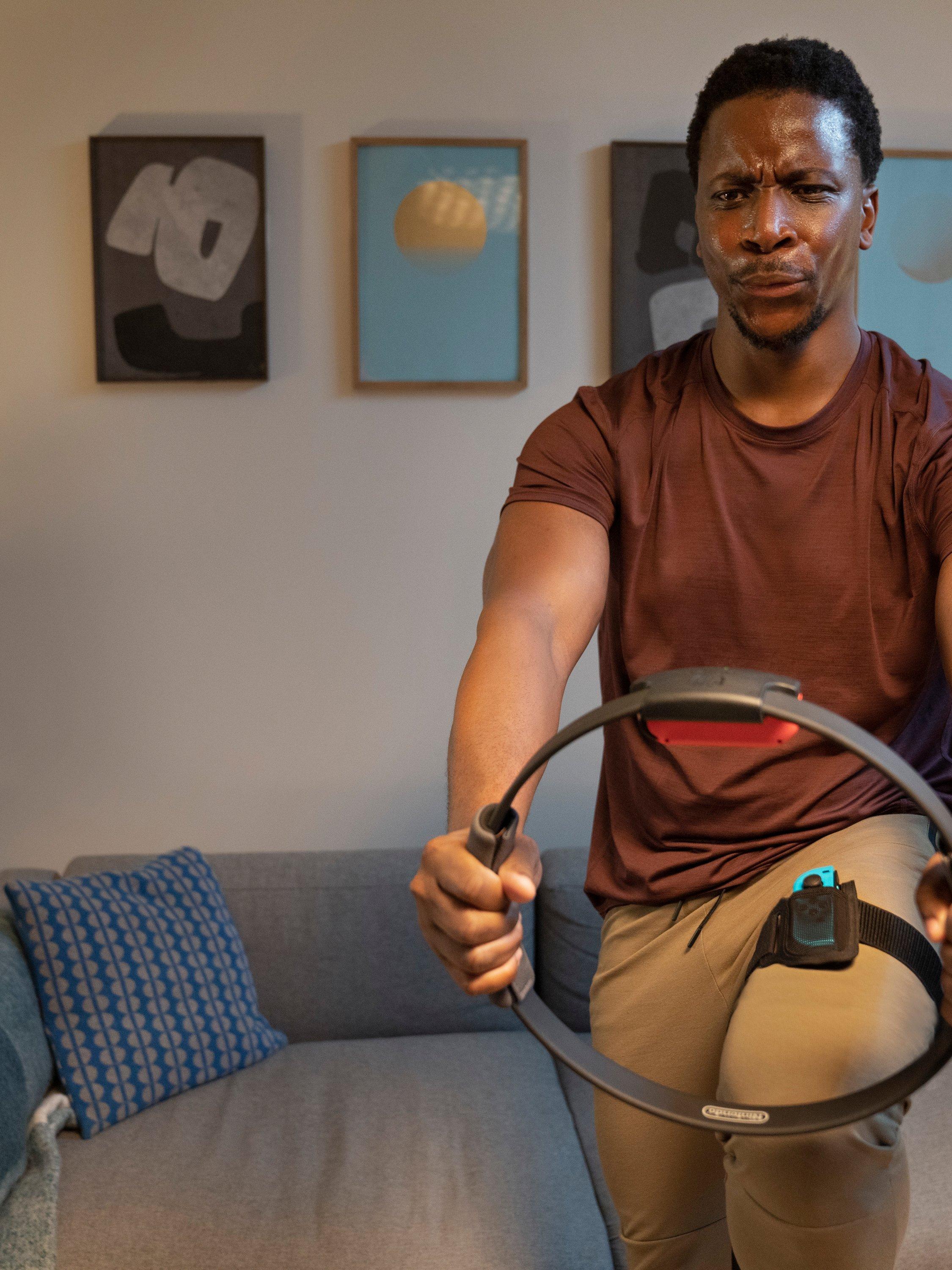 Ring Fit Adventure includes the game, a Ring-Con controller and a Leg Strap – just add a Switch into the mix, attach your Joy-Cons to the Ring-Con controller and Leg Strap and you’re all set to play and keep fit.