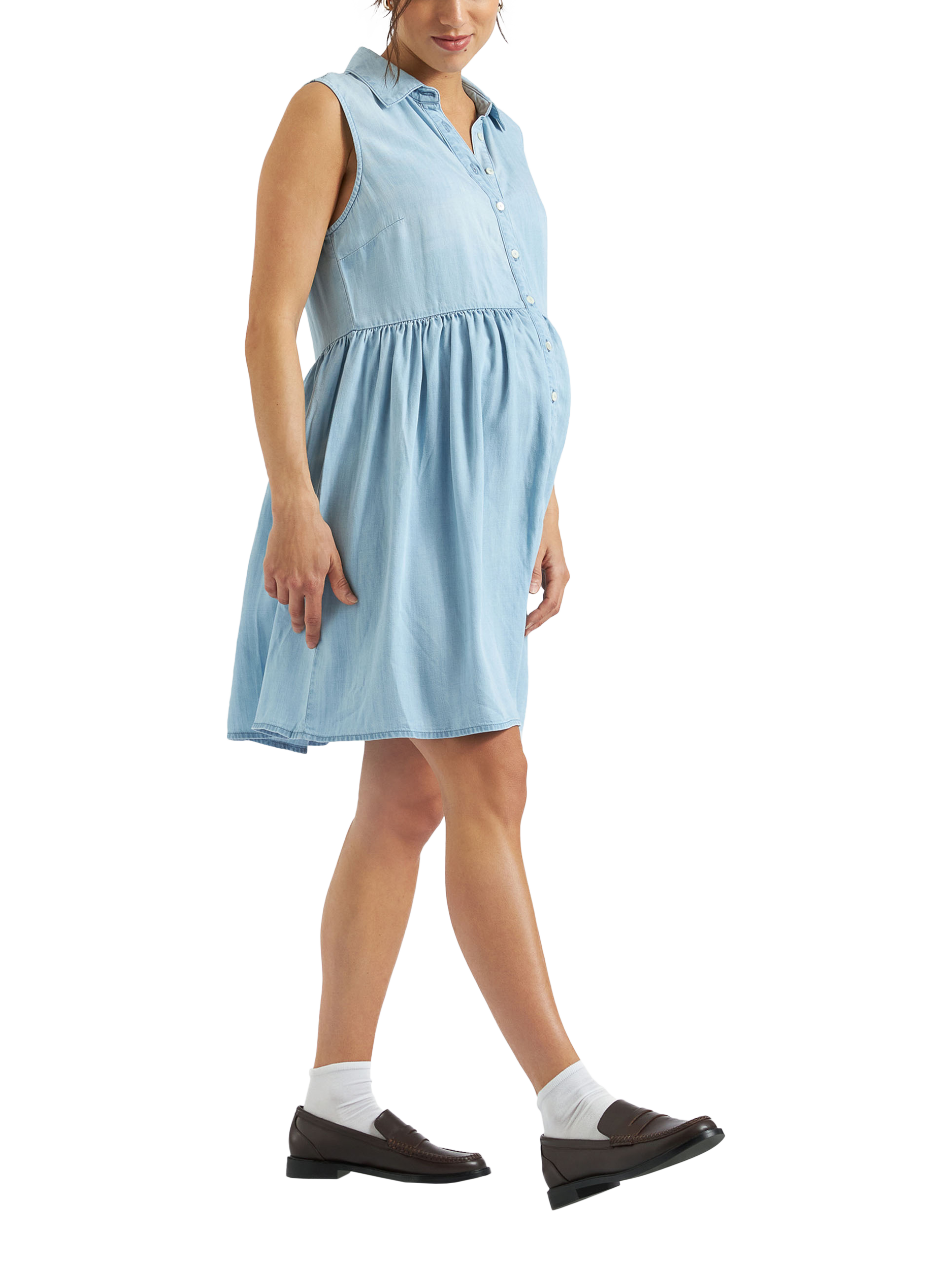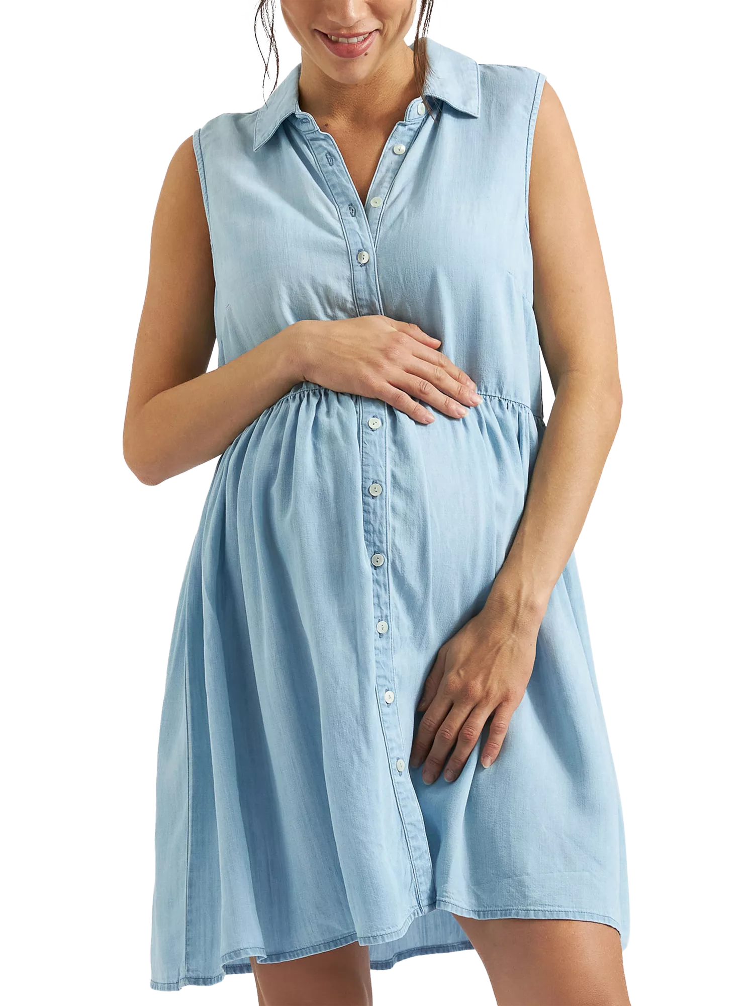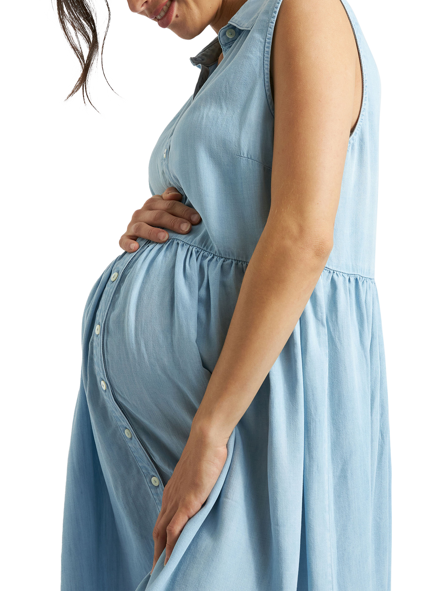 Everyone's favourite Bec Chambray fit is now available in a semi-structured, sleeveless shirt-dress. Featuring an empire seam and gathered skirt that can be buttoned down, or worn open as a duster over your swimsuit or shorts. Made from luxuriously soft woven Tencel that glides gently on your skin - it's the easiest throw-on-and-go dress for expecting mothers, and those nursing thanks to the buttons!