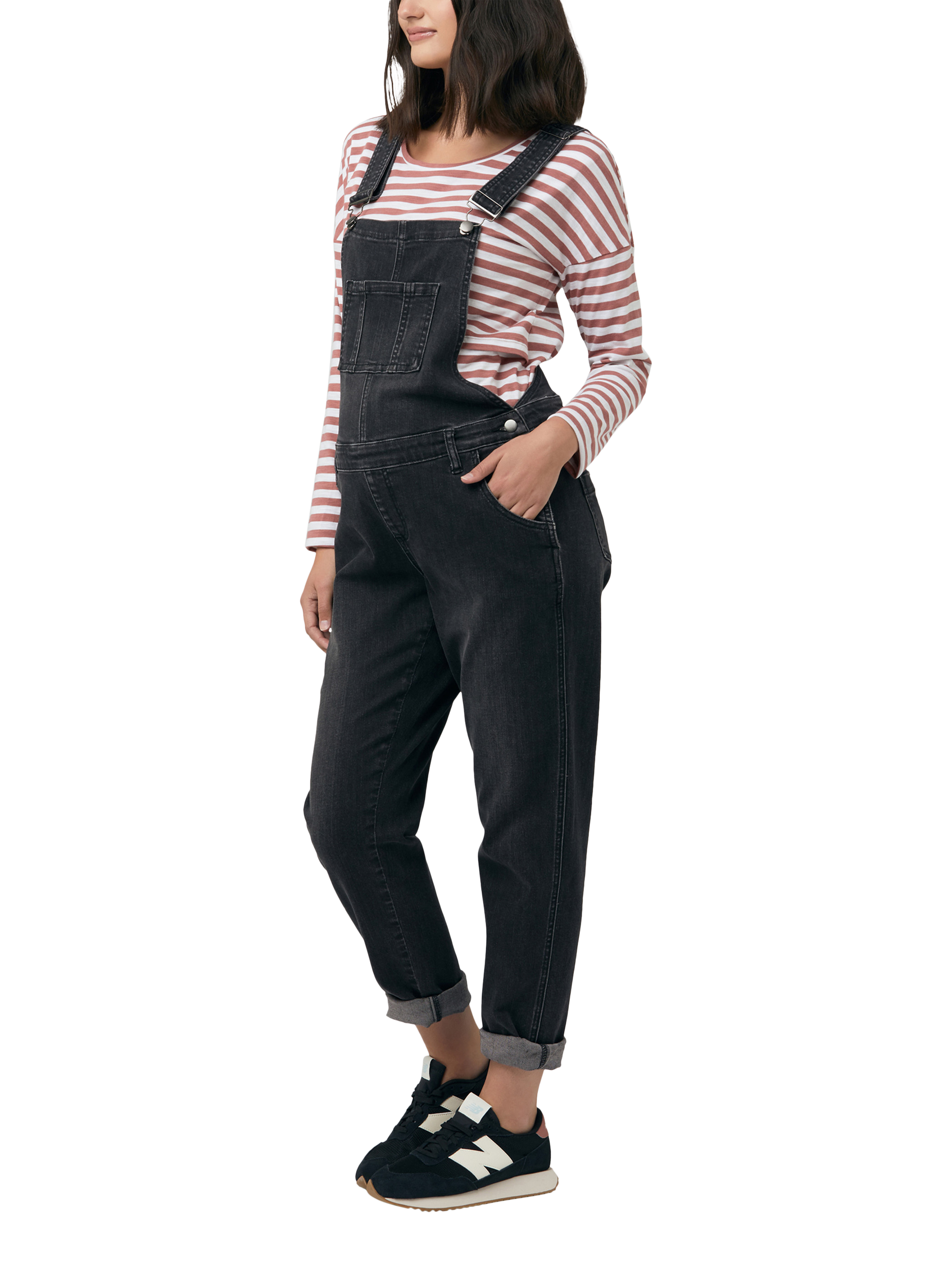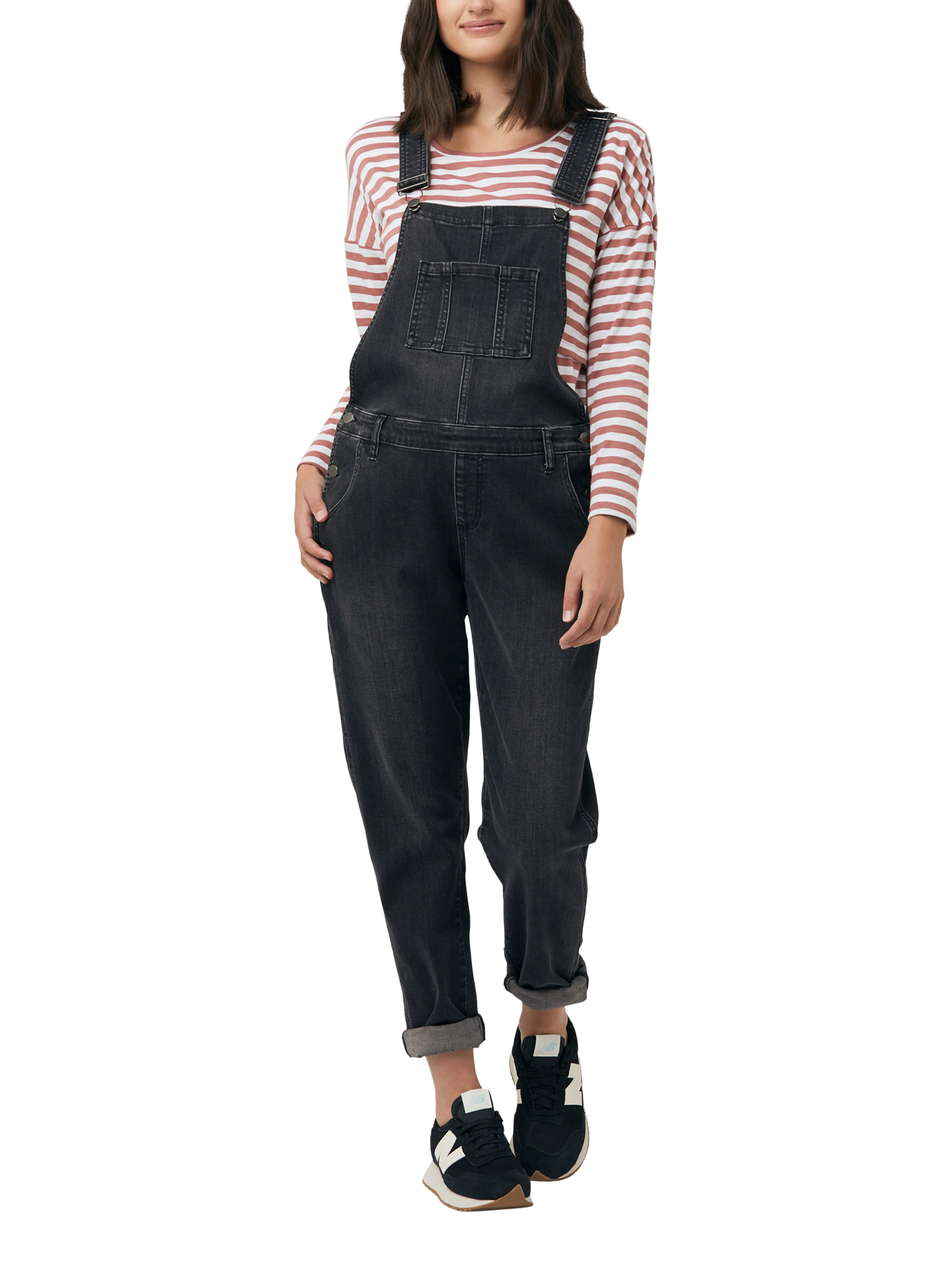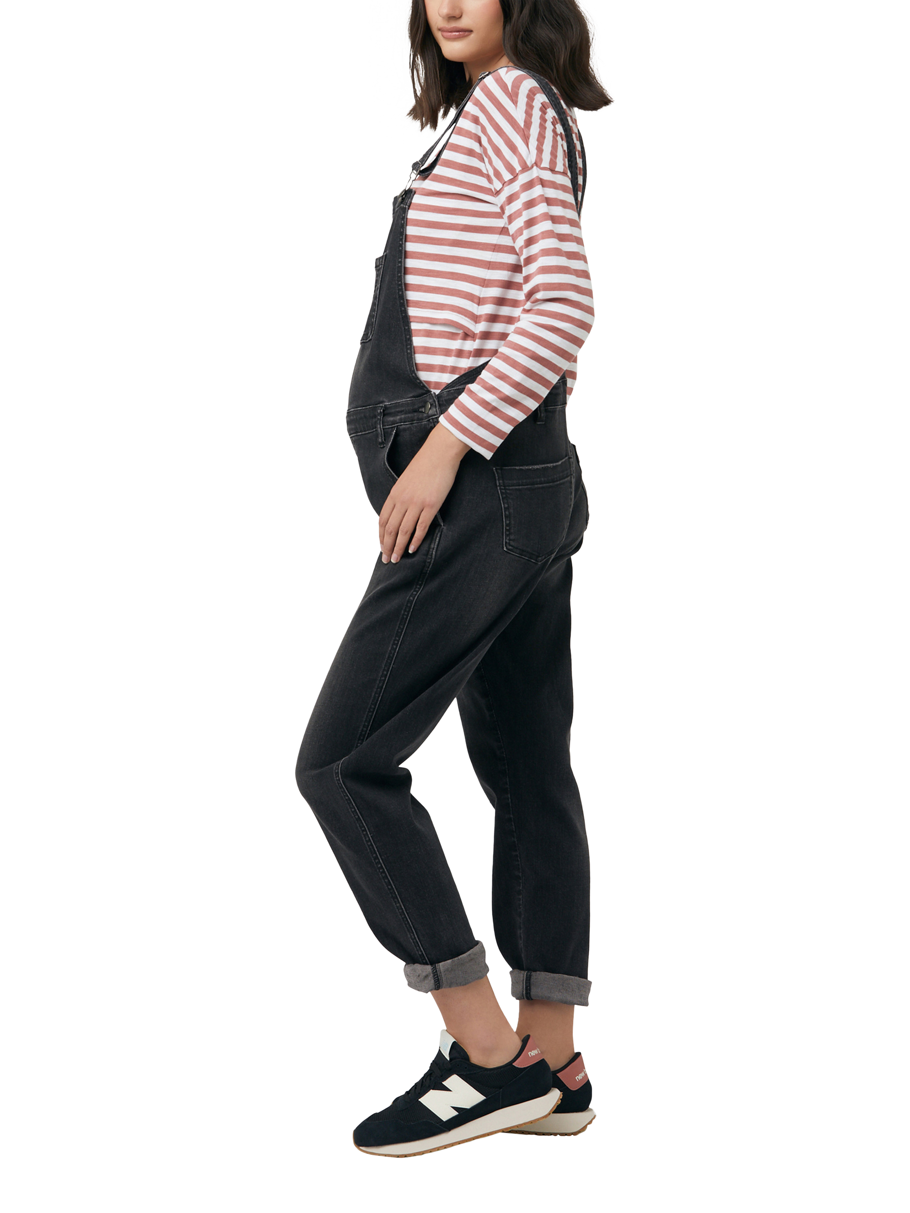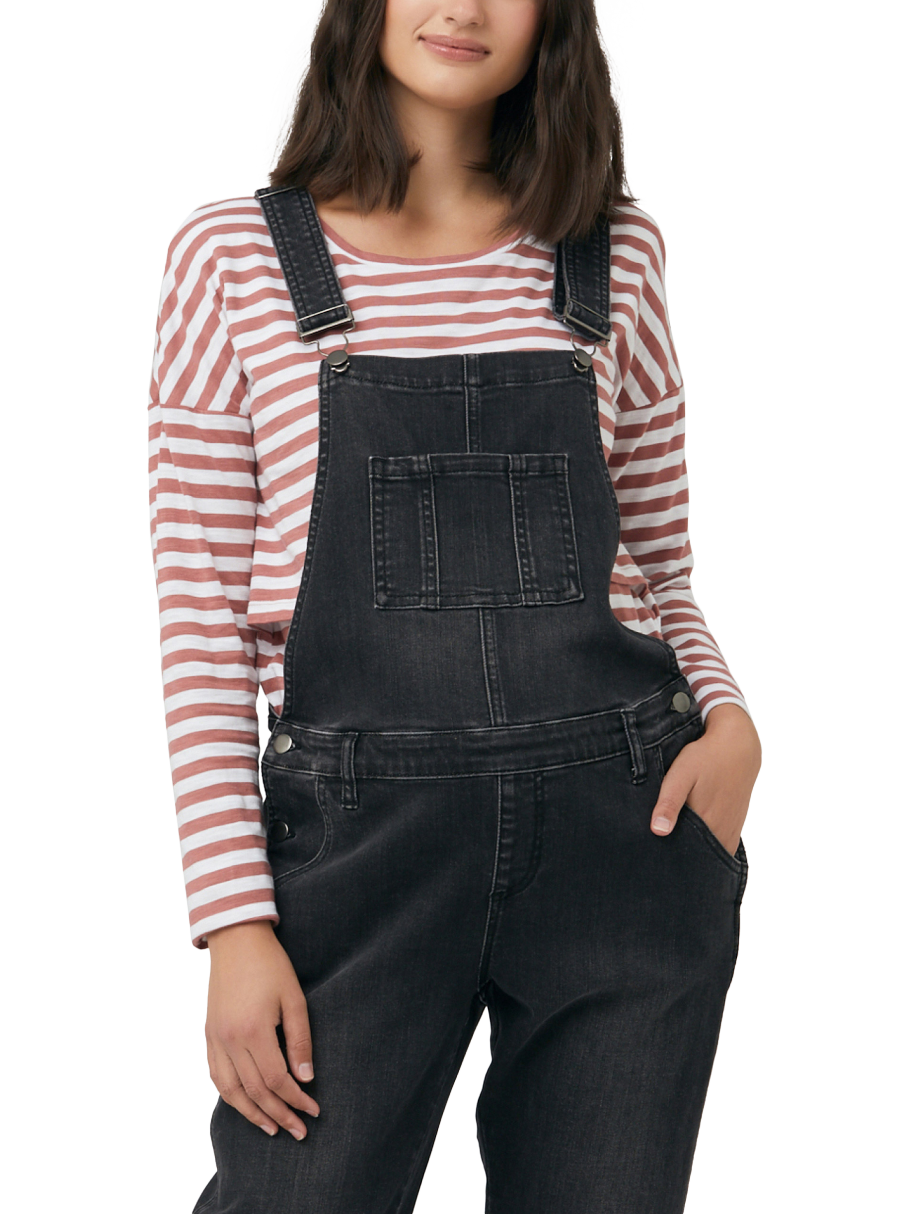 The ultimate maternity wardrobe must have. These maternity denim dungarees can be layered over any top to give you a new fresh look each and every time you wear them. Featuring a vintage wash, bronze trims, and adjustable side waist button system to expand as your belly grows. You will want to wear them forever.