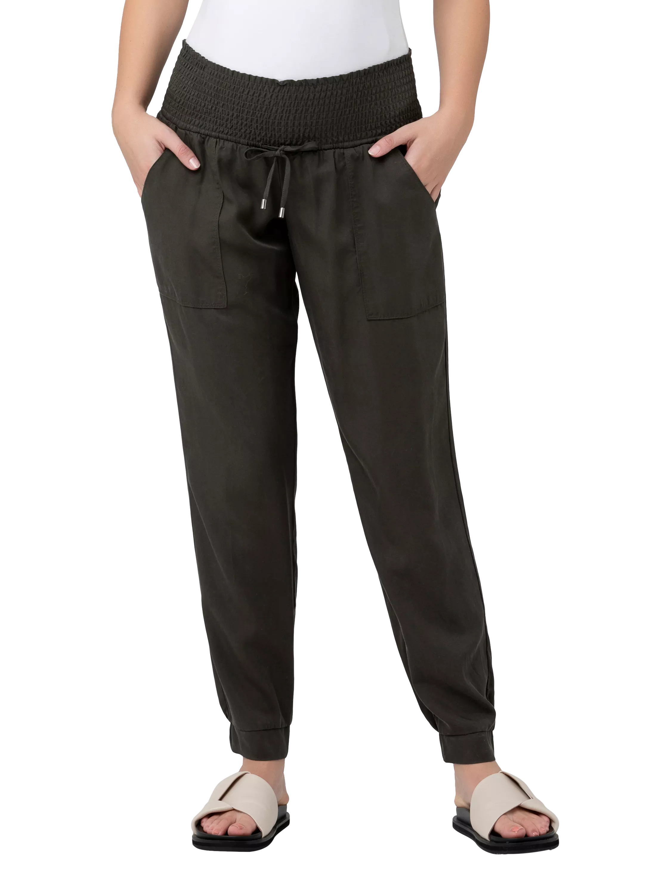 Transition from season to season in the Off Duty Maternity Pant. These soft, relaxed-fit trouser is the perfect style to be dressed up or down and still have you feeling comfortable all day long. These trousers have pockets, a stretchy shirred waistband and are cuffed at the ankle for ultimate style.